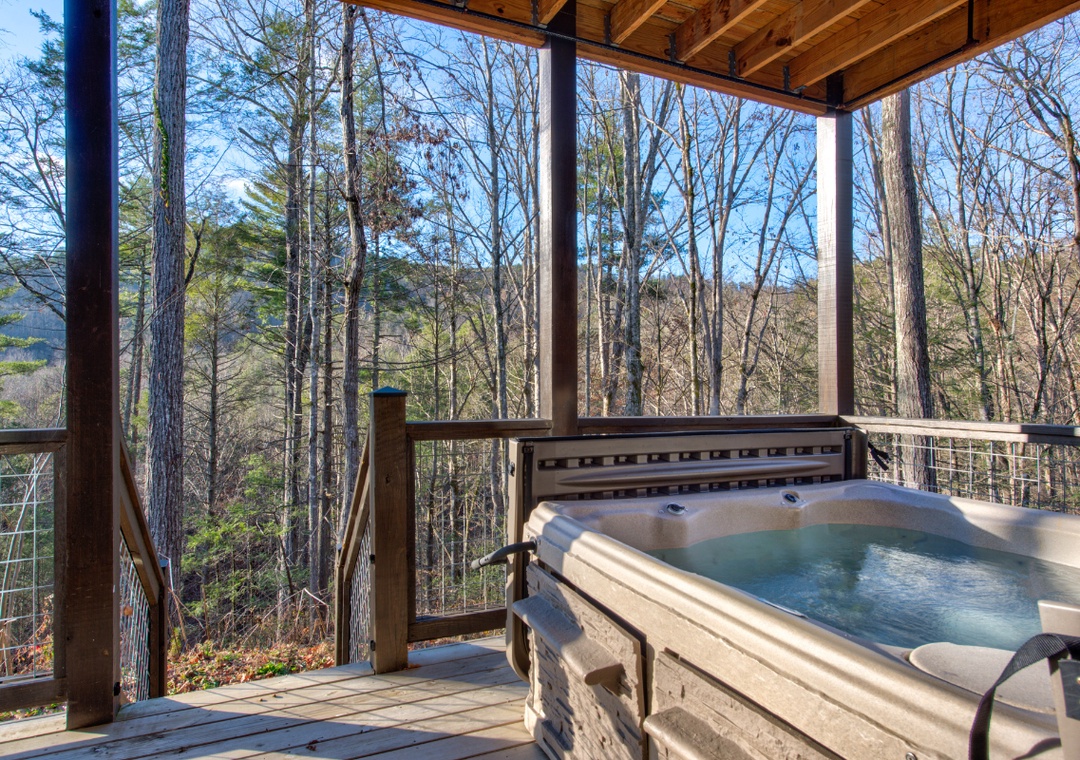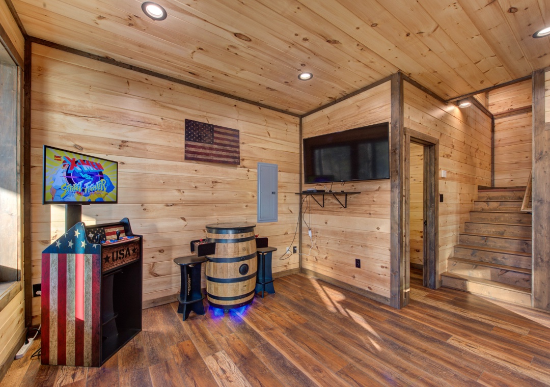 Downstairs is where the fun really begins. The lower level of Bearfoot Splash Hideaway is designed for excitement and relaxation alike. Step into the game room, where you’ll find a multicade arcade and a fighting arcade offering hours of entertainment for both kids and adults. Challenge your friends to high scores or simply enjoy the nostalgic fun of classic arcade games in your own private cabin. Just steps away from the game room, find your very own private heated indoor pool. No matter the season or weather, you can splash and relax in the warmth of your personal pool area. Whether you’re floating in the water, watching the kids play, or simply soaking in the peaceful atmosphere, this feature makes your stay truly unforgettable. When you’re ready to unwind, step out onto the main-level back deck to enjoy the firelight from the outdoor fireplace, making your nights truly magical. On the lower-level back deck, a bubbling hot tub awaits where you can slip into the warm water, feel your muscles relax, and let the sounds of nature melt away your stress. There’s nothing quite like soaking in the hot tub under a canopy of stars after a long day of exploring the Smoky Mountains.