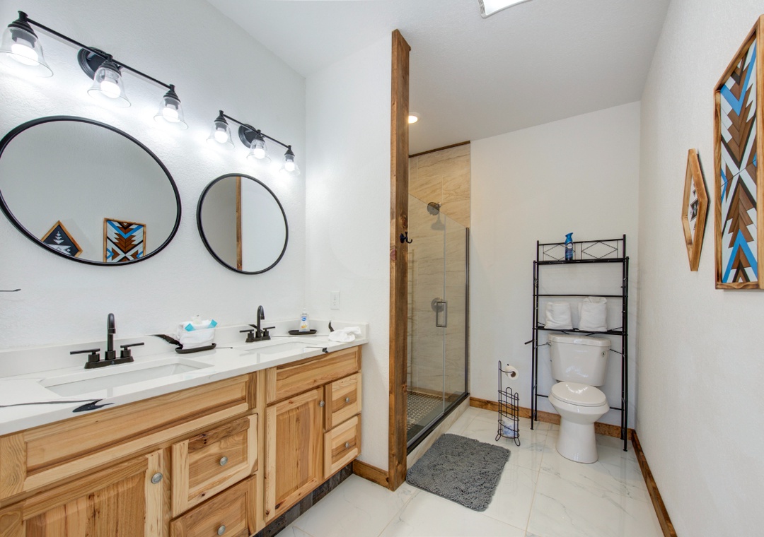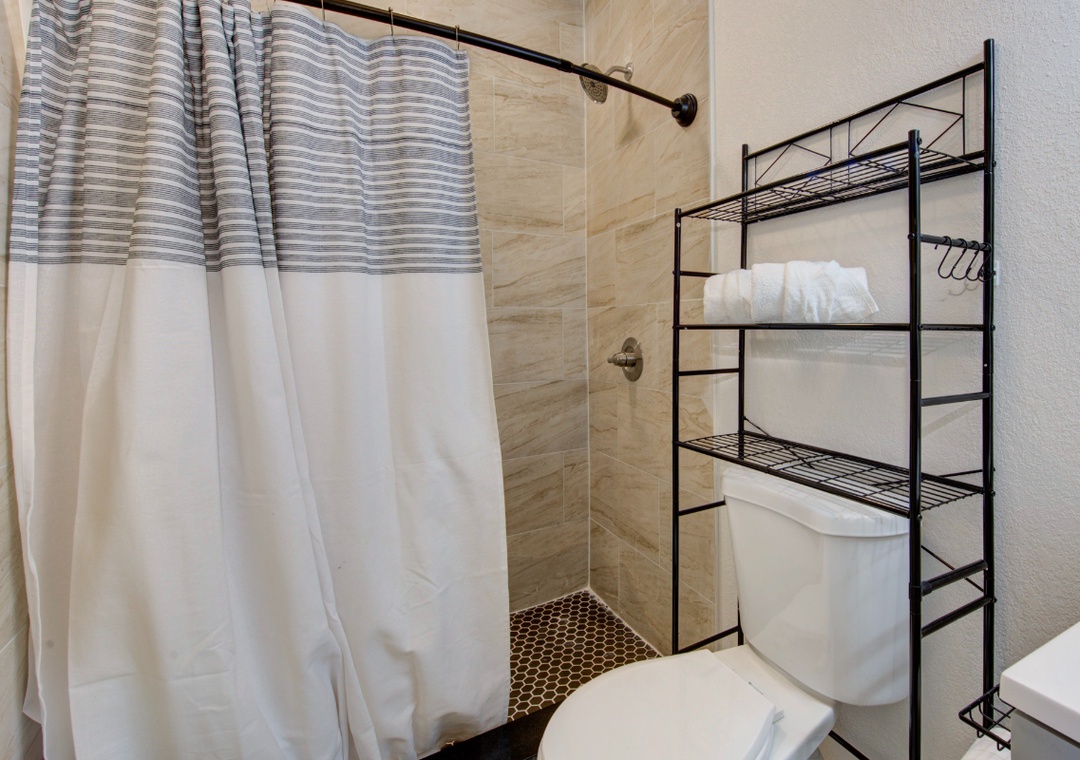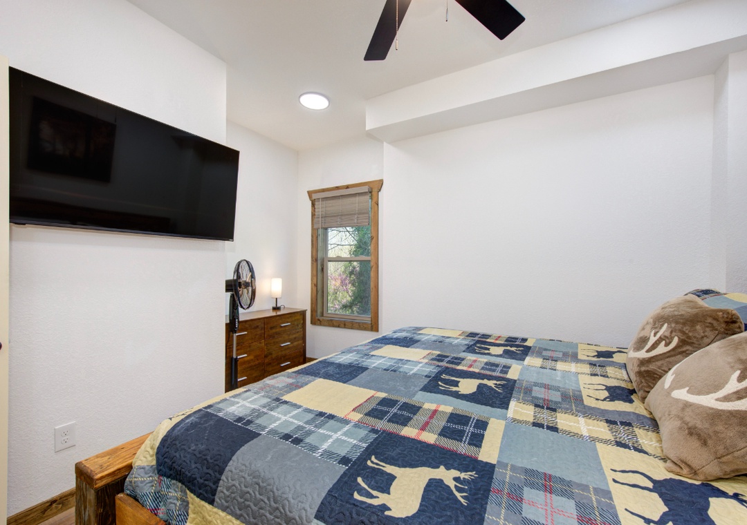 ✔ Bedroom #2 (Lower Level): Comfy Bedroom with a King-sized Bed and a Flat-screen TV; Attached Full Bathroom with Stand Up Shower