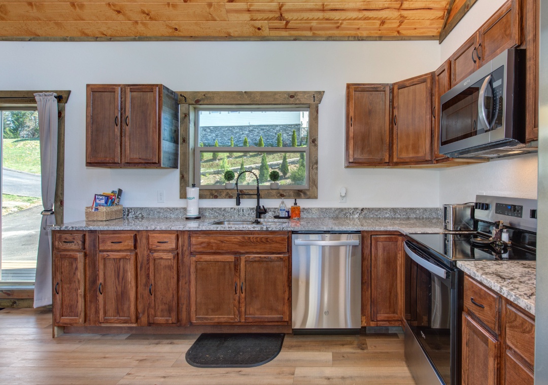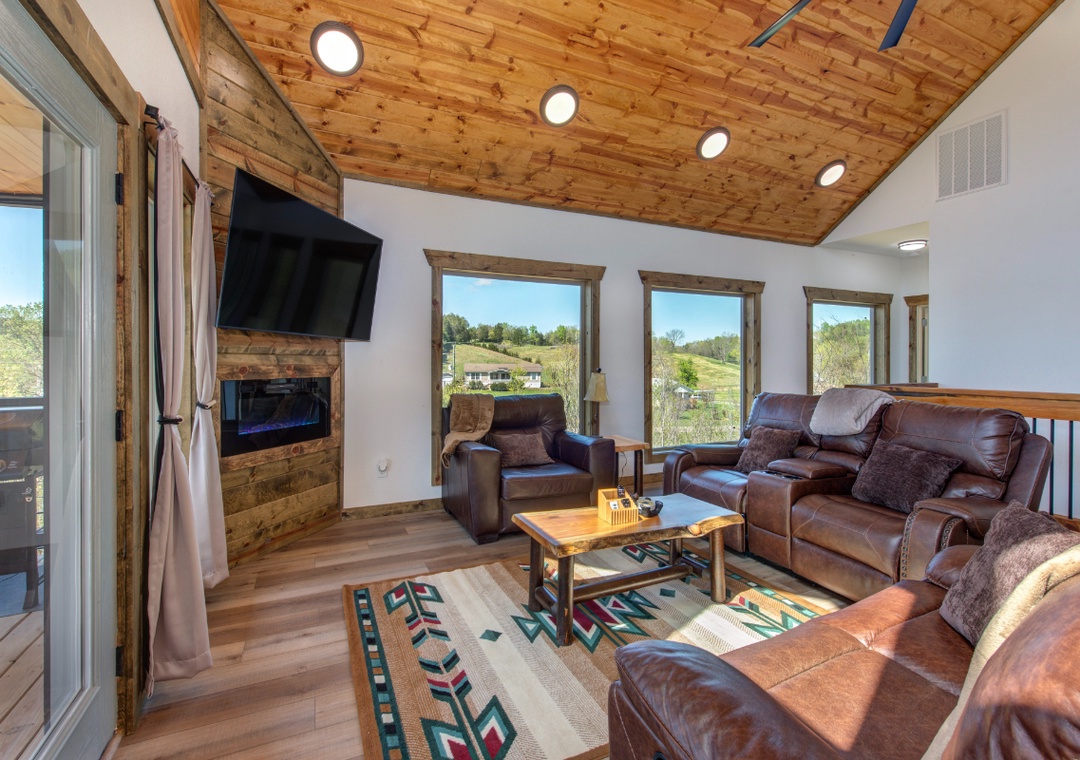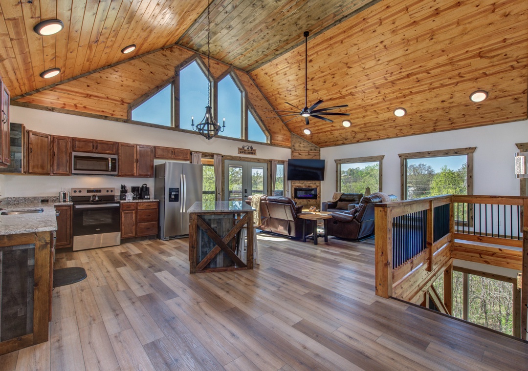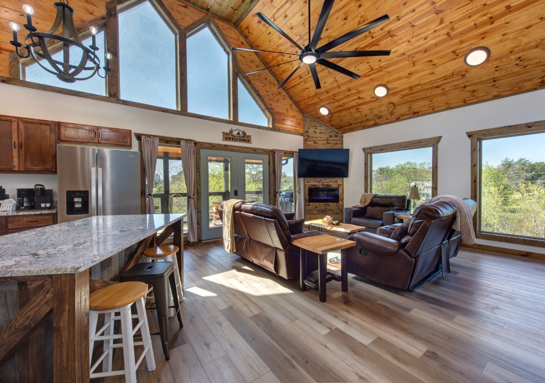 Step inside and you’re immediately greeted by the inviting glow of the main-level living room. Towering ceilings and oversized windows frame the beauty of the forest outside, while natural light floods the room, giving it an open, airy feel. The living area is centered around an electric fireplace that provides the perfect cozy ambiance on crisp mountain mornings or cool evenings. Just beyond the living room, the fully equipped kitchen opens into the space, creating a seamless flow for entertaining or spending time together. Downstairs, the cabin takes indoor entertainment to the next level. The expansive game room is a favorite feature, offering a second cozy hangout space anchored by another electric fireplace and a 65” Vizio Smart TV. Also, find each of the three bedrooms that offer a comfortable retreat at the end of the day with a peaceful atmosphere that helps you unwind and rest deeply. Free WiFi is also available throughout the property.