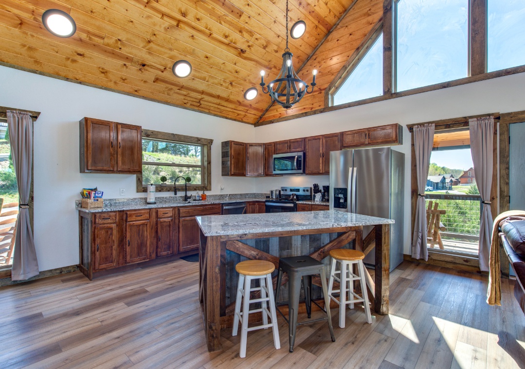 The fully-equipped kitchen boasts modern amenities, making it easy to prepare delicious meals for your family or friends. Well-appointed with a full-sized refrigerator, dishwasher, stove, microwave, and other kitchen appliances perfect for making breakfast, lunch, or dinner throughout your stay! All pots, pans, glasses, plates, silverware, etc., are also there for you! Gather around the inviting dining table or the breakfast bar to share stories and laughter, as it invites you to savor each bite while taking in the natural beauty of the surroundings.