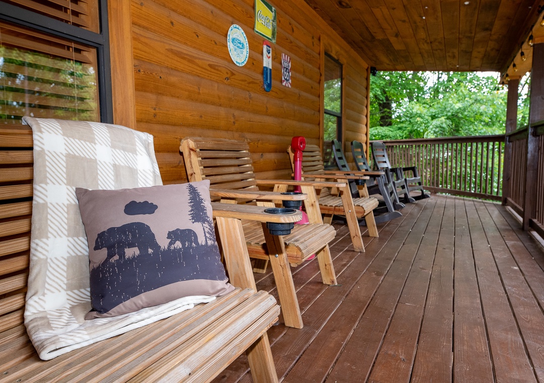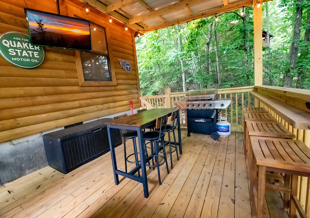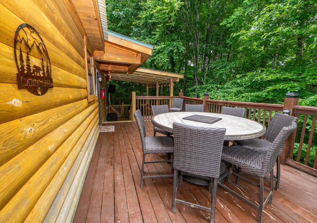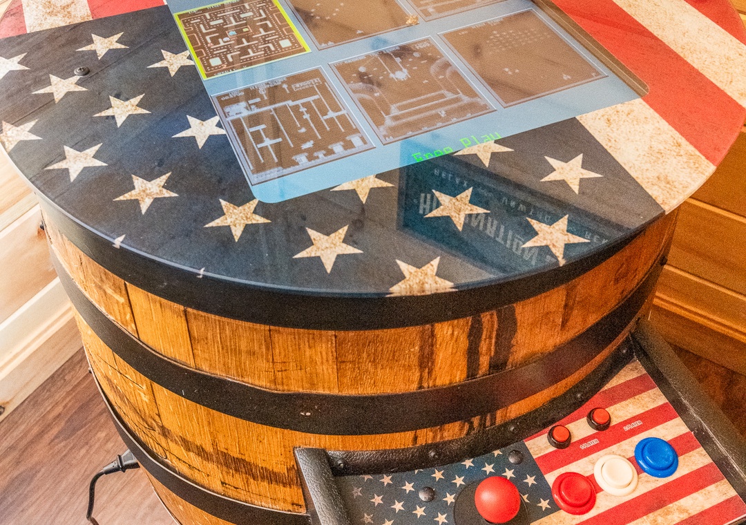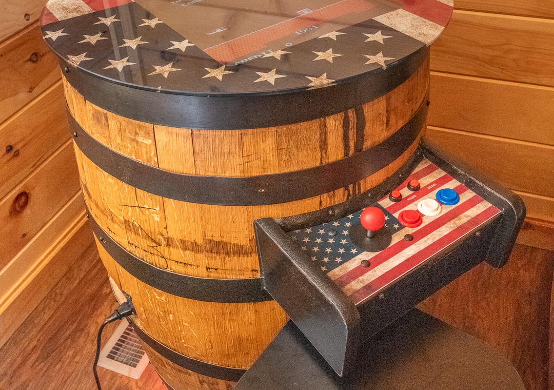 Step outside onto the expansive deck, where the entertainment options are endless. Start your day with a friendly game of Corn Hole, enjoying some friendly competition as you soak in the fresh mountain air. As the sun sets, gather around the fire pit to share stories and roast marshmallows under the starlit sky, creating the perfect setting for memorable evenings. For those who enjoy outdoor cooking, the modern gas grill stands ready to assist you in preparing delicious meals. Enjoy your culinary creations at the al fresco dining area, where you can savor your food while being surrounded by the sights and sounds of nature. Inside, challenge your friends and family to a round of classic arcade games, bringing back nostalgic memories and creating new ones. The arcade system promises hours of fun and excitement, perfect for rainy days or evenings spent indoors. Then after a day of adventure, unwind in the private hot tub, where bubbling waters and serene surroundings provide the ultimate relaxation experience. Whether you're soaking tired muscles after a hike or simply enjoying a quiet moment of tranquility, the hot tub is a fine treat!