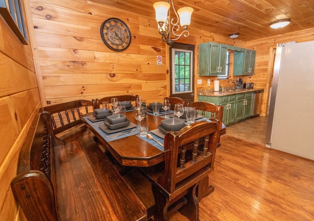 The spacious living area is the heart of the cabin. Sink into the plush sofas and enjoy the warmth as you relax with a good book or share stories with loved ones. Adjacent to the living room is a fully-equipped kitchen, where modern appliances and ample counter space make meal preparation a joy. Whether you’re whipping up a quick breakfast or preparing a feast for a special dinner, the kitchen has everything you need. The dining area, with its rustic wooden table, provides a charming setting for enjoying meals together. Also find three beautifully appointed bedrooms, each designed to be a sanctuary of comfort and tranquility. Free WiFi is also available throughout the property.