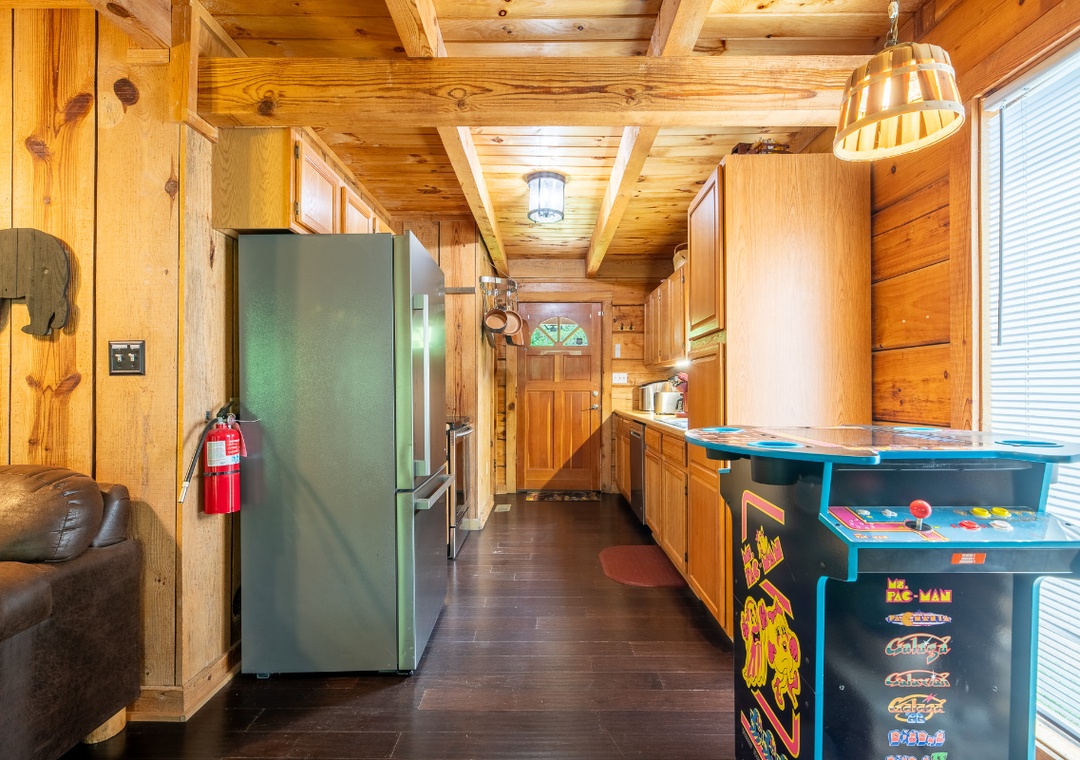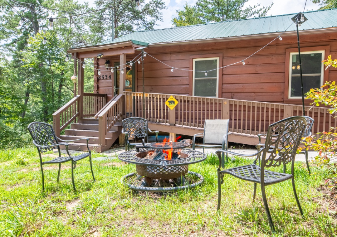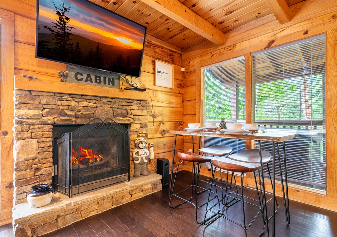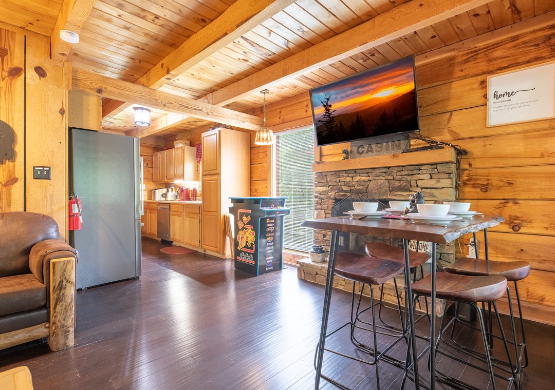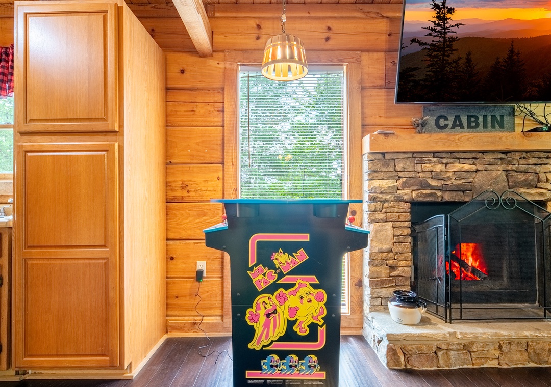 Inside, the living room is a warm and inviting hub for relaxation, featuring a propane fireplace that sets the perfect atmosphere for movie nights or game time. A Smart TV with a DVD player and sound bar ensures you can stream your favorite shows, watch classic movies, or enjoy a full cinematic experience without ever leaving the comfort of the cabin. For an added dose of fun, the living room also boasts a classic arcade game. Step outside onto the private back deck and you’ll find a bubbling hot tub that’s perfect for unwinding under the stars after a day of adventure. There’s also a propane grill for outdoor cooking, so you can turn mealtime into a social event while taking in the beautiful wooded views. In front of the property, a wood-burning firepit awaits, ideal for roasting marshmallows, telling stories, and enjoying the magic of a Smoky Mountain evening. You’re also just 20 minutes from the vibrant attractions of Pigeon Forge, where you can enjoy dinner shows, mini golf, arcades, shopping, and family-friendly theme parks. After a day of adventure, you can return to the comfort of Beary Cozy Cabin to keep the fun going with a relaxing hot tub soak or another round of movies and popcorn.