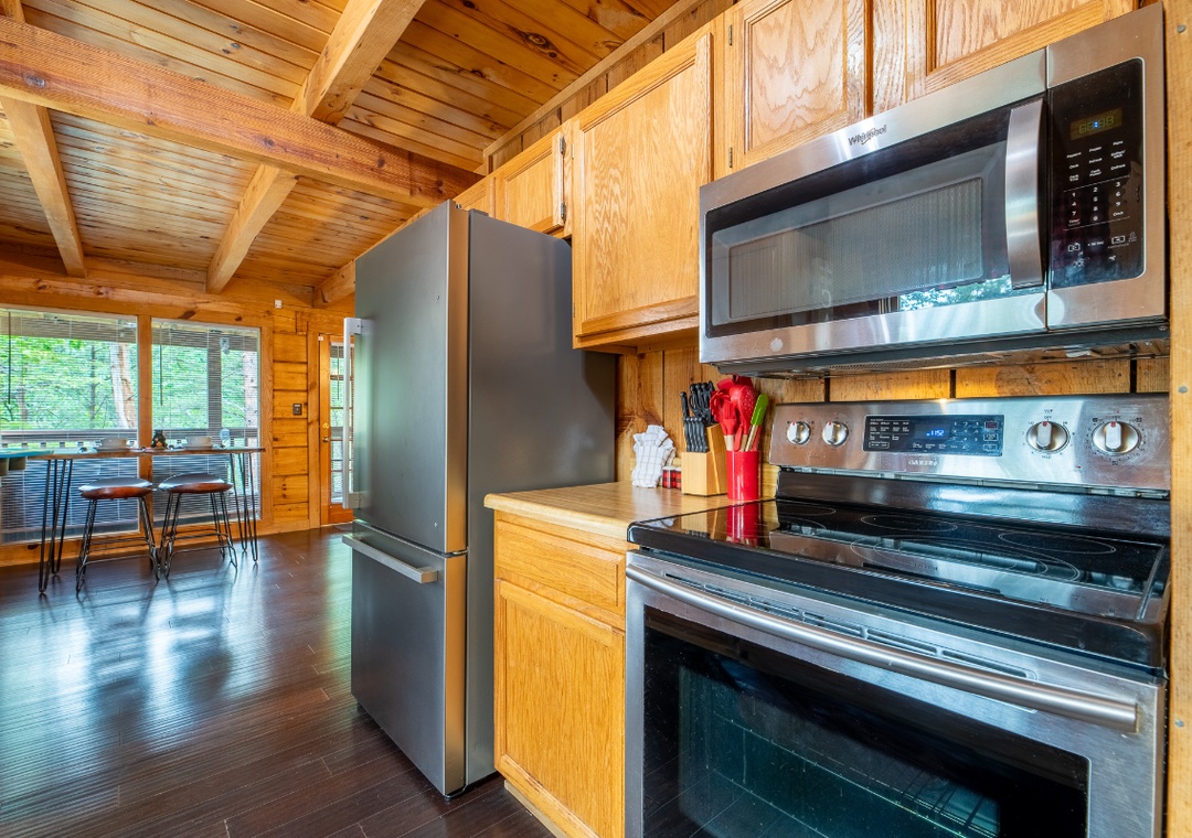 The compact, fully-equipped kitchen boasts modern amenities, making it easy to prepare delicious meals for your family or friends. Well-appointed with a refrigerator, stove, microwave, and other kitchen appliances, perfect for making breakfast, lunch, or dinner throughout your stay! All pots, pans, glasses, plates, silverware, etc., are also there for you! Gather around the dining table to share stories and laughter, as it invites you to savor each bite while taking in the natural beauty of the surroundings.
