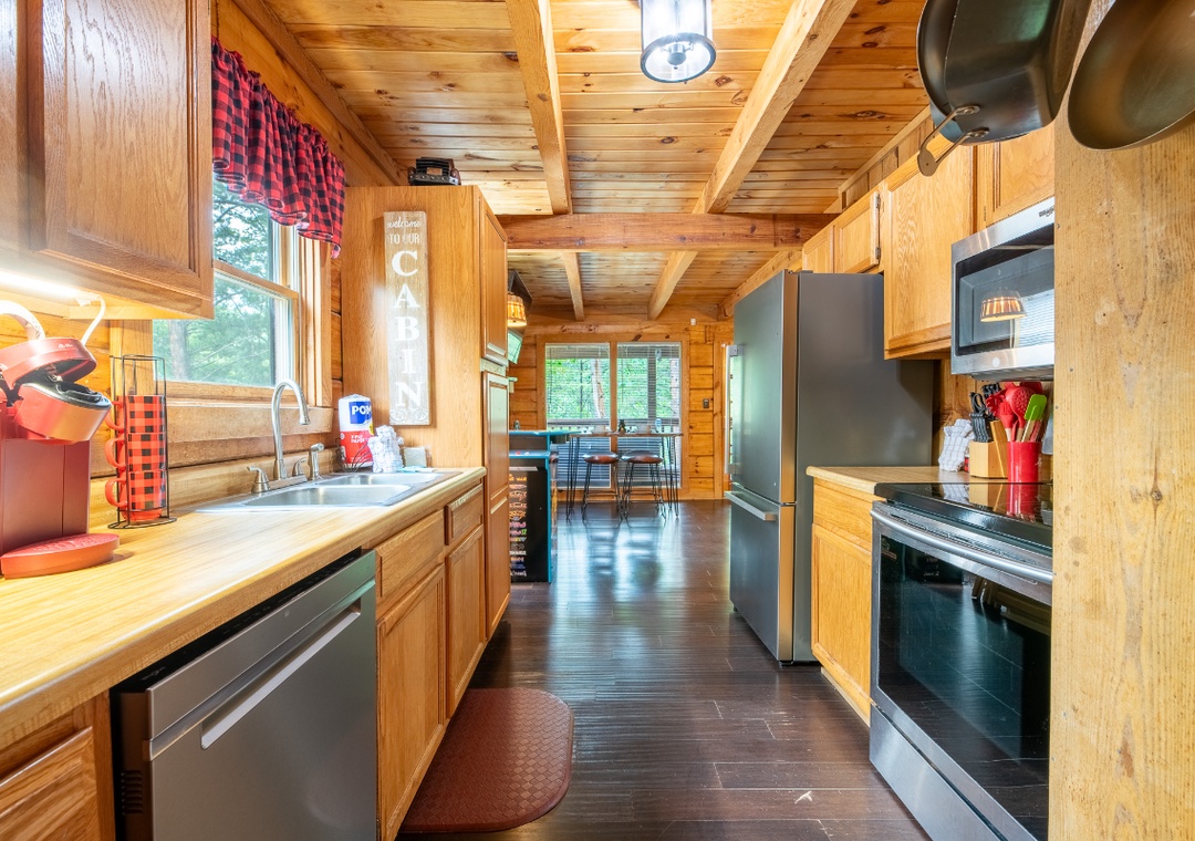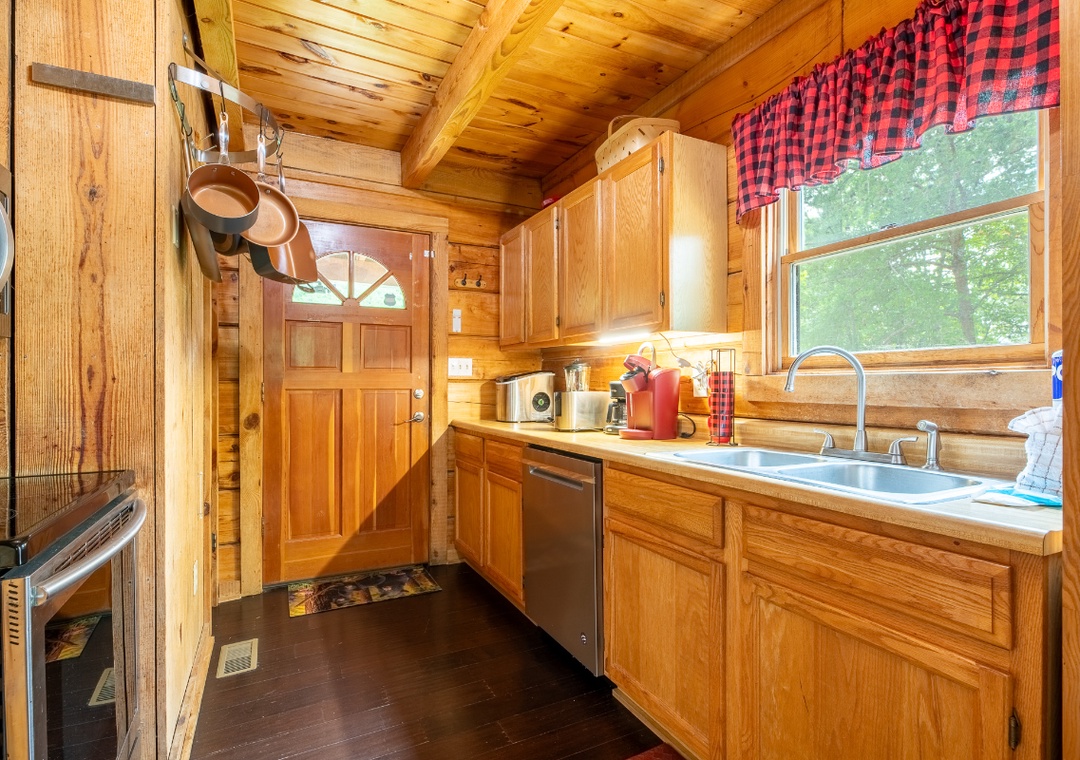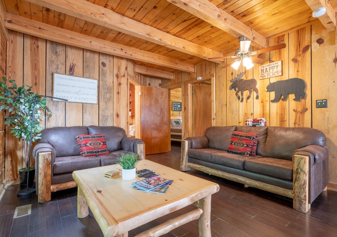 The heart of the cabin is its comfortable living room, where a propane fireplace casts a warm glow and invites you to curl up with a blanket on chilly evenings. A Smart TV with a DVD player and sound bar ensures you can enjoy movie nights, stream your favorite shows, or revisit classic films. The open layout connects the living space to a functional galley kitchen, fully equipped with the essentials for preparing home-cooked meals. Also find the two comfy bedrooms that are just as inviting. Each room is designed to feel comfortable and uncluttered, allowing you to truly unwind. Free WiFi is also available throughout the property.