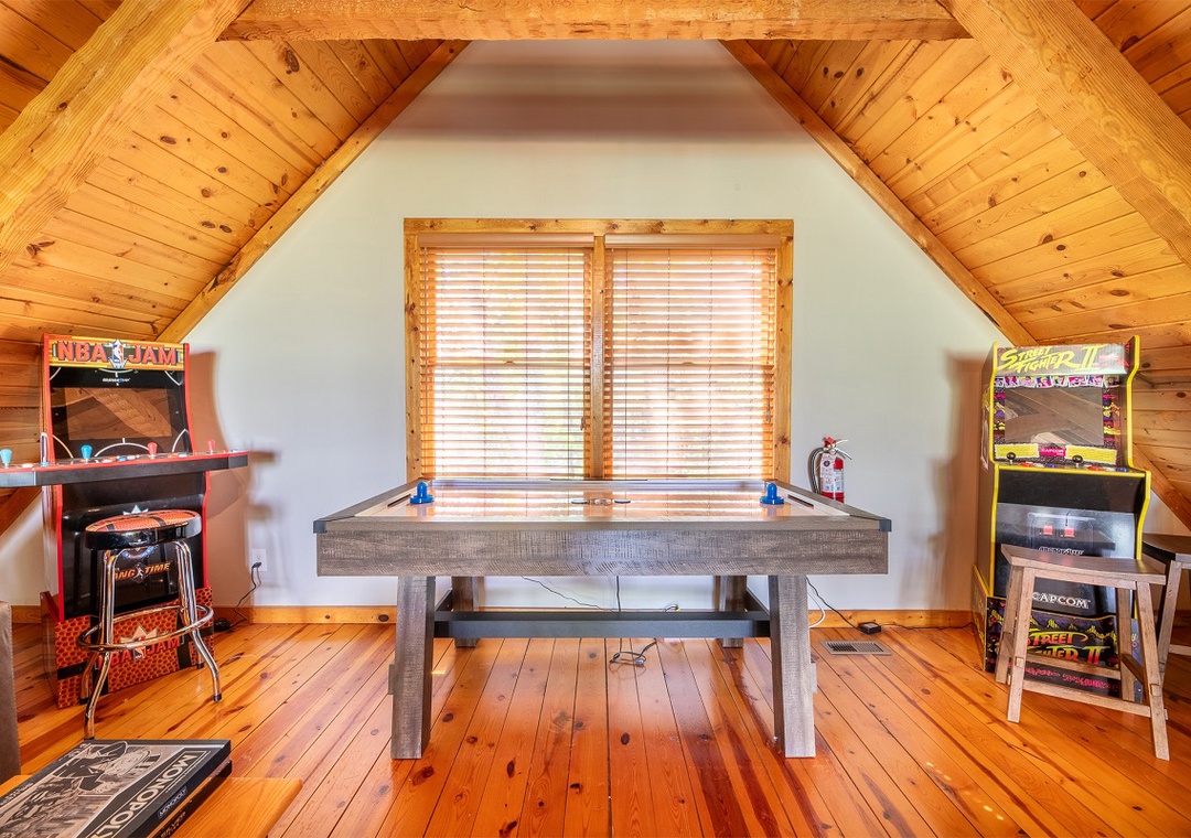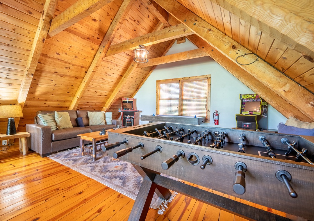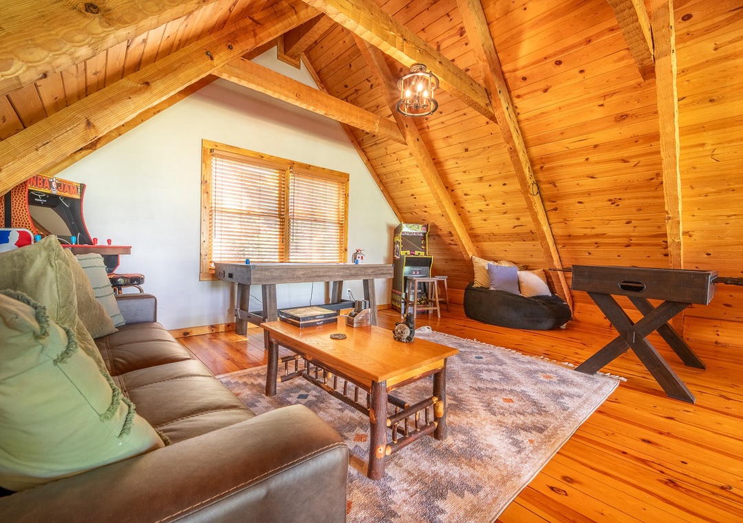 Step inside and be greeted by the expansive open-concept main level, where the living room’s wood-burning fireplace sets the stage for cozy evenings. This space is ideal for unwinding after an active day or enjoying a movie night with loved ones. Downstairs, the fun continues with a second entertaining space featuring a propane fireplace that adds a warm, inviting glow. The real highlight for entertainment enthusiasts is the loft area, where you’ll find an exciting arcade setup that will provide hours of fun for guests of all ages. For outdoor fun, the back deck on the lower level is equipped with a private hot tub. This is the perfect spot to relax and unwind after a day of activities, soaking in the soothing bubbles while enjoying stunning 180-degree views of Wears Valley. Additionally, the outdoor space features a wood firepit, where you can gather around for an evening of storytelling, roasting marshmallows, and stargazing. The crackling fire and the serene mountain backdrop create the ideal setting for memorable nights under the stars. During the warmer months, you can also enjoy paid access to a public seasonal community pool, typically open from Memorial Day weekend to Labor Day, weather permitting. Whether you're looking to swim laps, play with the kids, or simply relax on a lounge chair, the pool area offers something for everyone.
