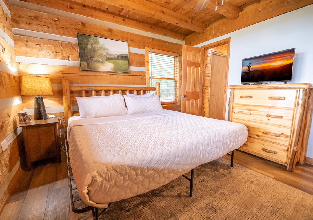 ✔ Bedroom #1 (Main Level): Spacious Bedroom with a King-sized Bed and Flat-screen TV, Access to a Full Bathroom with Shower/Tub Combo