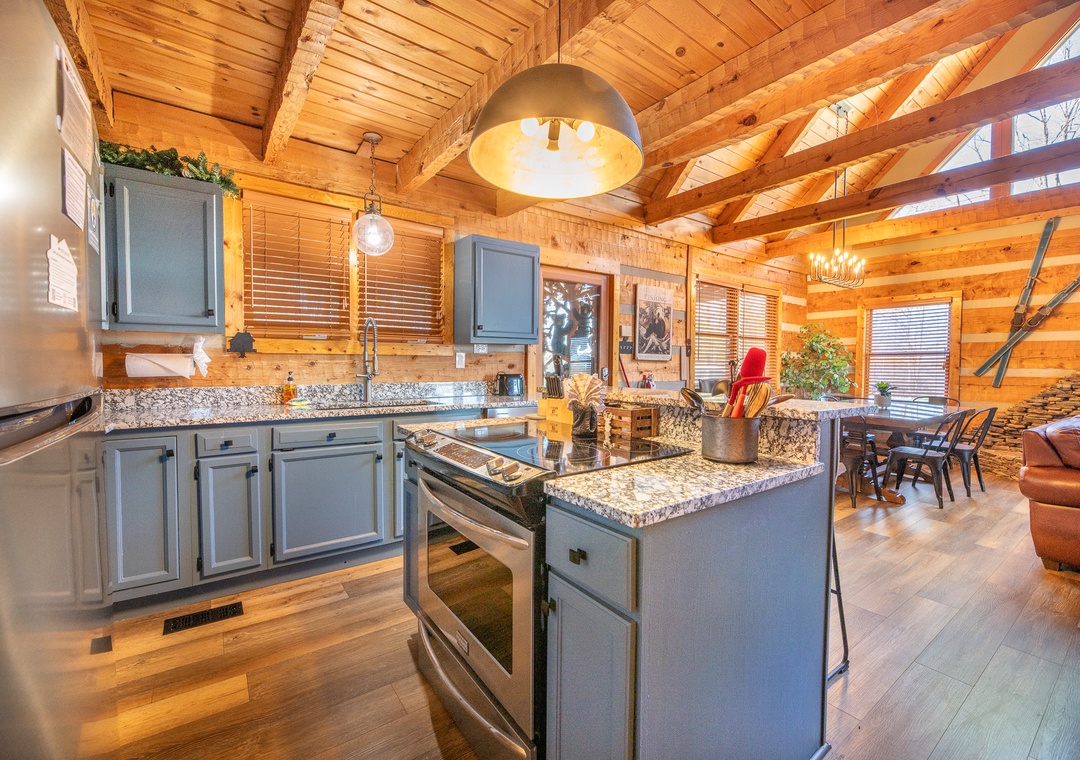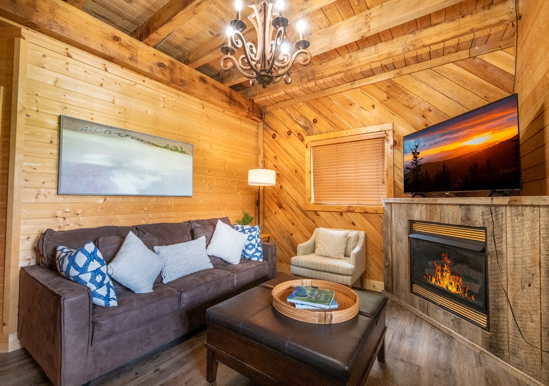 As you step inside, you’re immediately welcomed by the warmth of the main level’s open-concept living area. The heart of this space is the inviting wood-burning fireplace, which sets the tone for cozy evenings spent relaxing with family and friends. Connected to the living room is a fully equipped kitchen, where modern appliances and ample counter space make meal preparation a breeze. Downstairs, you’ll find a second living area that’s perfect for entertainment and relaxation. This cozy space features a propane fireplace, adding a touch of warmth and ambiance. The upper loft area provides an additional gathering space, designed with fun and relaxation in mind. The loft is home to arcade games that will delight both kids and adults, making it a perfect spot for some friendly competition. Free WiFi is also available throughout the property.
