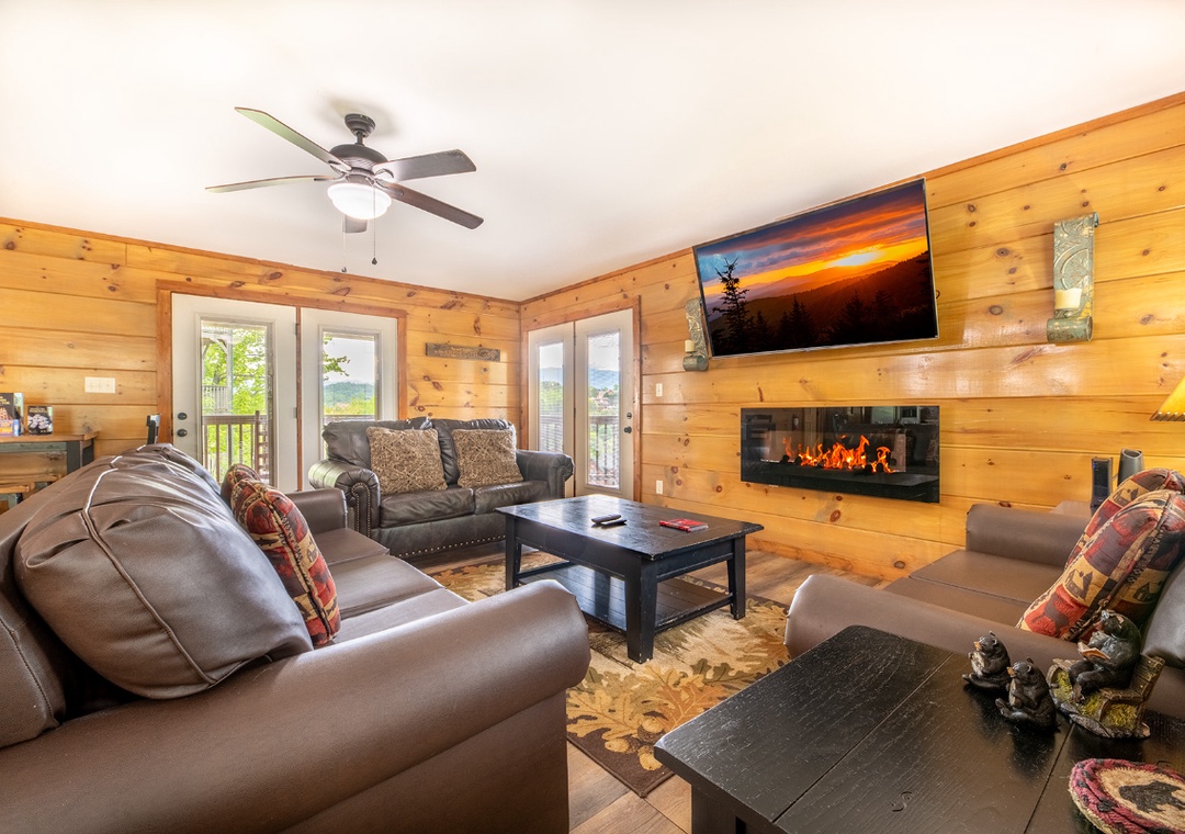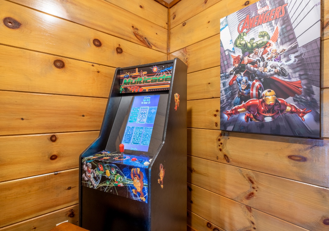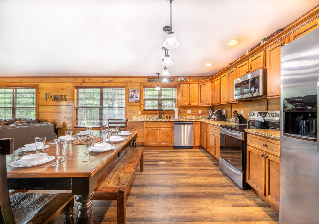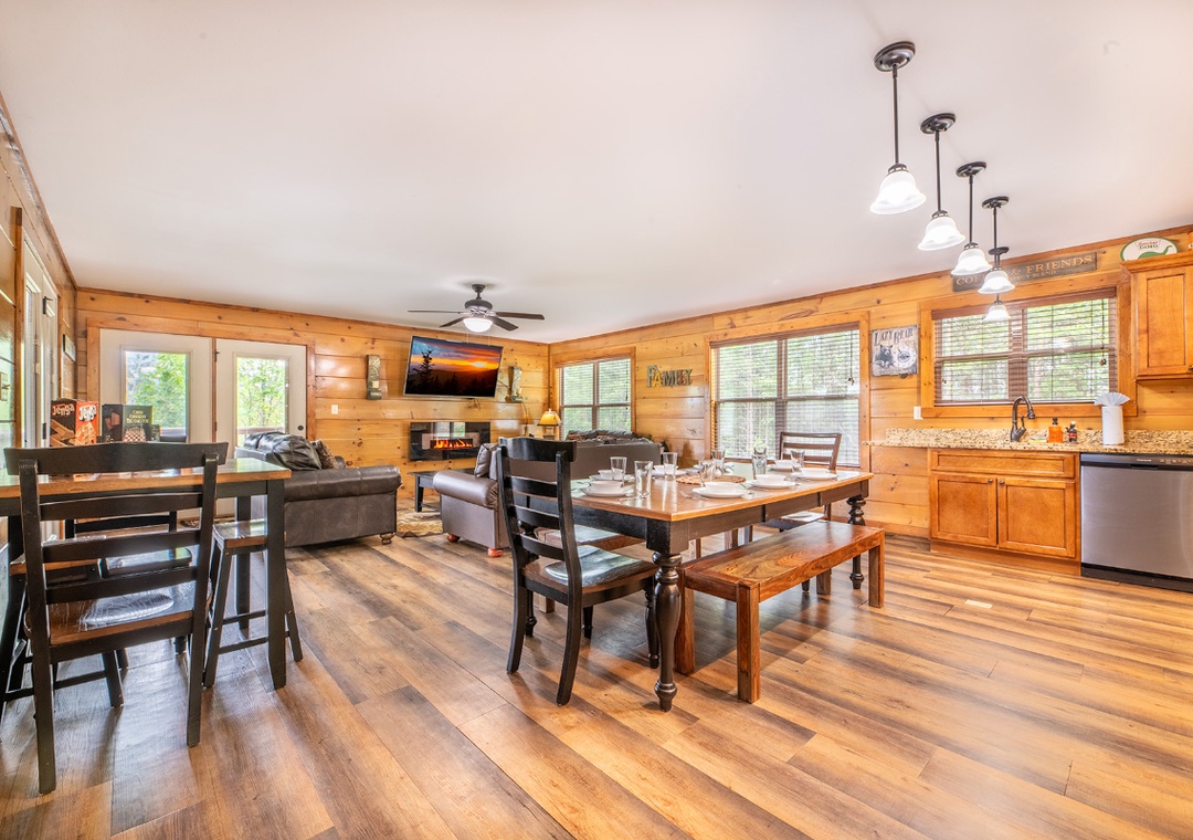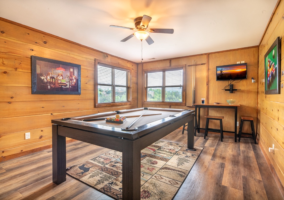 The main living area is the heart of the cabin. It’s a large, open-concept space that invites you to gather, lounge, and unwind. Sink into plush seating as the electric fireplace glows softly beneath the massive 65" TV, creating the perfect setting for movie marathons, game day viewing, or simply catching up with loved ones. Adjacent to the living room, the cabin’s fully equipped kitchen and dining area offer everything you need to whip up a hearty breakfast or a home-cooked dinner. Upstairs, find the game area that’s sure to be the favorite among guests of all ages. Also, find each of the four bedrooms that are thoughtfully designed to give you and your loved ones a private retreat after a day of fun. Free WiFi is also available throughout the property.