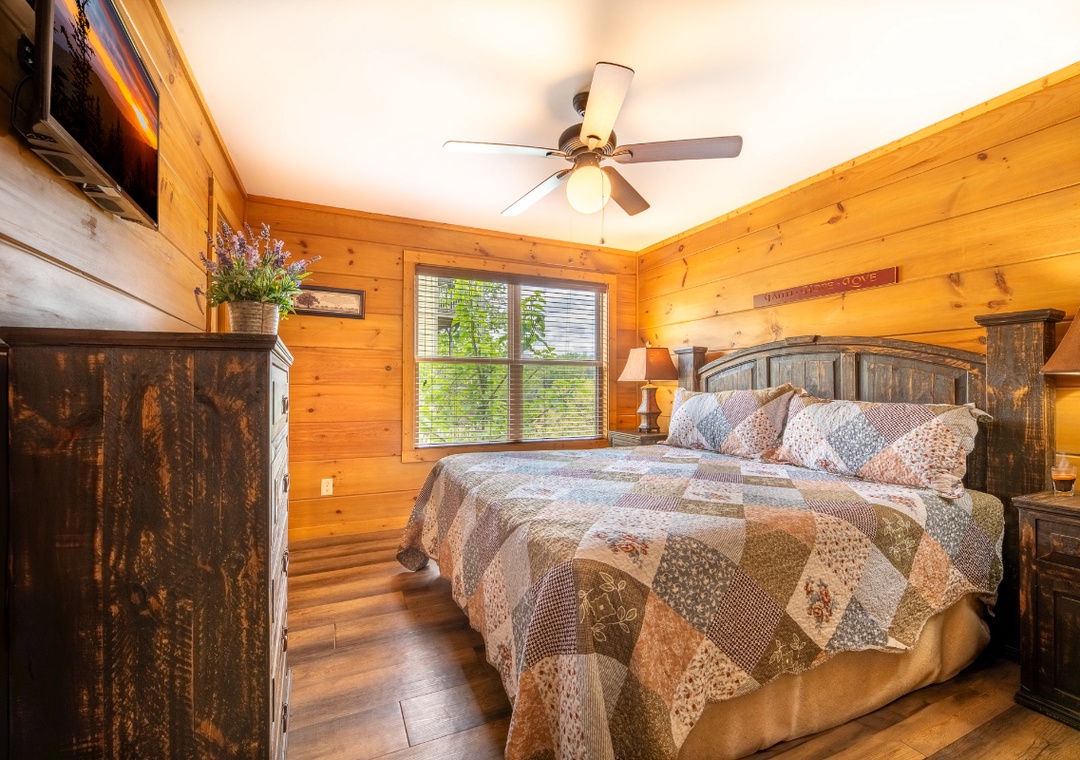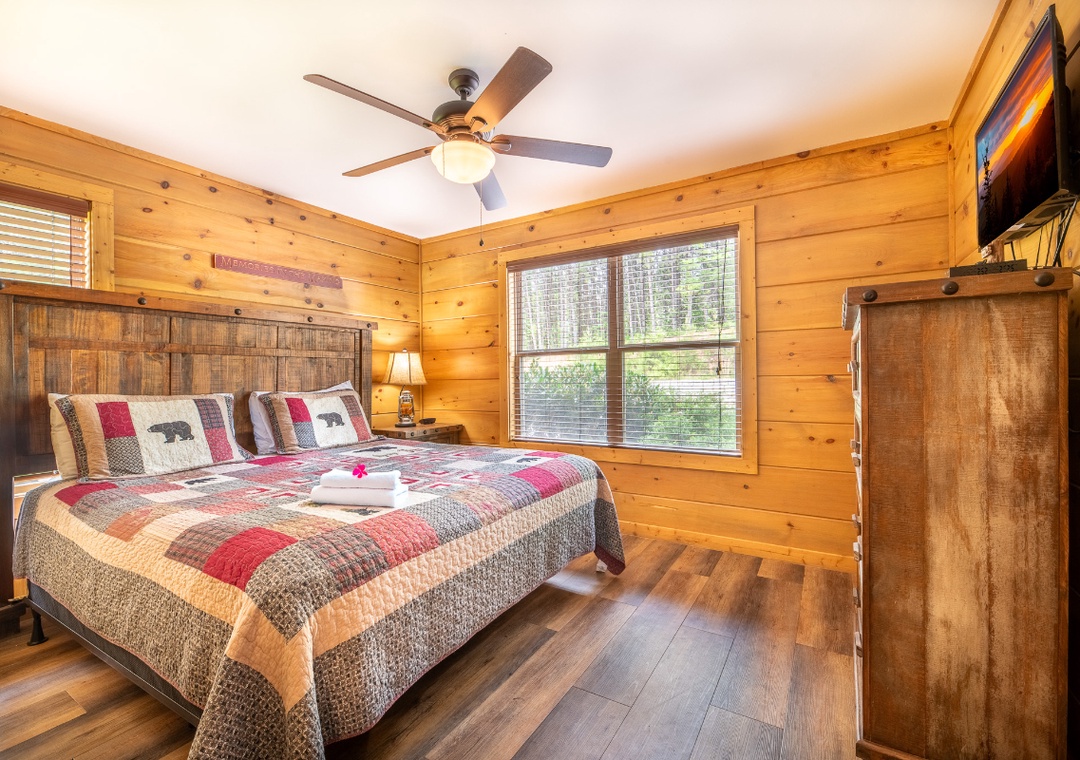 ✔ Bedroom #1 (Main Level): Cozy Bedroom with a King-sized Bed and a Flat-screen TV; Attached Full Bathroom with Shower/Tub Combo