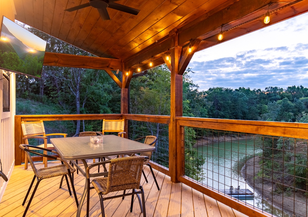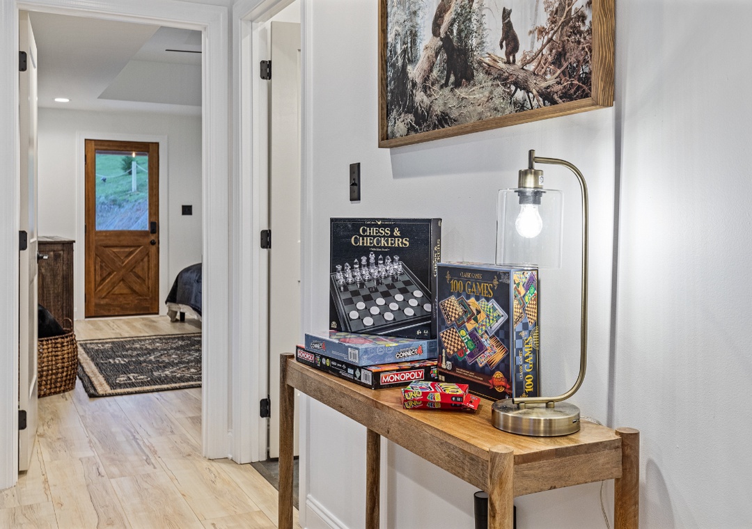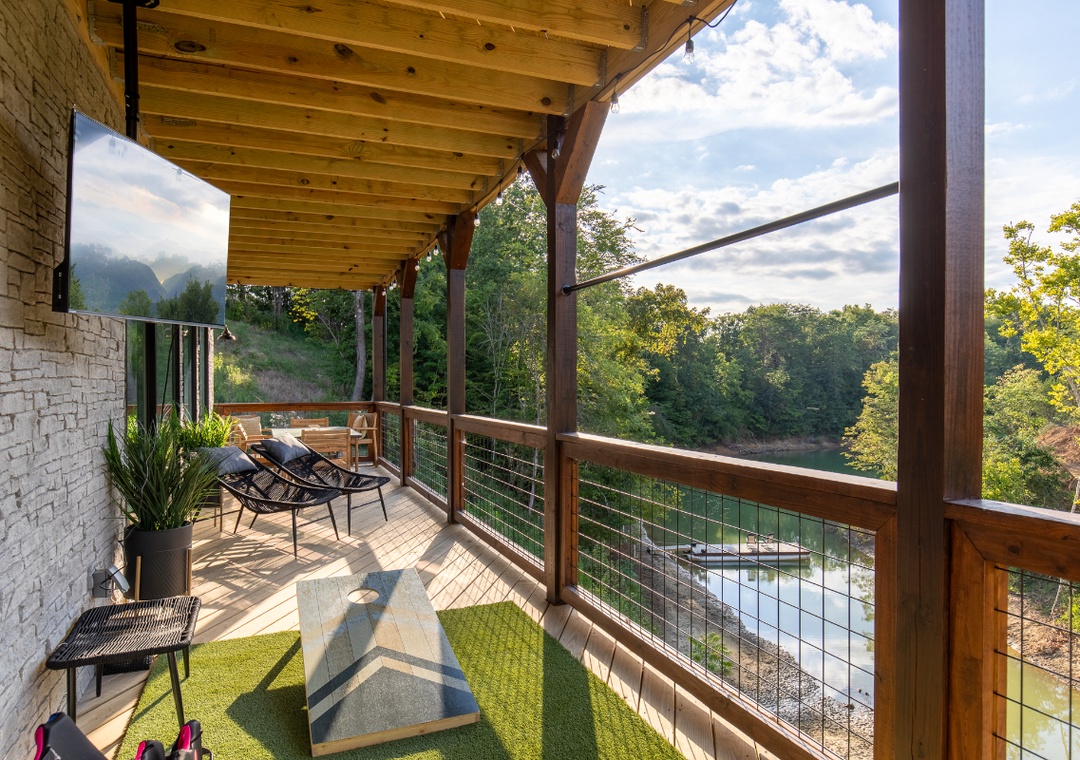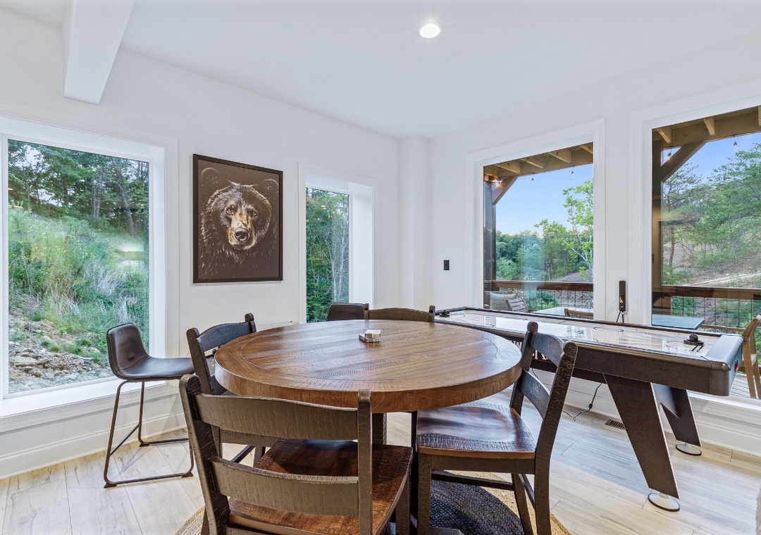 Perfectly situated on the side of a cove, our lodge is packed with amenities that will keep everyone entertained from sunrise to sunset. Start with the park-style grill, ideal for cooking up a feast while enjoying the fresh mountain air. On one of the specious decks, find a game of cornhole where you can challenge your friends and family to matches while soaking in the scenic views. Behind the lodge, you'll find a wood firepit, the perfect spot to gather in the evening. Picture yourself roasting marshmallows, telling stories, and enjoying the crackling fire under a canopy of stars. Inside, our lodge also features an arcade and an air hockey table ensuring that there’s never a dull moment during your stay. For those who prefer a bit of relaxation, the cabin also boasts a luxurious hot tub – a perfect spot for stargazing or simply relaxing in the warm bubbles. Outdoor enthusiasts will love the lodge's access to a nearby lake, where two kayaks are available for guests to use. Paddle along the serene waters and explore the natural beauty of the area. However, keep in mind that the lake is only full from May to September, making it a seasonal treat that adds a special touch to your summer stay.
