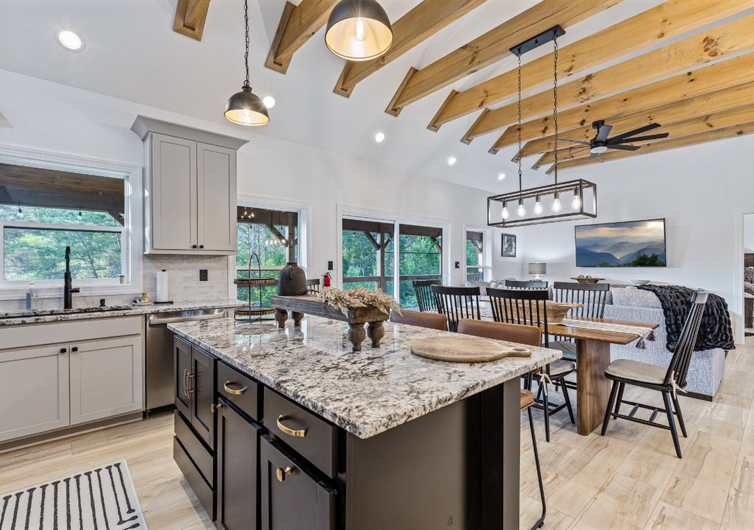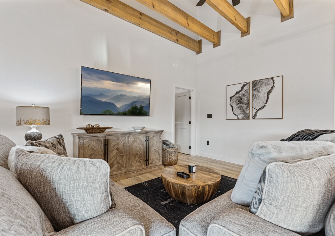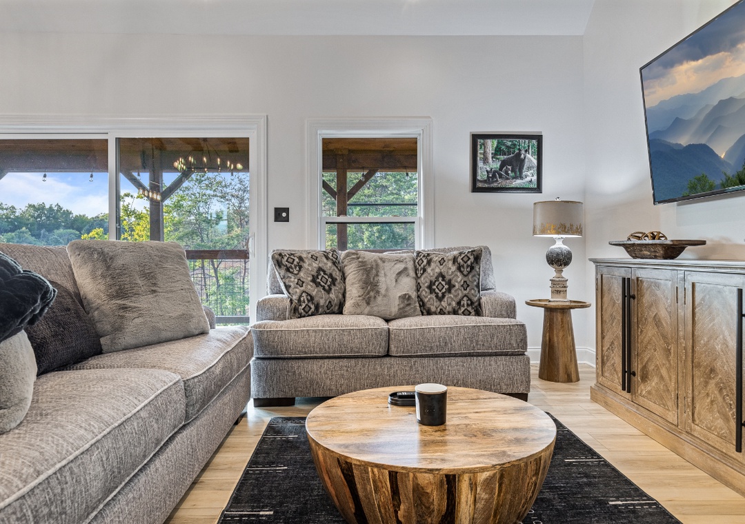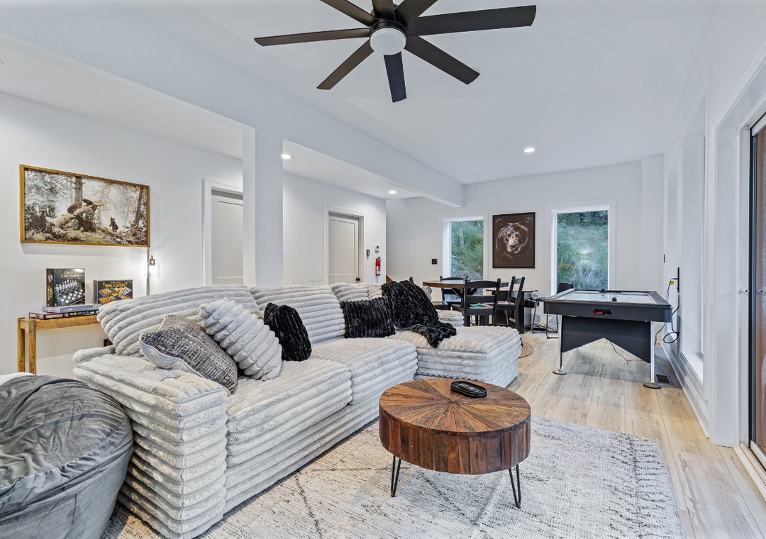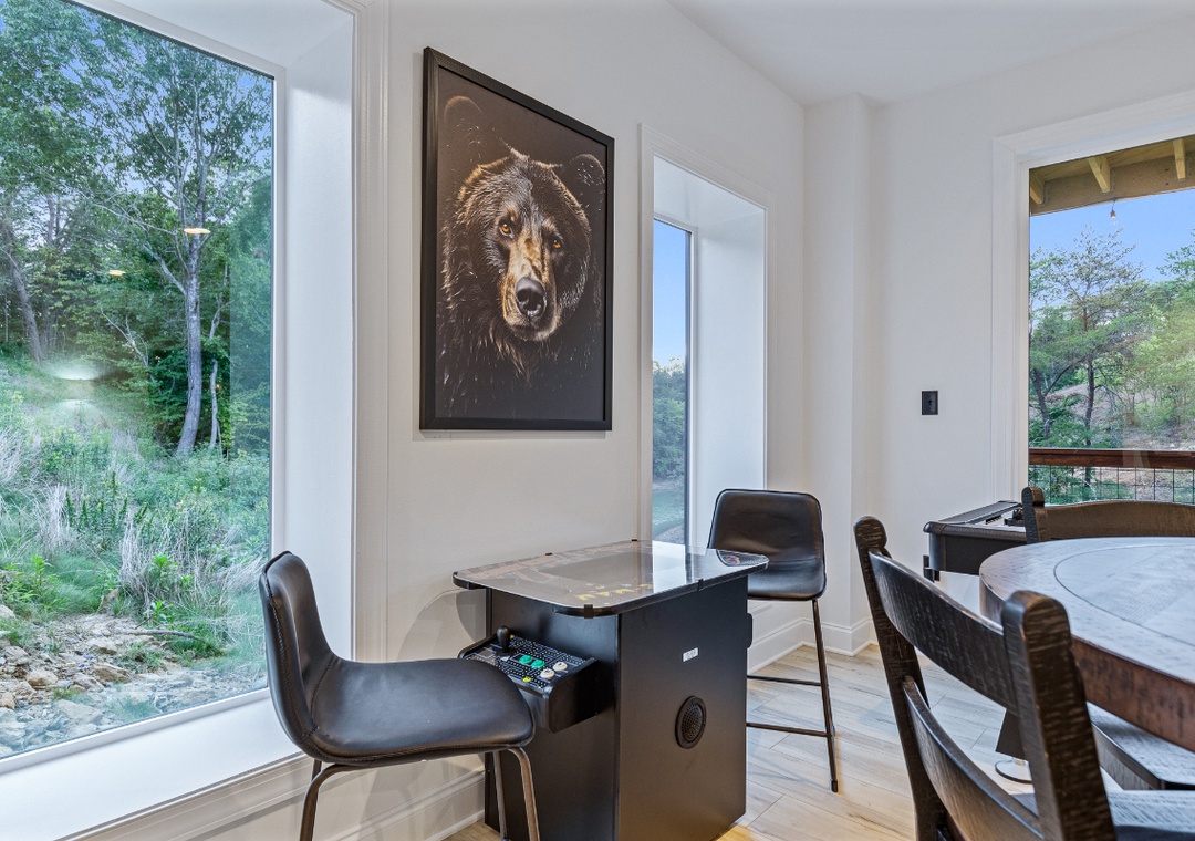 Step inside, and you’ll be welcomed by a warm and inviting living space. The heart of the cabin is the spacious living room where you can sink into plush sofas making it an ideal spot for cozy evenings with family and friends. Large windows frame the breathtaking cove views, allowing you to enjoy the beauty of the Smokies from the comfort of the indoors. The open-concept design seamlessly connects the living area to a fully equipped kitchen and dining space, where you can prepare hearty meals with ease. The cabin also boasts an arcade filled with classic games, providing hours of fun for guests of all ages. There’s also an air hockey table that offers another exciting way to spend time indoors. Free WiFi is also available throughout the property.