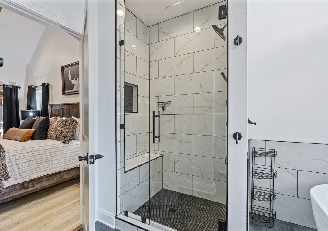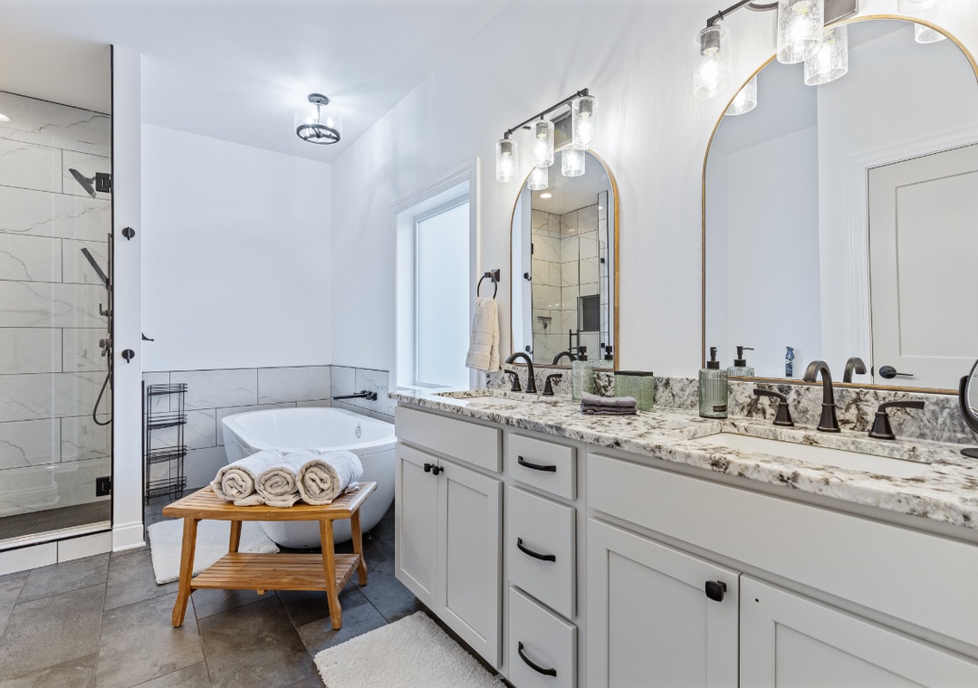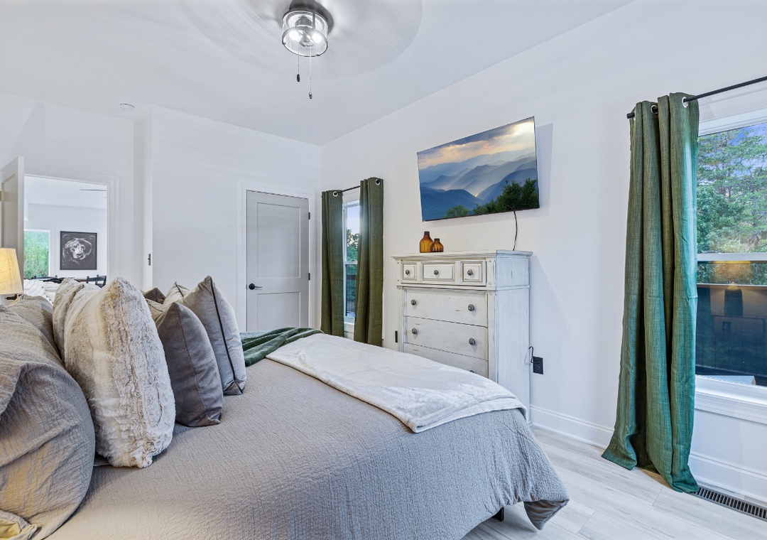 ✔ Bedroom #1 (Main Level): Spacious Bedroom with a King-sized Bed and a Flat-screen TV; Attached Full Bathroom with Stand Up Shower and Separate Soaker Tub