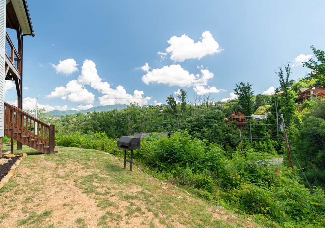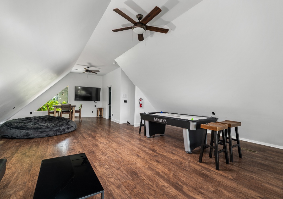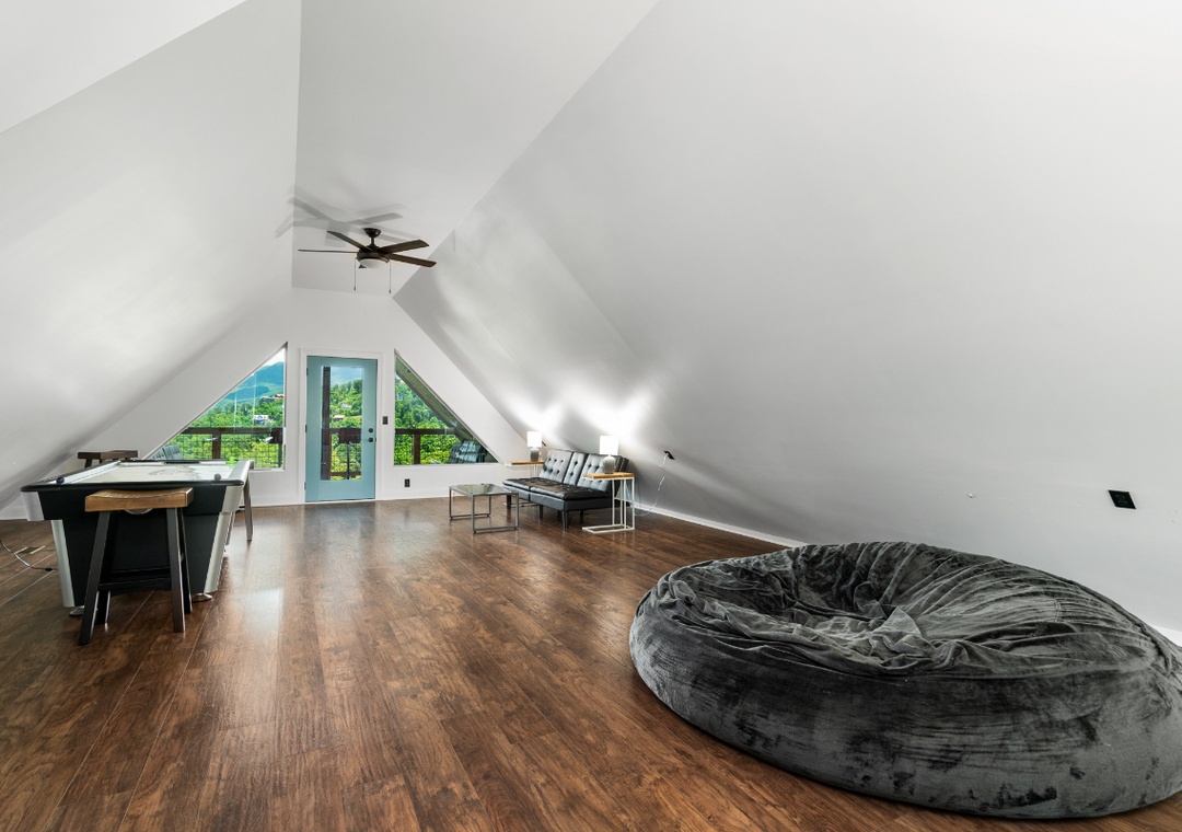 Inside, the lodge boasts an air hockey table, perfect for some friendly competition and hours of laughter while the living room provides a cozy setting to unwind after an active day, with its plush seating and electric fireplace creating a warm and inviting atmosphere. Outdoors, the lodge takes full advantage of its stunning mountain setting to create memorable experiences. Just to the left of the property, a park-style grill invites you to channel your inner chef. For evenings under the stars, venture up the hill to the firepit, where you can share stories, roast marshmallows, and soak in the peaceful sounds of the Smokies. Please note, however, that we kindly request that guests refrain from using the concrete blocks next to the fire pit. After a day of adventure in downtown Gatlinburg or hiking the beautiful trails, the private hot tub becomes the ultimate relaxation destination. Sink into the bubbling water and let the stress melt away as you take in the sweeping mountain views.