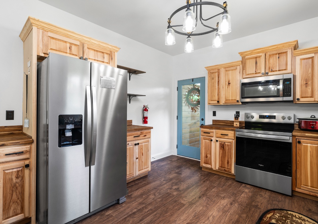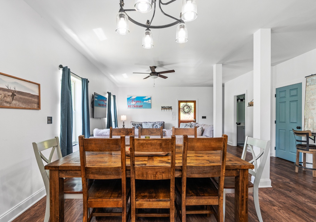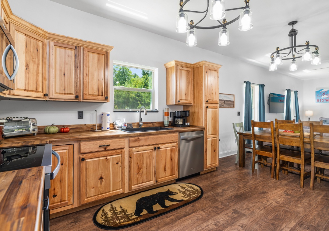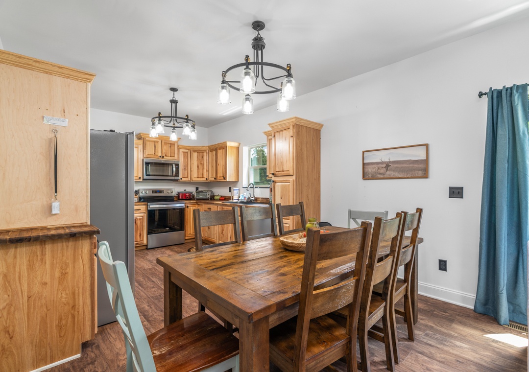 The fully-equipped kitchen boasts modern amenities making it easy to prepare delicious meals for your family or friends. Well-appointed with a full-sized refrigerator, dishwasher, stove, microwave, and other kitchen appliances perfect for making breakfast, lunch, or dinner throughout your stay! All pots, pans, glasses, plates, silverware, etc. are also there for you! Gather around the wooden dining table to share stories and laughter as it invites you to savor each bite while taking in the natural beauty of the surroundings.