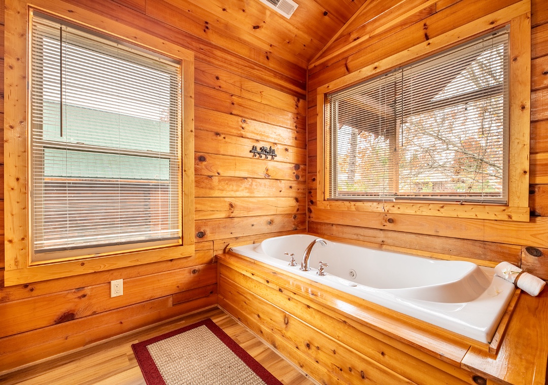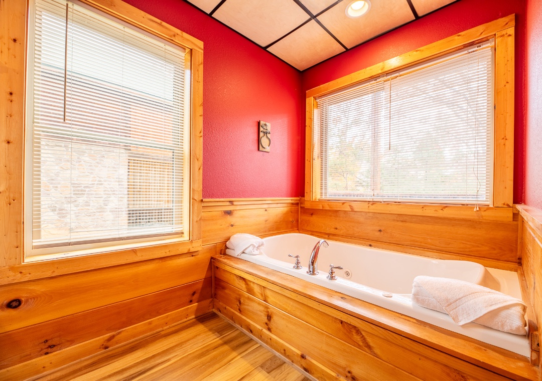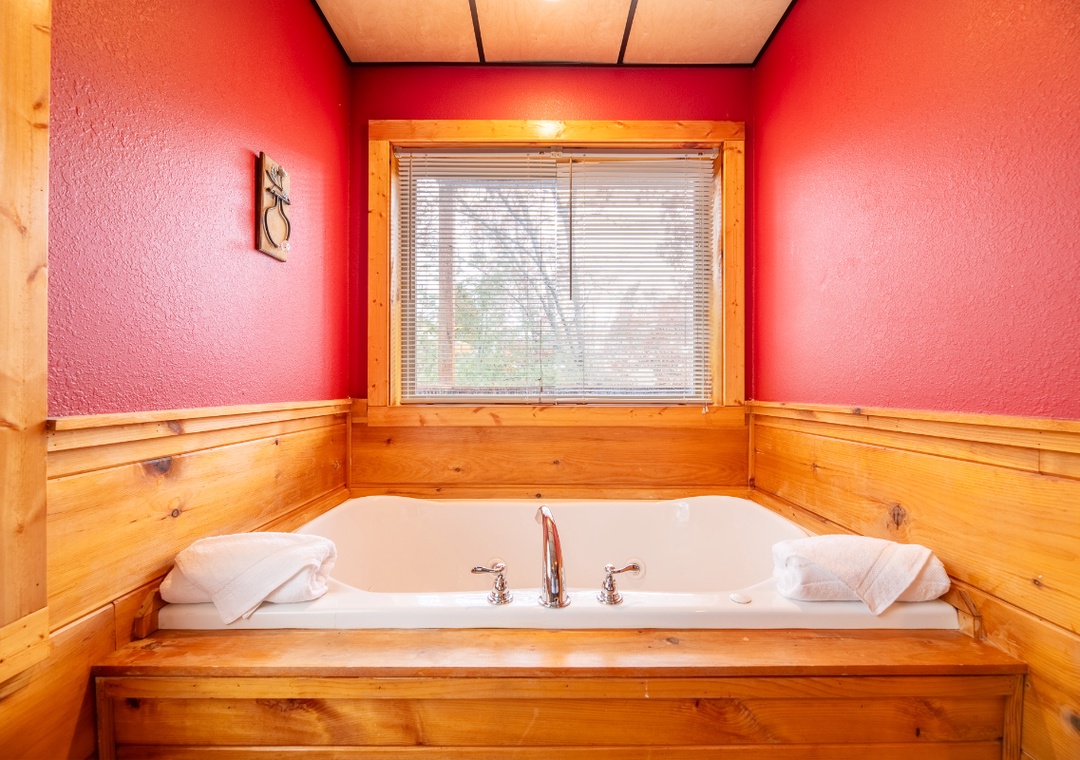 ✔ Bedroom #1 (Main Level): Spacious Bedroom with a King-Bed, Jacuzzi Tub, and Flatscreen TV; Attached Full Bathroom with Shower/tub combo