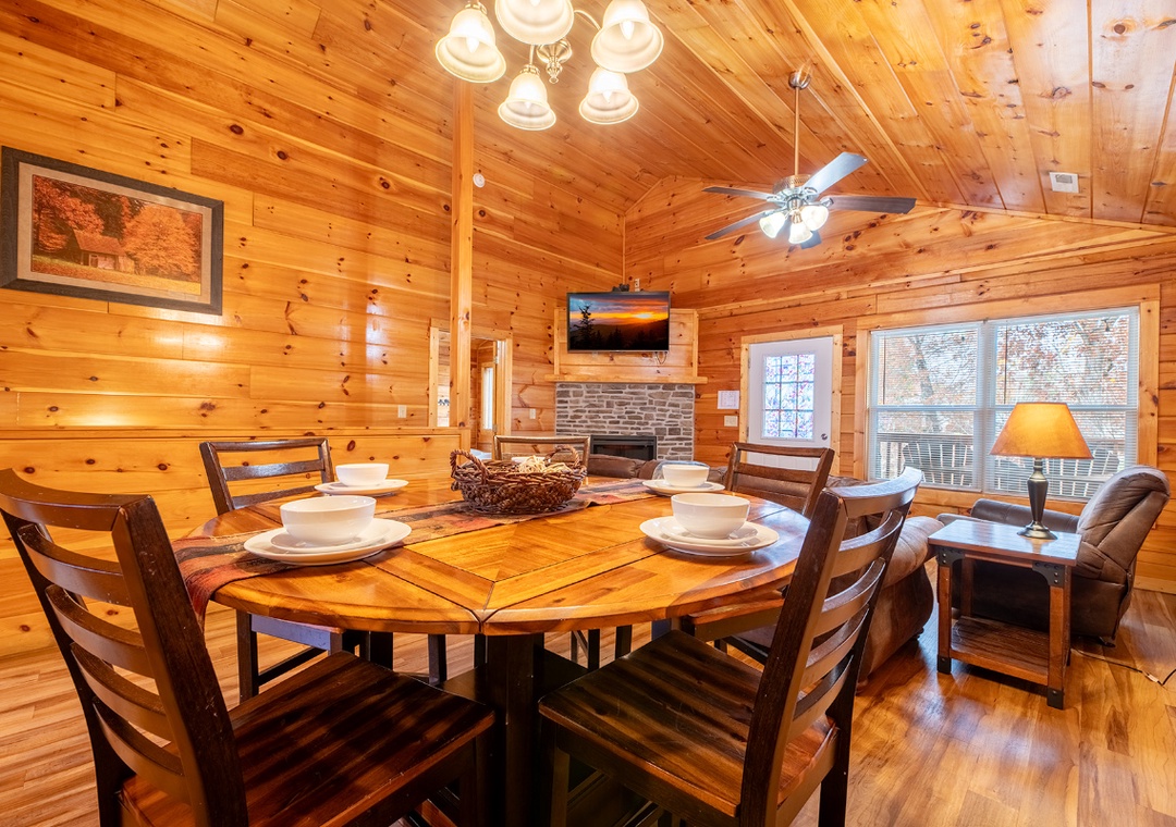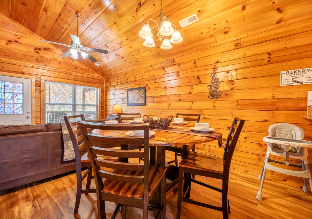 The indoor living experience at Blackberry Bijou is all about comfort, coziness, and connection. The main living room sets the tone with its electric fireplace, which provides both warmth and charm as it casts a soothing glow across the space. It’s an ideal place to curl up with a book or stream your favorite shows on the smart TV. Every detail is arranged to promote relaxation, from soft furnishings to open sightlines that connect the living space to the dining area and kitchen. Downstairs, find the game and theater room, which becomes a hub of activity on rainy days or evenings when you want to stay in and enjoy everything the cabin has to offer. Free WiFi is also available throughout the property.