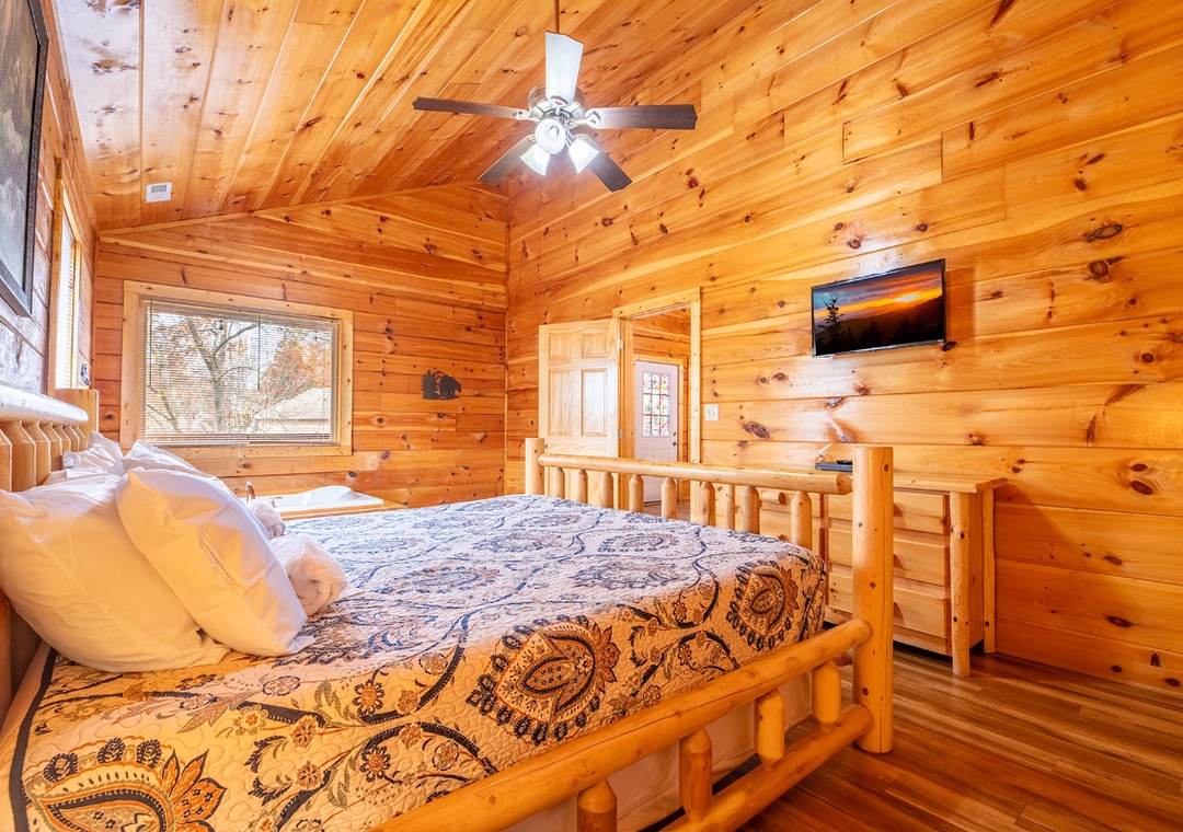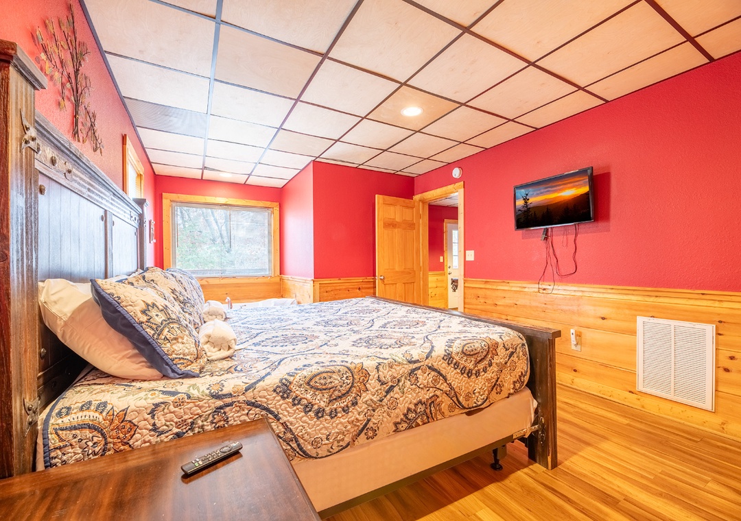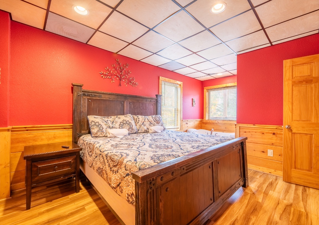 ✔ Bedroom #2 (Lower Level): Relaxing Bedroom with a King-Bed, Jacuzzi Tub, and Flatscreen TV; Attached Full Bathroom with Stand-up Shower