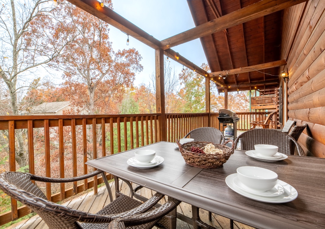 The fully-equipped kitchen boasts modern amenities, making it easy to prepare delicious meals for your family or friends. Well-appointed with a refrigerator, stove, microwave, and other kitchen appliances, perfect for making breakfast, lunch, or dinner throughout your stay! All pots, pans, glasses, plates, silverware, etc., are also there for you! Gather around the inviting dining table or the al fresco dining area to share stories and laughter while gathering over a delicious meal, letting the mountain breeze and warm glow of the cabin create the perfect backdrop for unforgettable moments together.