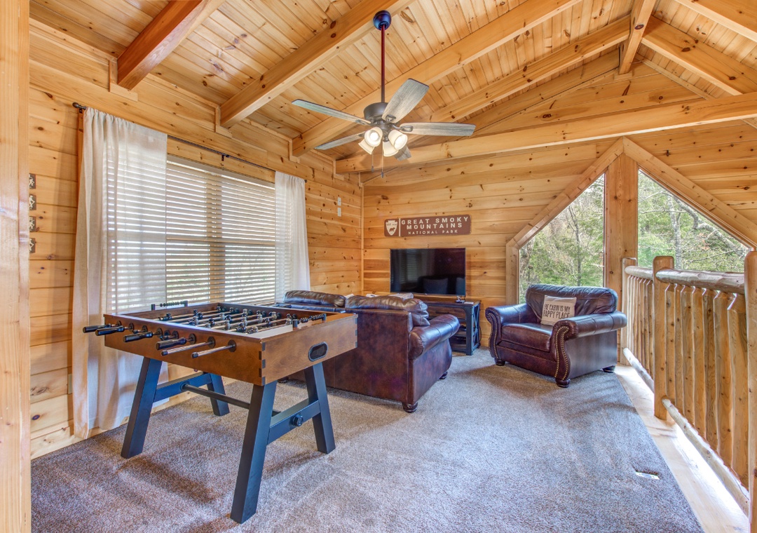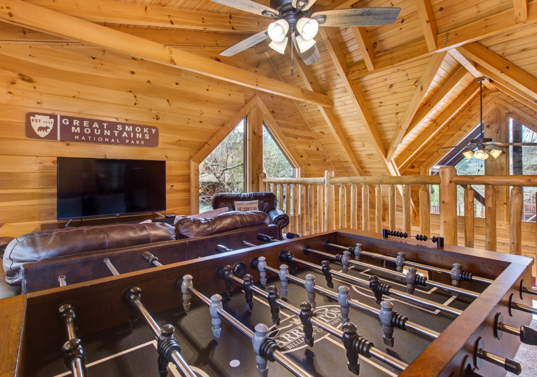 When you're not out exploring Pigeon Forge, Blackberry Lodge offers plenty of ways to stay entertained. The loft area is a fun hangout spot, featuring a foosball table and a TV sitting area where you can unwind and watch your favorite shows. For those who love the outdoors, the back deck is the perfect place to take in the fresh mountain air, soak in the bubbling hot tub, or simply enjoy the scenic views with a cup of coffee or a glass of wine. And with its prime location just minutes from Dollywood, dinner shows, hiking trails, and more, adventure is always just around the corner.