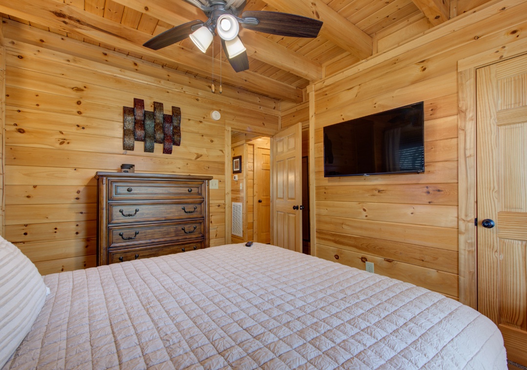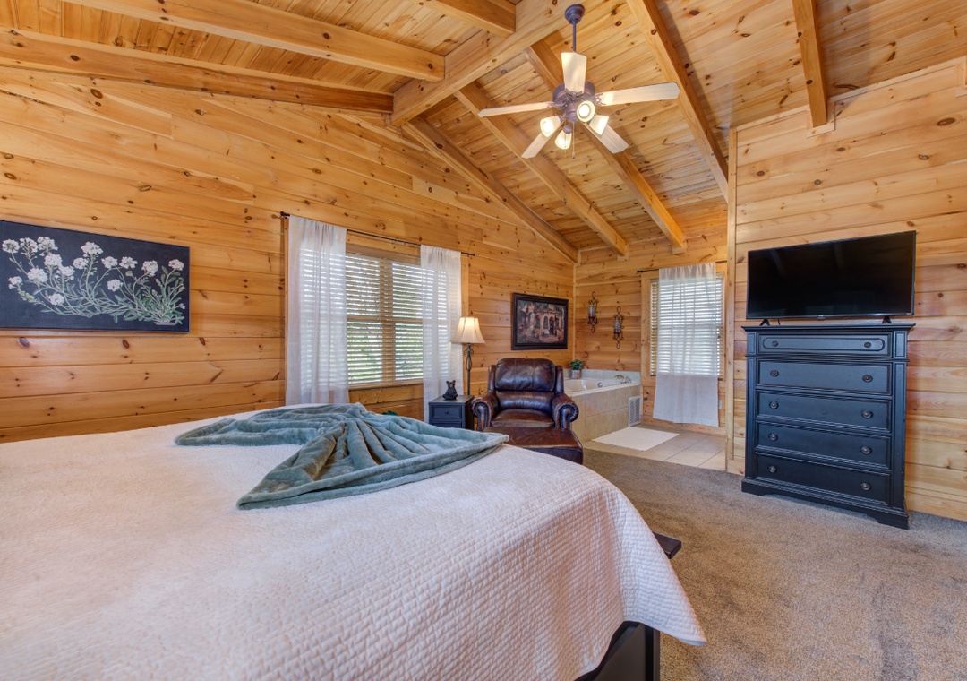 ✔ Bedroom #3 (Upper Level): Master Bedroom with a King-sized bed and Flat-screen TV; Attached Full Bathroom with Shower/Tub Combo and Separate Jacuzzi