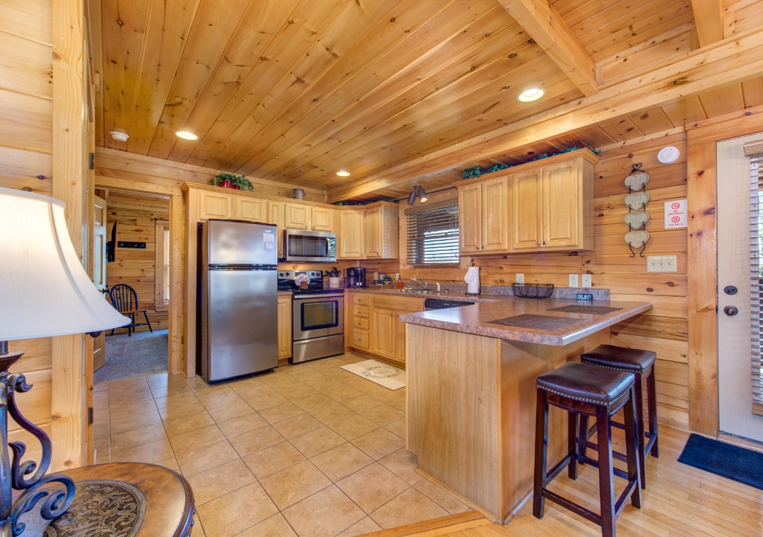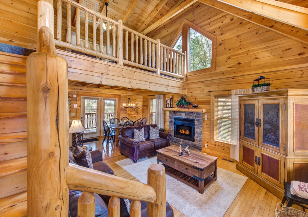 Our inviting cabin blends rustic charm with modern comforts to create a warm and welcoming atmosphere. The main living area is the heart of the home, featuring plush seating, a 43" TCL Roku TV, and an electric fireplace that sets the mood for cozy evenings. Whether you're gathered around for movie night, sipping coffee as the morning light spills in, or simply enjoying the peaceful ambiance, this space is designed for relaxation. Prepare delicious home-cooked meals in the fully equipped kitchen just across the living area. Upstairs, the loft provides an additional lounge area, complete with a foosball table, TV, and sitting space, making it a great spot for kids or those looking for a little extra entertainment. Free WiFi is also available throughout the property.