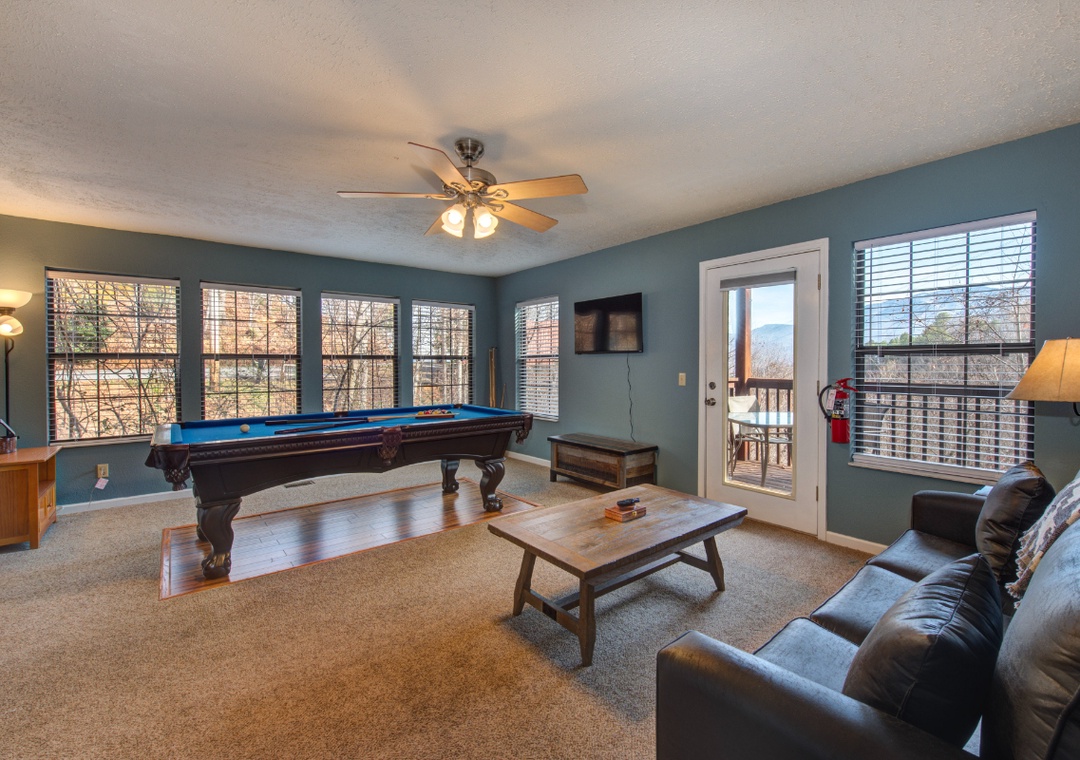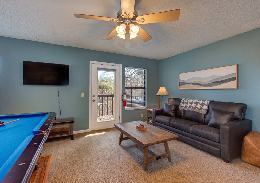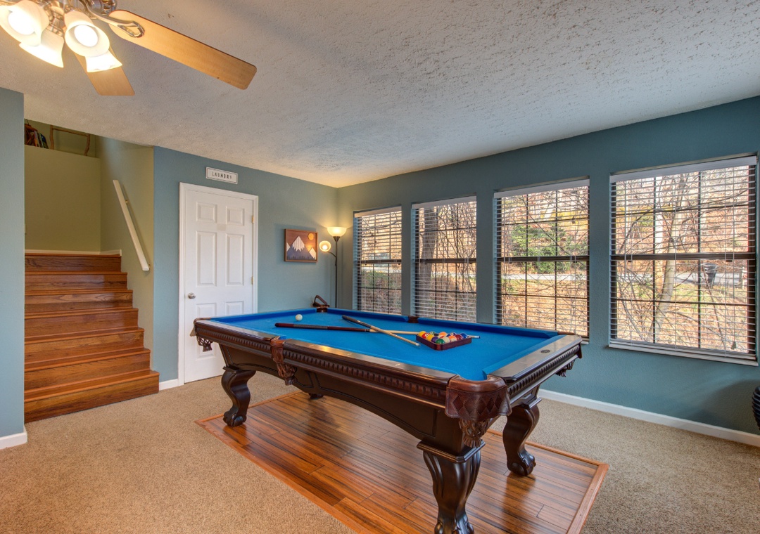 The expansive lower-level game room serves as the centerpiece of indoor fun, offering a full-size pool table perfect for friendly competitions that can easily stretch late into the evening. A smart TV adds another layer of entertainment, allowing you to stream movies, catch the big game, or wind down with your favorite shows. The additional sitting area provides plenty of space for guests to relax, chat, or enjoy a board game, making this level a natural gathering spot for groups who love spending time together. Just steps outside the game room, the lower deck offers access to the bubbling hot tub, where warm, swirling water and cool mountain breezes combine to create a perfect oasis. The upper deck extends your entertainment options even more, providing a propane grill for easy outdoor dining and a tranquil spot to enjoy the panoramic mountain views that make this chalet truly unforgettable. For those who love to mix in a little sunshine and fresh air, your stay also includes access to a seasonal community pool located just minutes away. Open from the Friday of Memorial Day Weekend through Labor Day, the pool operates from 9 a.m. to 9 p.m. Wednesday through Monday.