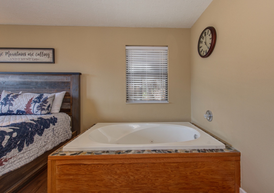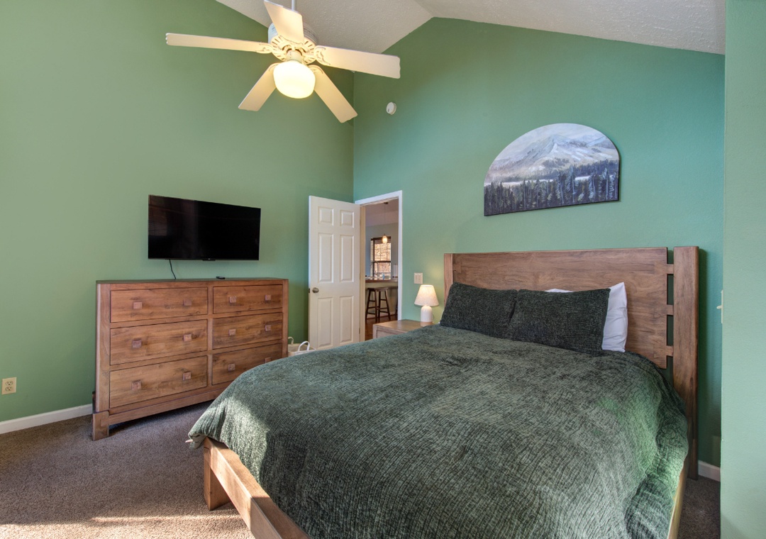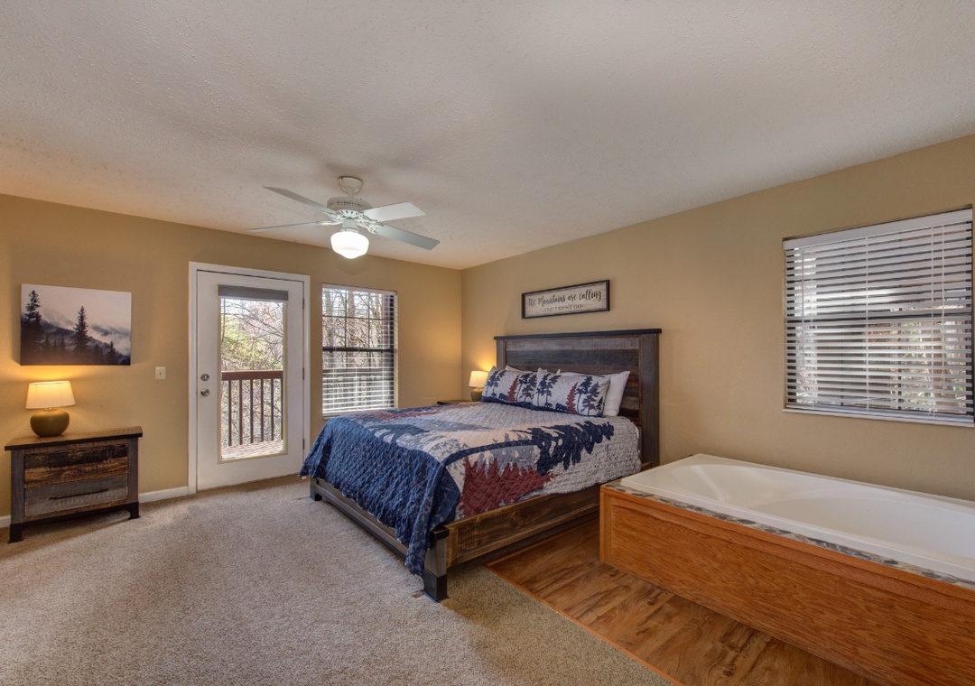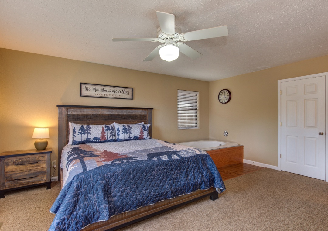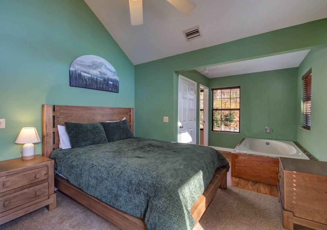 ✔ Bedroom #2 (Lower Level): Spacious Bedroom with a King-Bed and Flatscreen TV; Attached Full Bathroom with Shower/Tub Combo and Separate Jacuzzi