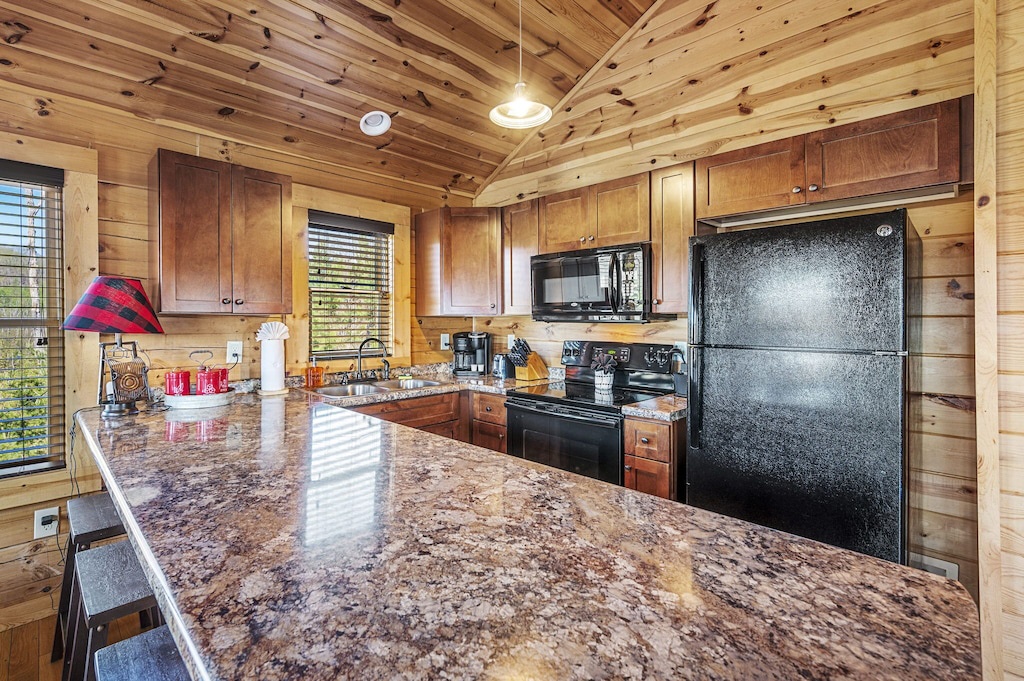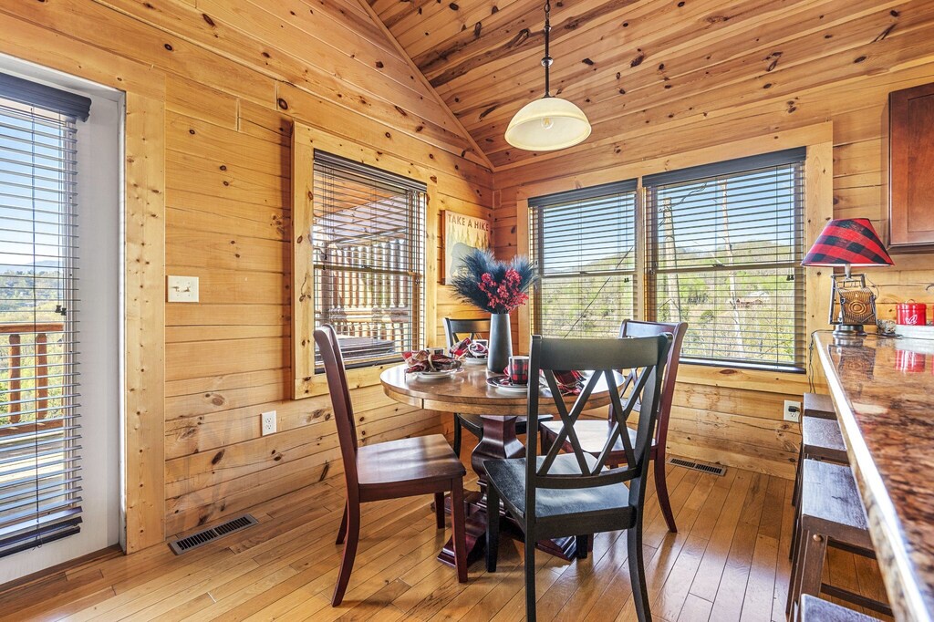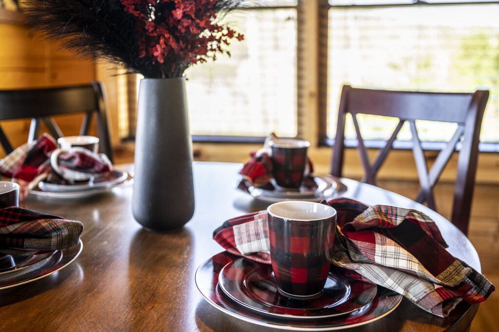 Fully equipped modern kitchen with granite countertops; full-sized refrigerator, dishwasher, stove, microwave, and other kitchen appliances perfect for making breakfast, lunch or dinner throughout your stay! All pots, pans, glasses, plates, silverware, etc. are also there for you. There is a lovely dining room located right off the kitchen, surrounded by windows to take in the stunning mountain ambiance and views, along with additional seating at the breakfast bar.