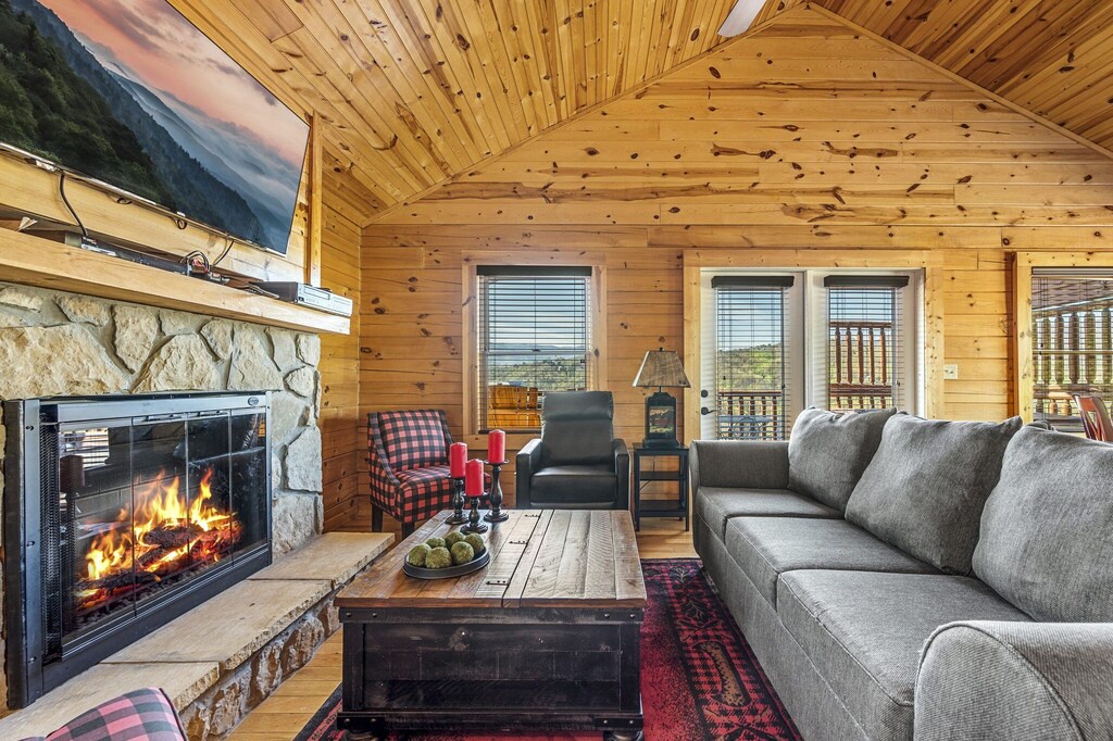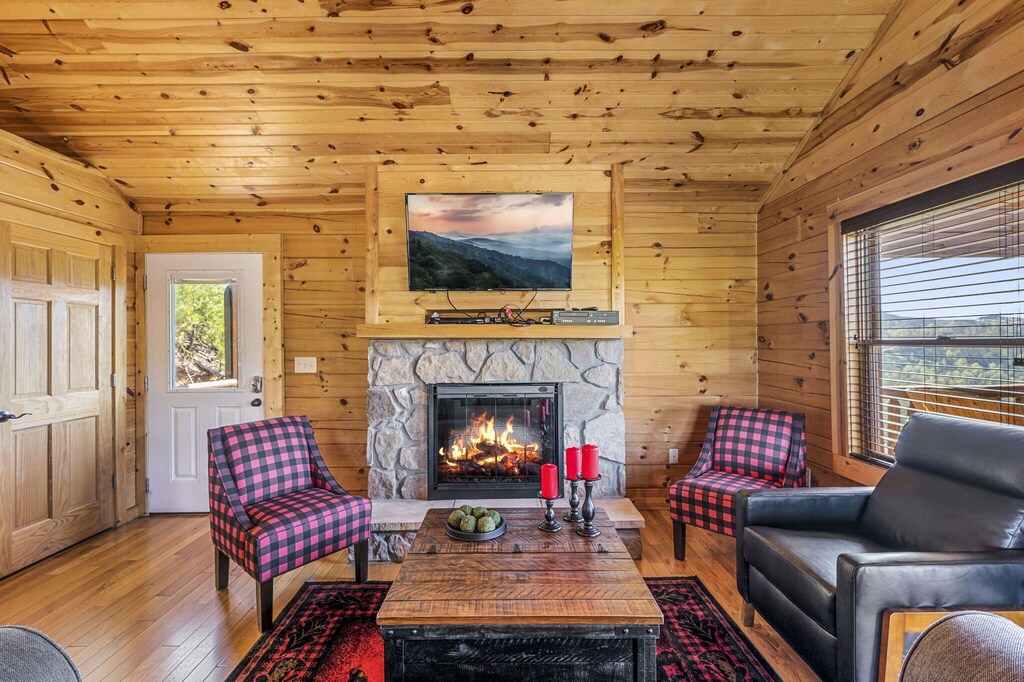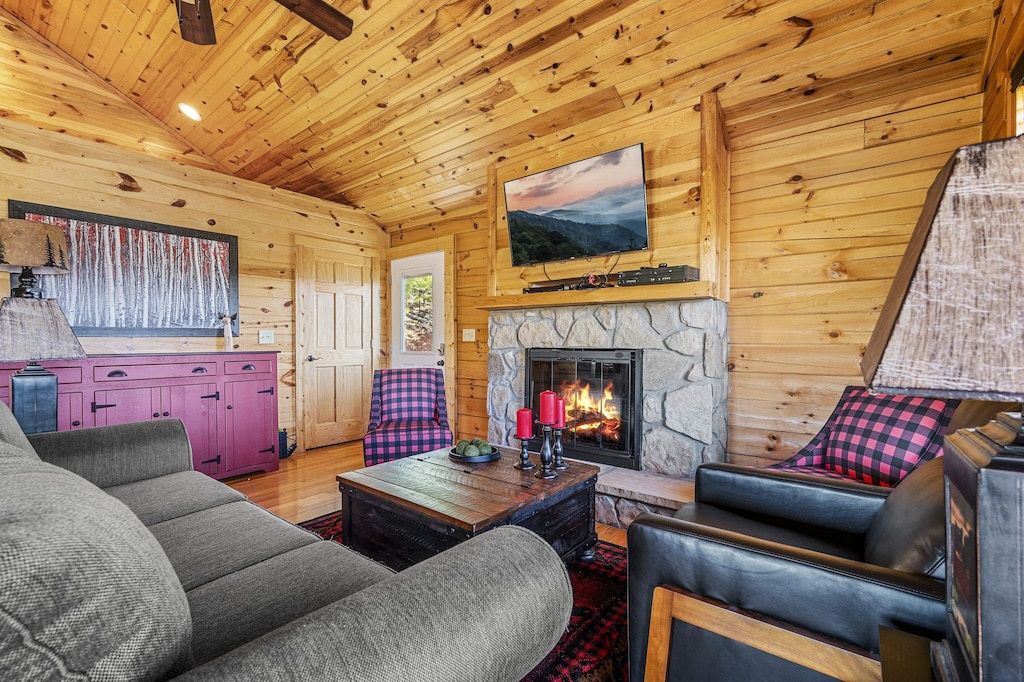 Fully furnished log cabin retreat with lovely mountain décor; Spacious living area with fireplace, comfy couches and flat screen TV; Open floor plan with living and dining on the same level; Modern and fully equipped kitchen; Spacious primary bedroom with jacuzzi tub and attached full bath; Modern Amenities; Wifi