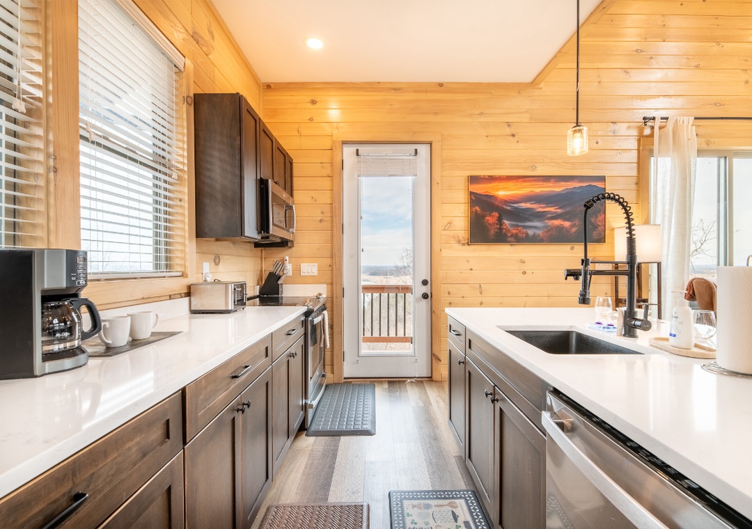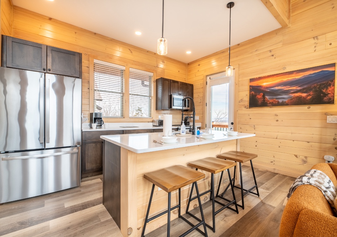 The fully-equipped kitchen boasts modern amenities, making it easy to prepare delicious meals for your family or friends. Well-appointed with a refrigerator, stove, microwave, and other kitchen appliances, perfect for making breakfast, lunch, or dinner throughout your stay! All pots, pans, glasses, plates, silverware, etc., are also there for you! Gather around the inviting dining table or the nearby breakfast bar to share stories and laughter while basking in the serene wooded views.