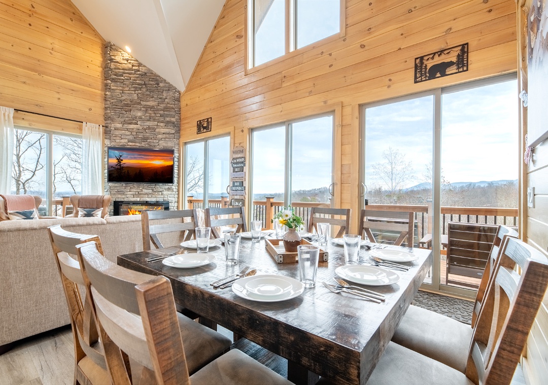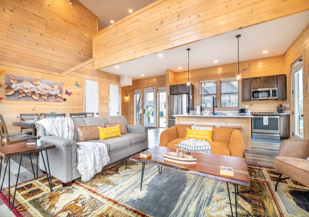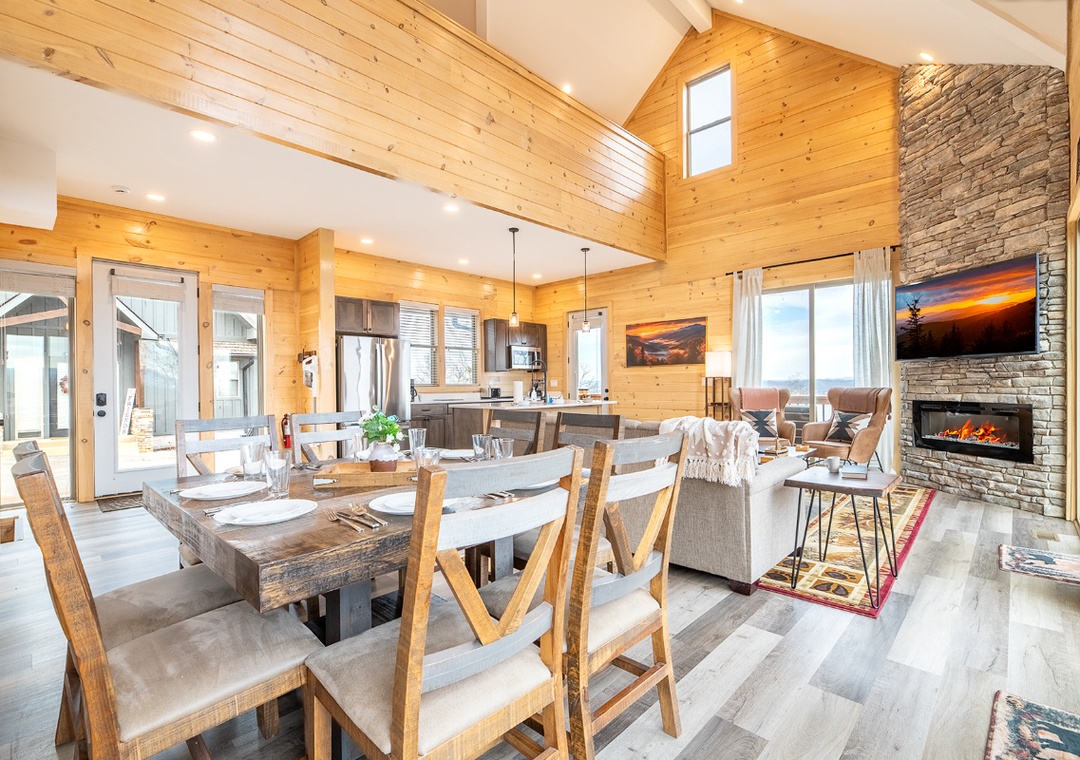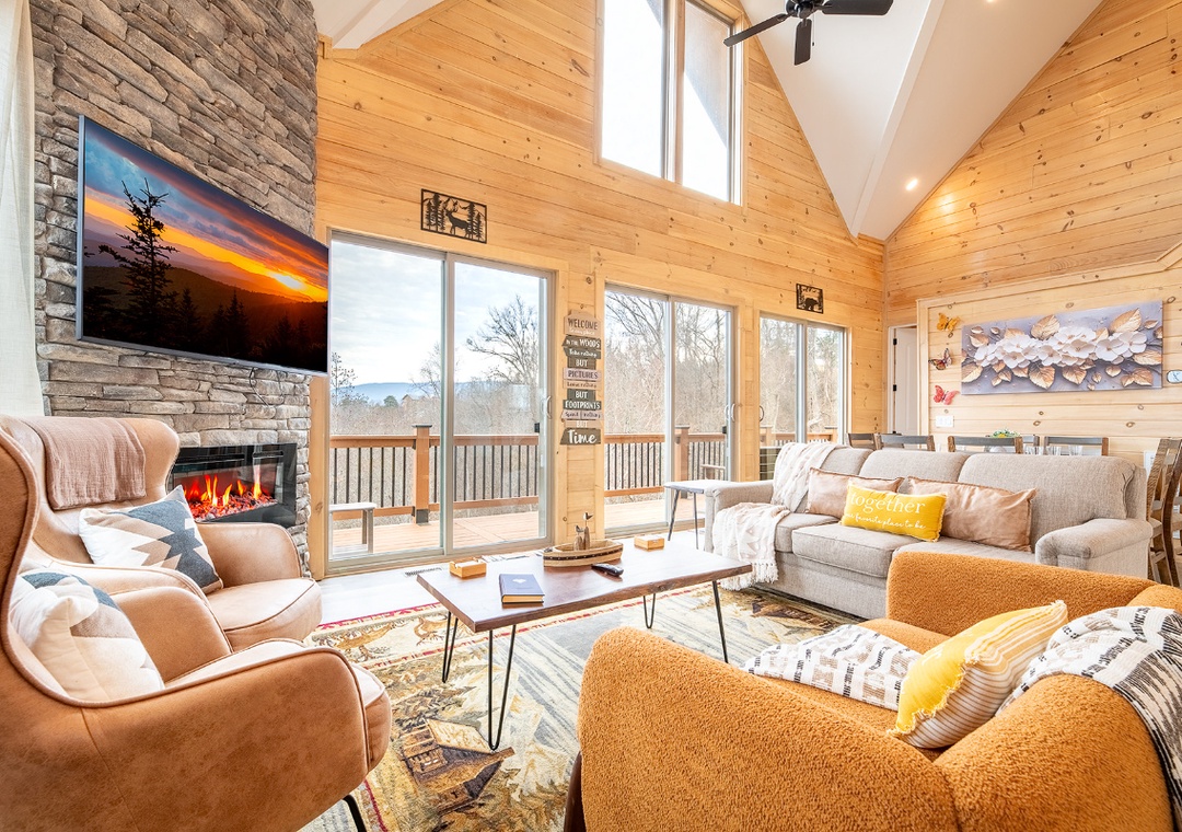 Step inside and immediately notice how bright and welcoming the main living area feels. The living room is designed for comfort and connection, featuring plush seating arranged around a glowing electric fireplace and a smart TV perfect for a movie night, enjoying a quiet afternoon of reading, or simply lounging and chatting. Just steps away, the chef’s kitchen adds to the cabin’s inviting indoor flow. The breakfast bar provides a casual place for morning coffee, while the formal dining table nearby invites longer meals, board games, and shared moments that bring everyone together. Downstairs, find the game room perfect for friendly competition and shared fun. Adding to the experience is the dedicated theater room, designed for unforgettable indoor movie nights. Free WiFi is also available throughout the property.