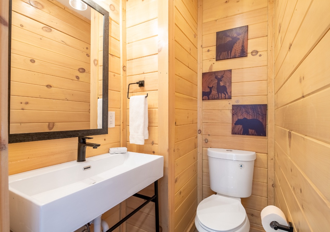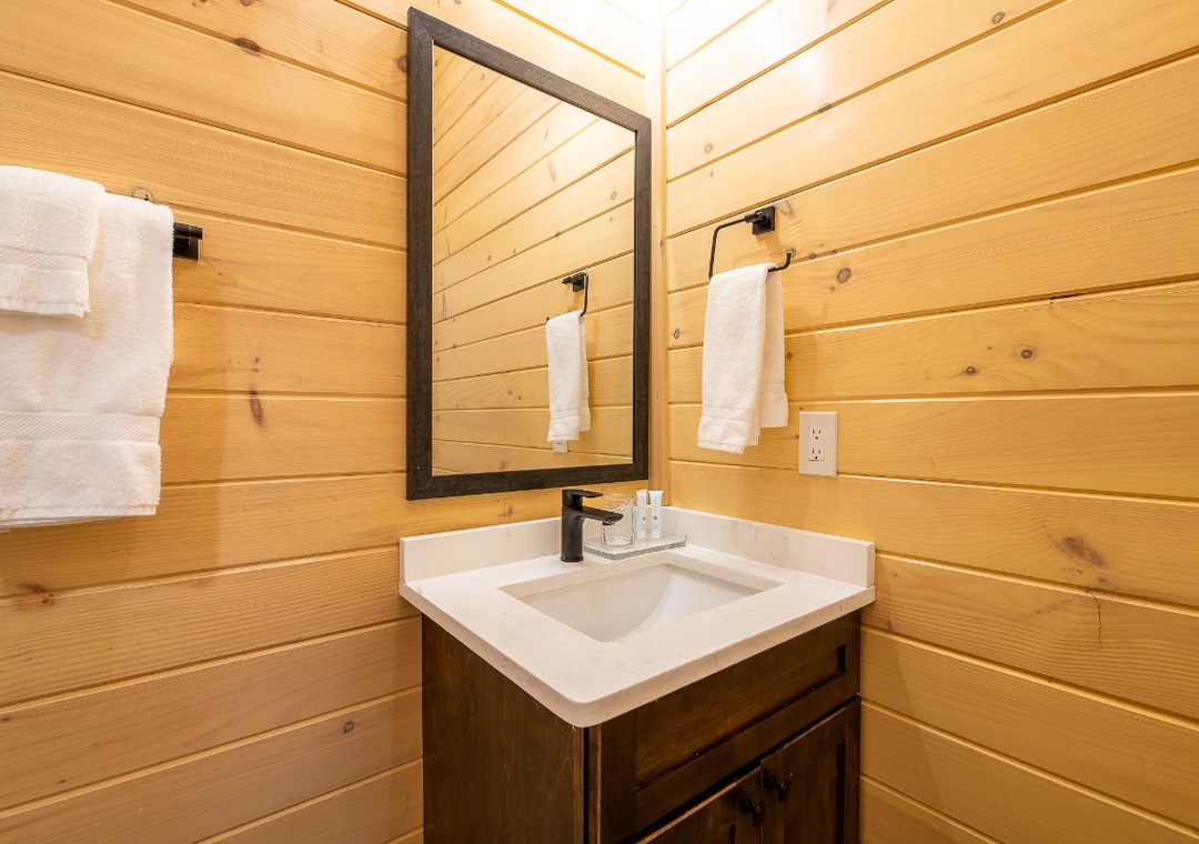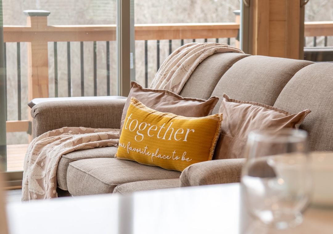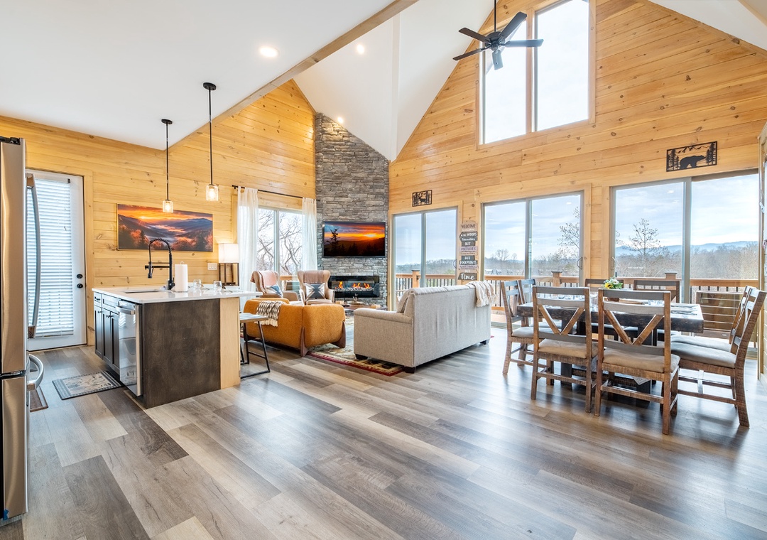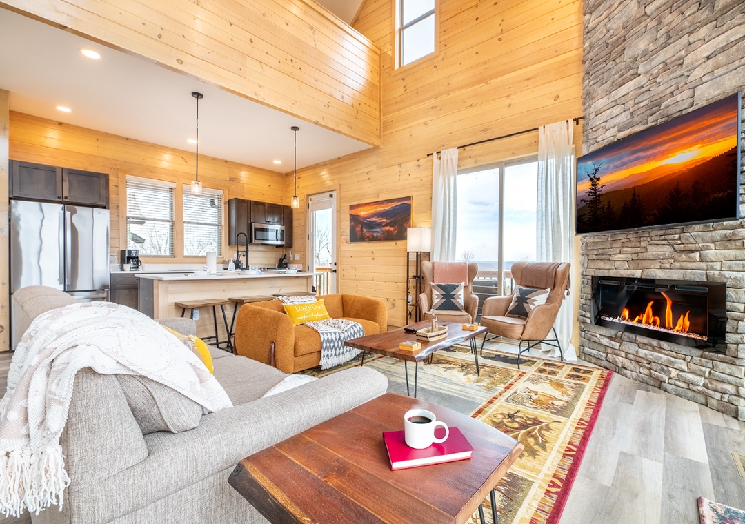 Step inside and immediately notice how bright and welcoming the main living area feels. The living room is designed for comfort and connection, featuring plush seating arranged around a glowing electric fireplace and a smart TV perfect for a movie night, enjoying a quiet afternoon of reading, or simply lounging and chatting. Just steps away, the chef’s kitchen adds to the cabin’s inviting indoor flow. The breakfast bar provides a casual place for morning coffee, while the formal dining table nearby invites longer meals, board games, and shared moments that bring everyone together. Downstairs, find the game room perfect for friendly competition and shared fun. Adding to the experience is the dedicated theater room, designed for unforgettable indoor movie nights. Free WiFi is also available throughout the property.