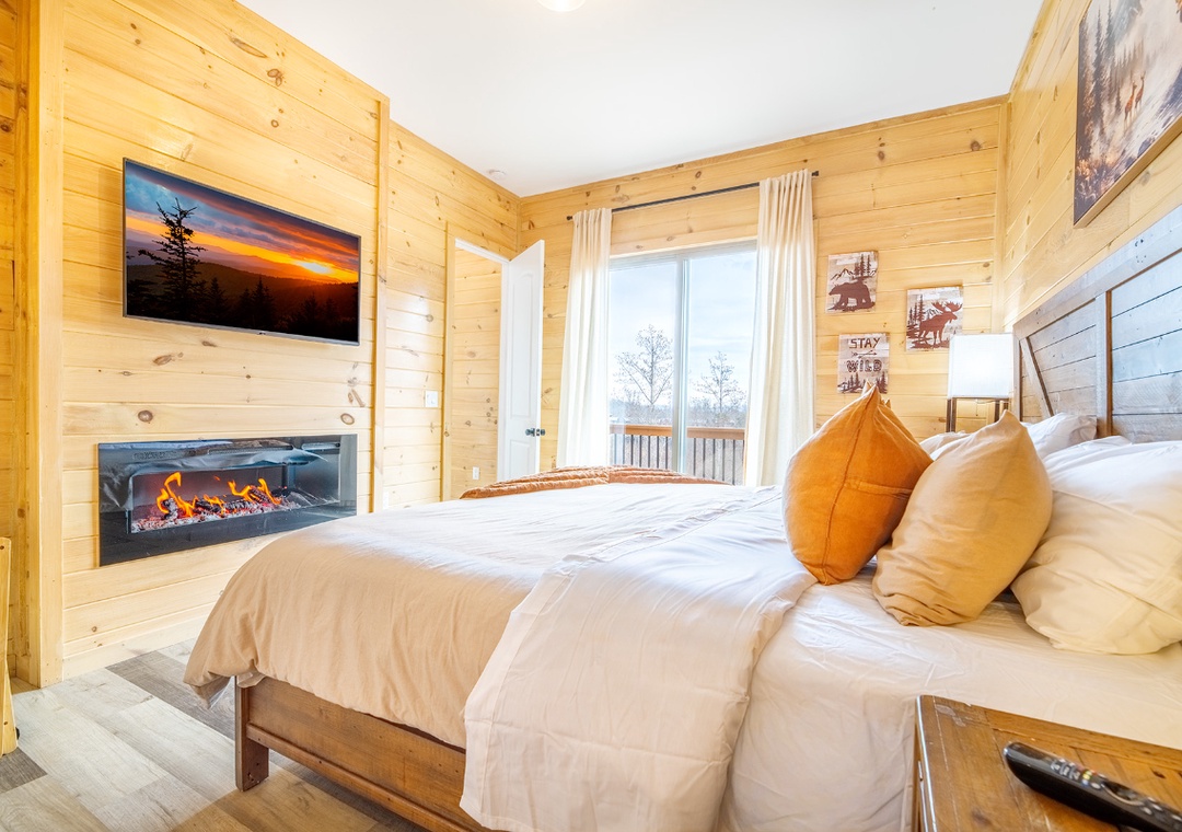 ✔ Bedroom #1 (Main Level): Spacious Bedroom with a King-Bed, Electric Fireplace, and Flatscreen TV; Attached Full Bathroom with Stand Up Shower