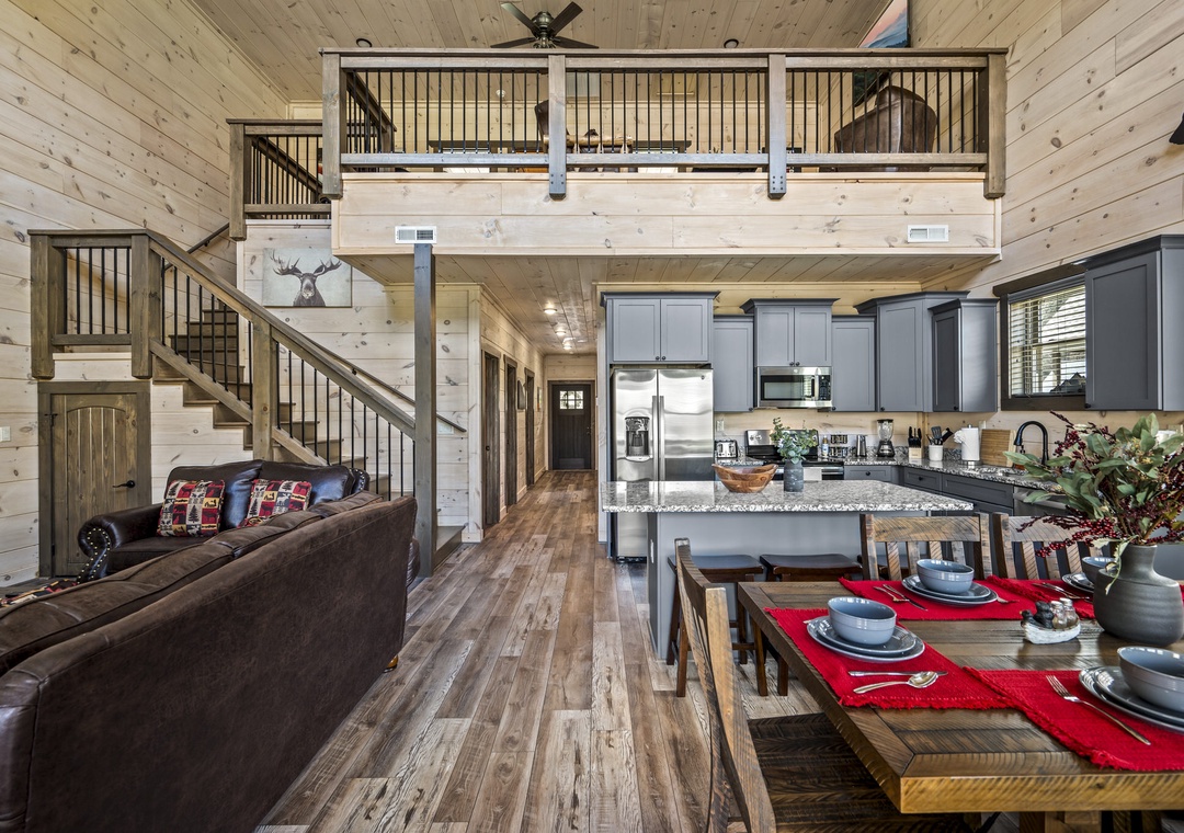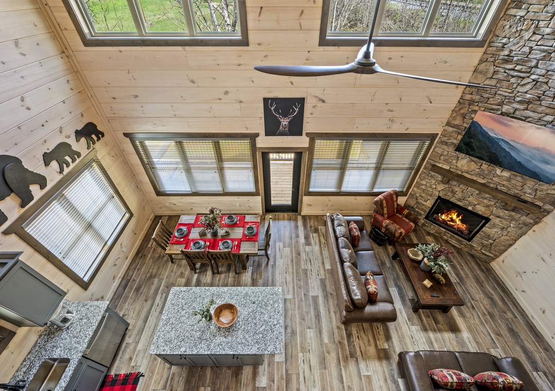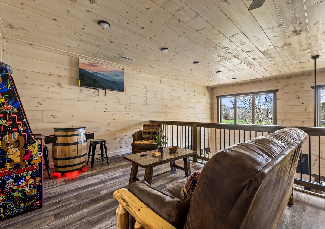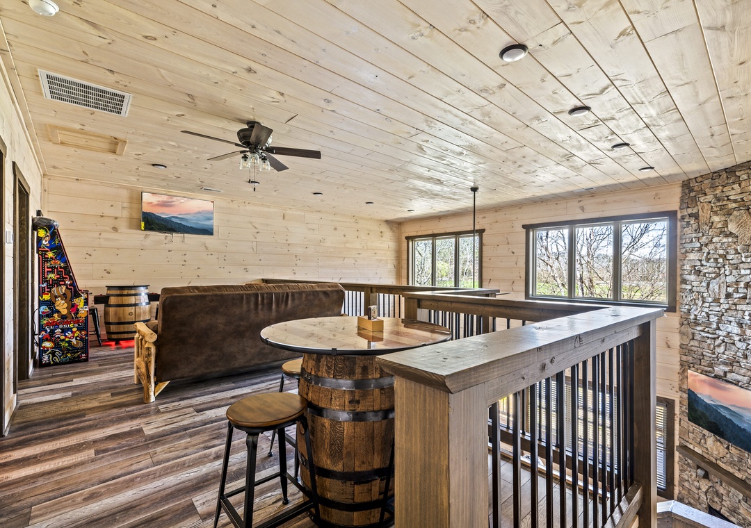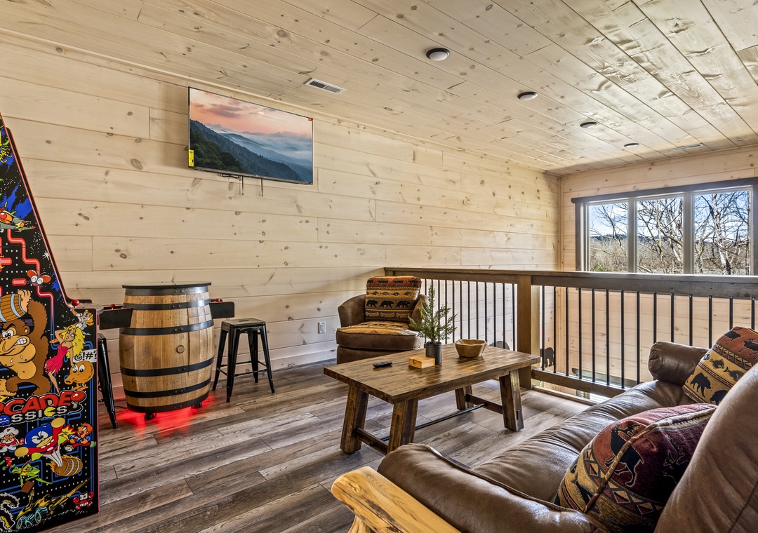 Step inside and be enveloped by the inviting ambiance of the spacious living room, where high ceilings and huge windows create an atmosphere of rustic elegance. Your gaze is drawn to the centerpiece of the room – a grand stone fireplace with crackling flames casting a warm, inviting glow that beckons you to unwind and indulge in moments of relaxation. Admire the panoramic views through floor-to-ceiling windows, which frame sweeping views, ensuring that nature's splendor is never far from sight. The adjacent kitchen is a culinary haven, boasting modern appliances, sleek countertops, and ample cabinet space, all accented by charming rustic touches that evoke the spirit of mountain living. Go upstairs to the loft and find the game room complete with arcade games, a comfy sofa, and a large flat-screen TV. Wifi is also available throughout the property.