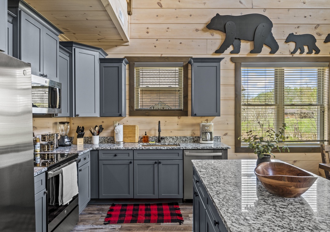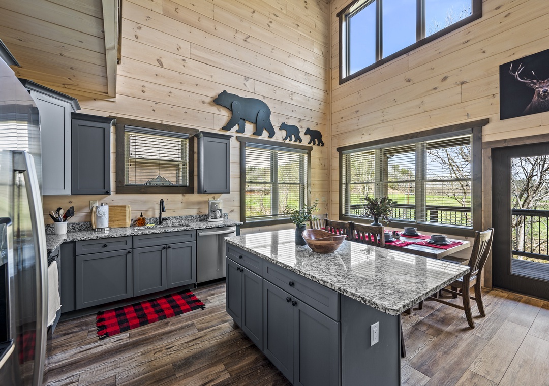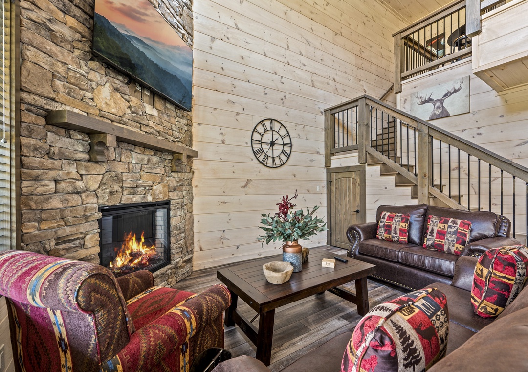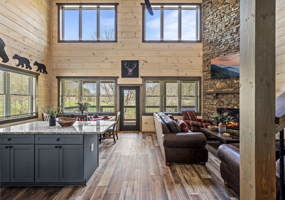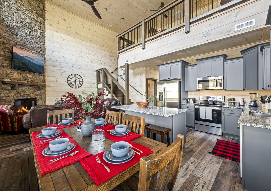 Step inside and be enveloped by the inviting ambiance of the spacious living room, where high ceilings and huge windows create an atmosphere of rustic elegance. Your gaze is drawn to the centerpiece of the room – a grand stone fireplace with crackling flames casting a warm, inviting glow that beckons you to unwind and indulge in moments of relaxation. Admire the panoramic views through floor-to-ceiling windows, which frame sweeping views, ensuring that nature's splendor is never far from sight. The adjacent kitchen is a culinary haven, boasting modern appliances, sleek countertops, and ample cabinet space, all accented by charming rustic touches that evoke the spirit of mountain living. Go upstairs to the loft and find the game room complete with arcade games, a comfy sofa, and a large flat-screen TV. Wifi is also available throughout the property.