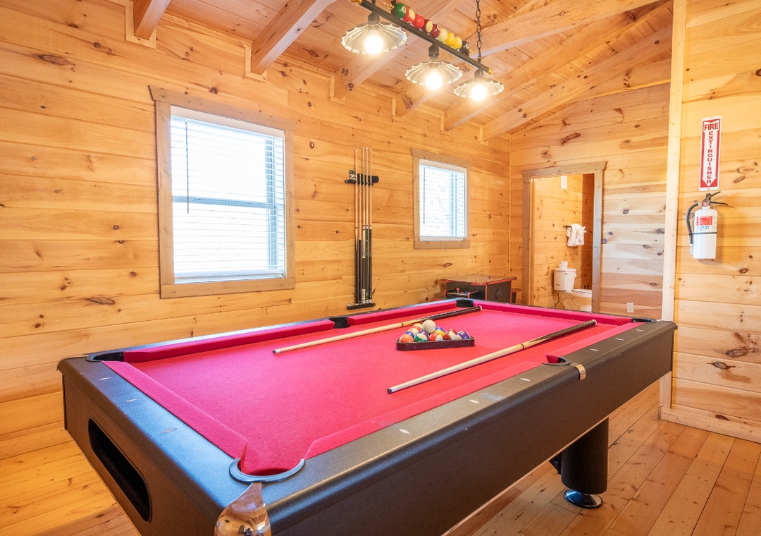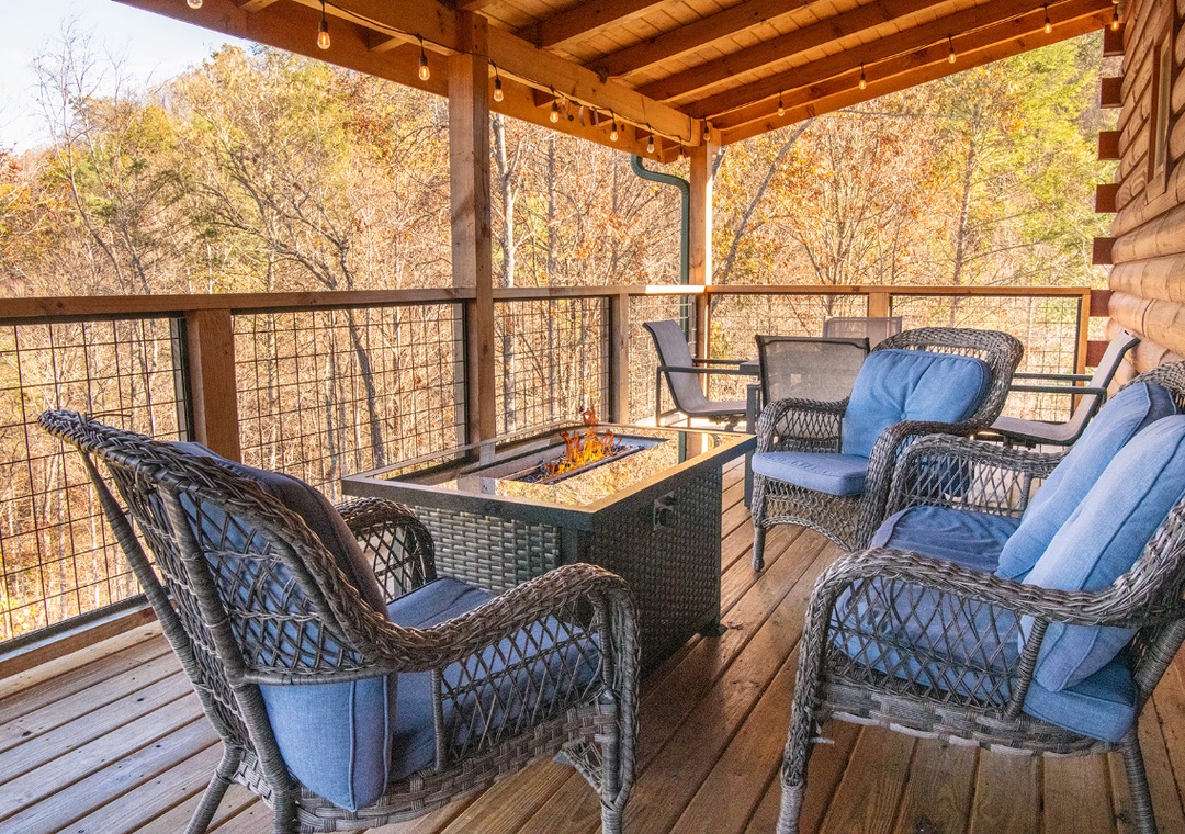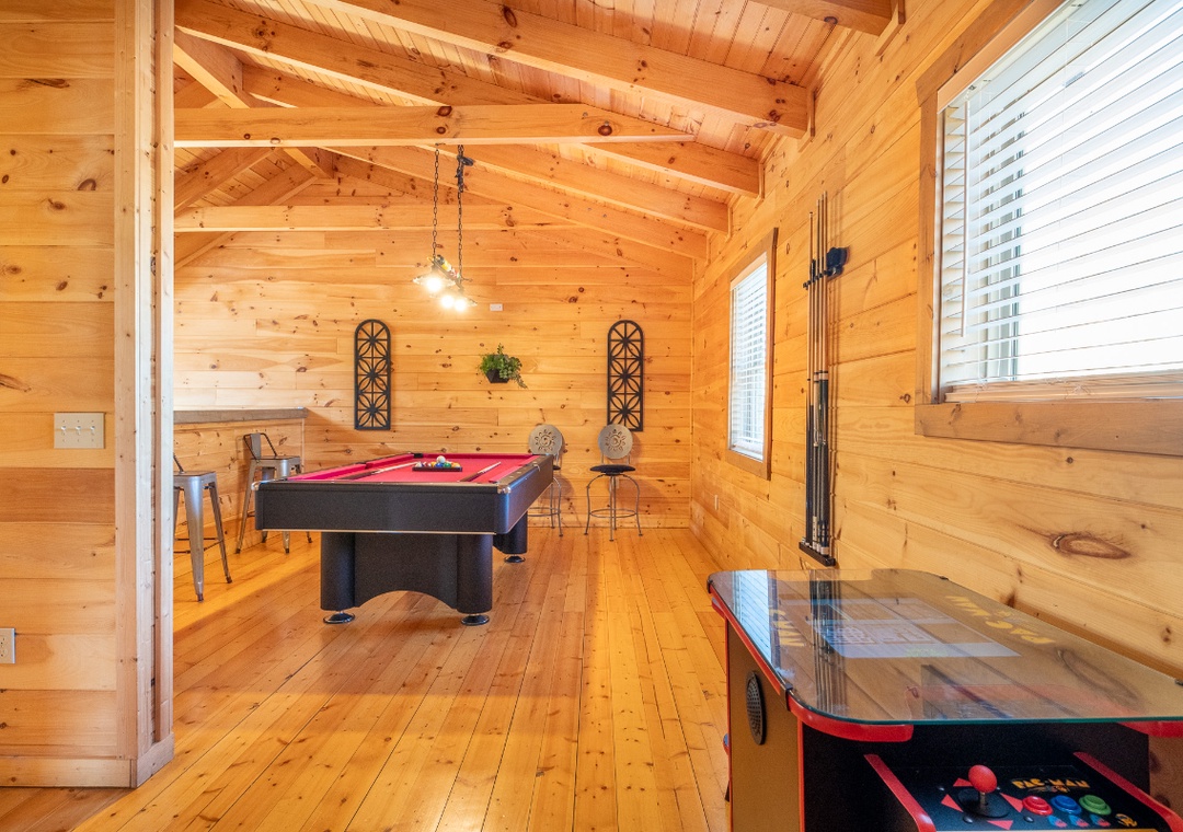 In the open-air loft, the game room awaits with its inviting setup for hours of fun, whether it's friendly competitions at the pool table, an exciting match at the arcade, or simply lounging with a view of the lush surroundings. Just downstairs, the open living area offers a cozy haven for movie nights, board games, or quiet reading by the electric firepit, providing a perfect escape for relaxation at any time of the day. Stepping outside, the entertainment only amplifies with a thoughtfully designed outdoor fire pit area, where six seats encircle a crackling fire under the star-filled mountain sky. Here, the night comes alive with storytelling, laughter, and s’mores, all set against the serene backdrop of the Smoky Mountains. A hot tub also awaits, offering the ultimate relaxation spot where you can unwind as warm bubbles melt away stress, all while surrounded by tranquil mountain scenery.
