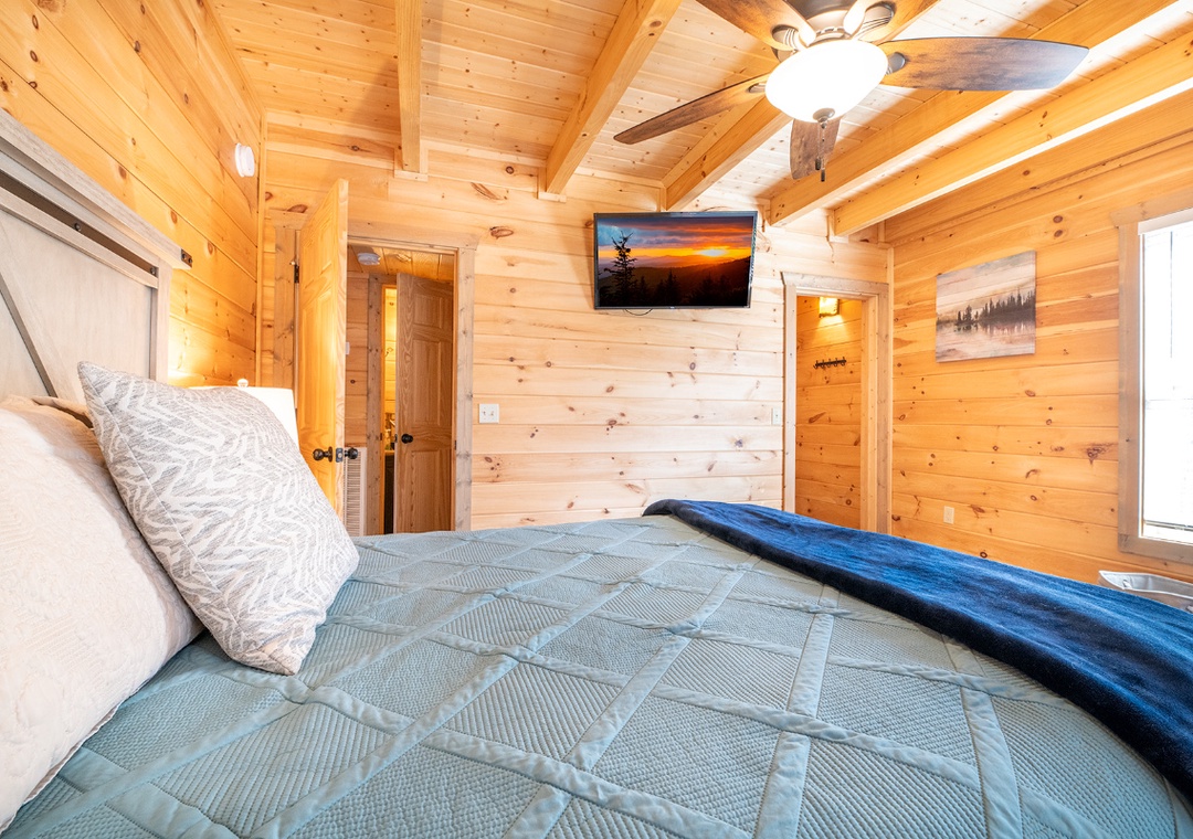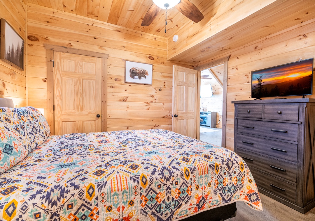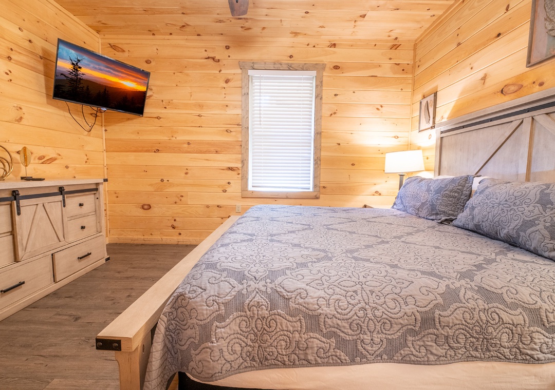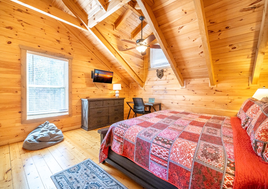 ✔ Bedroom #1 (Upper Level): Spacious Bedroom with King-sized Bed & Flat Screen TV; Attached Full Bathroom with Shower/Tub Combo