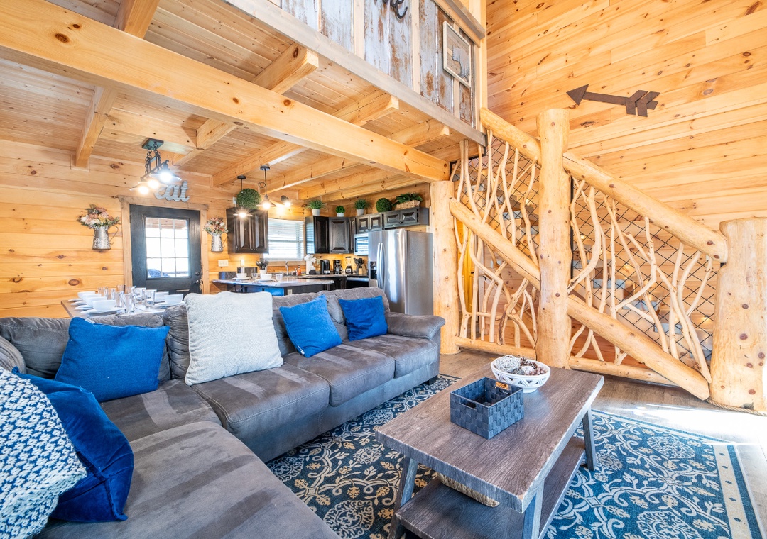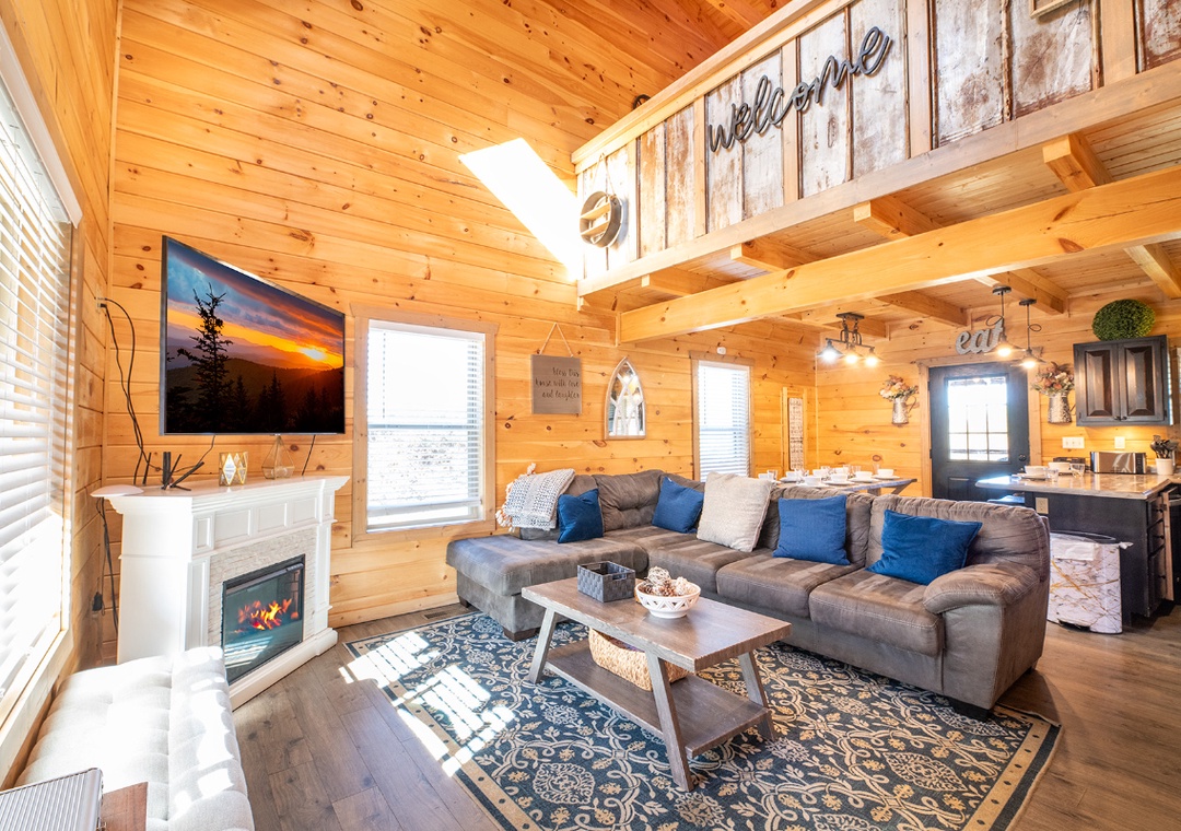 From the moment you walk in, "Cabin In The Mountains" impresses with its breathtaking craftsmanship. The main floor welcomes you with a stunning visual display featuring a custom large-log stairwell, an open-concept living room, and a kitchen with soaring cathedral ceilings, and expansive views that bring the Smoky landscape indoors. The upper level features an open-air loft game room with ample space for fun and games, perfect for friendly competitions or simply unwinding. Downstairs, a large family room provides another retreat, complete with cozy seating, entertainment options, and direct access to the outdoor fire pit area. Free Wifi is also available throughout the property.