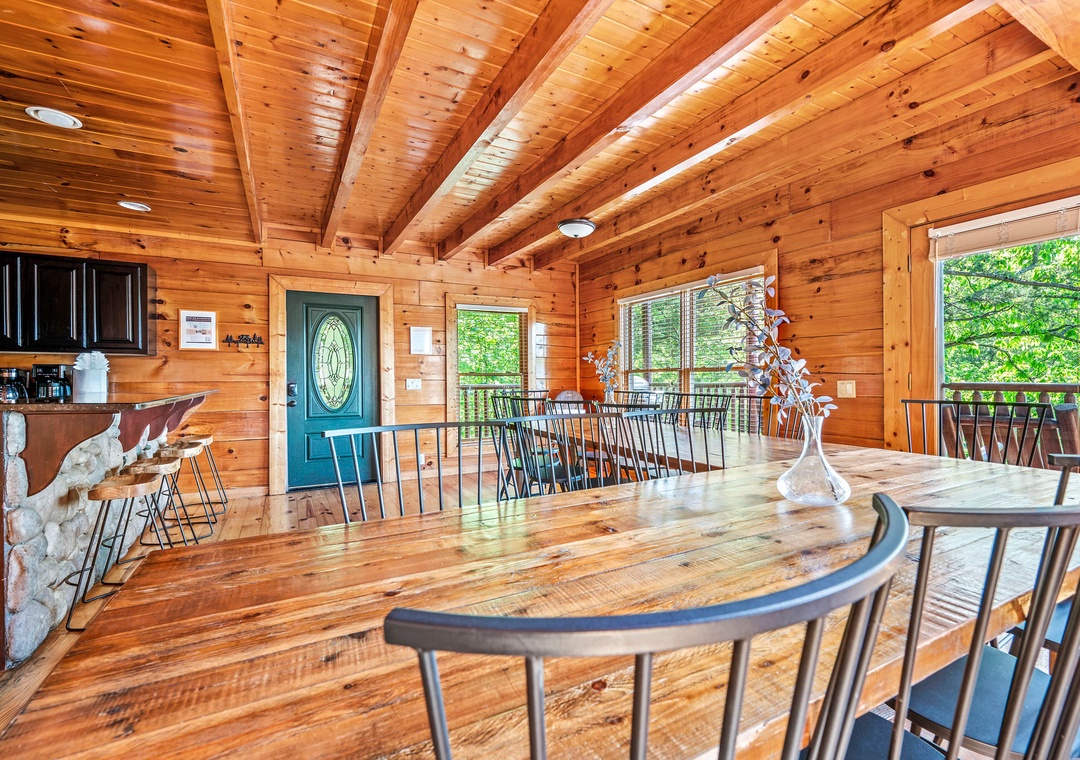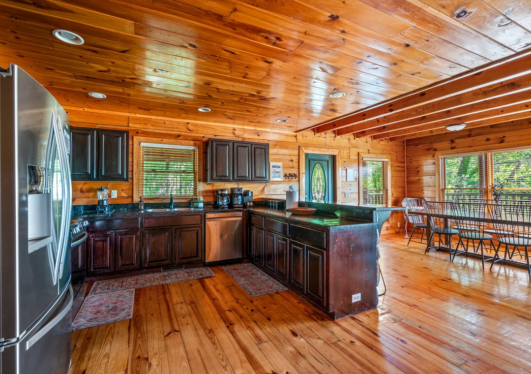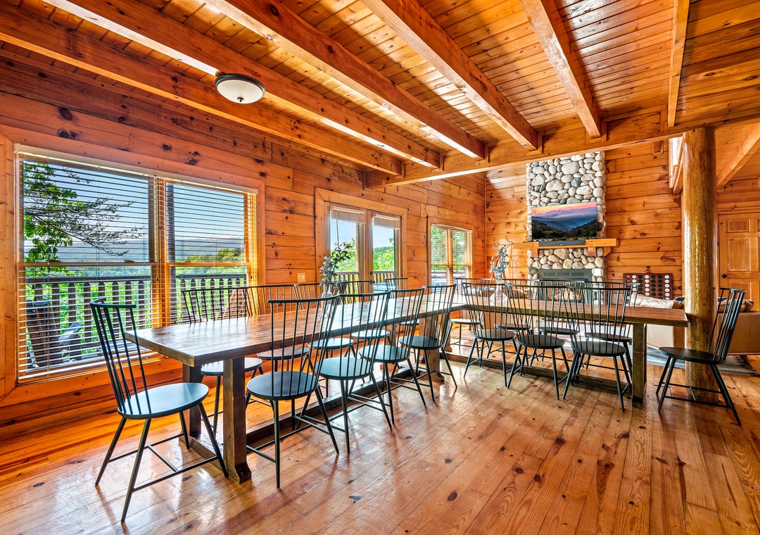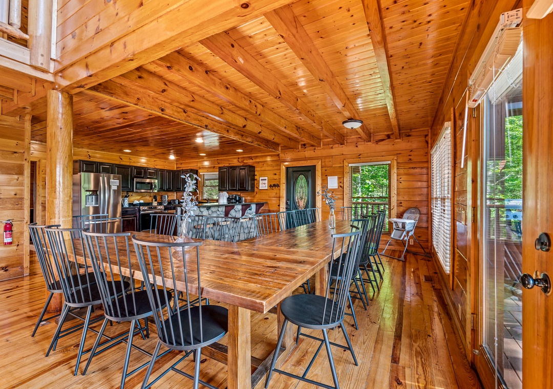 The fully-equipped kitchen is a chef's dream. Complete with a full-sized refrigerator, dishwasher, stove, microwave, and other kitchen appliances perfect for making breakfast, lunch, or dinner throughout your stay! All pots, pans, glasses, plates, silverware, etc. are also there for you! A spacious dining area awaits family dining, with a large table set against a backdrop of mountain views.