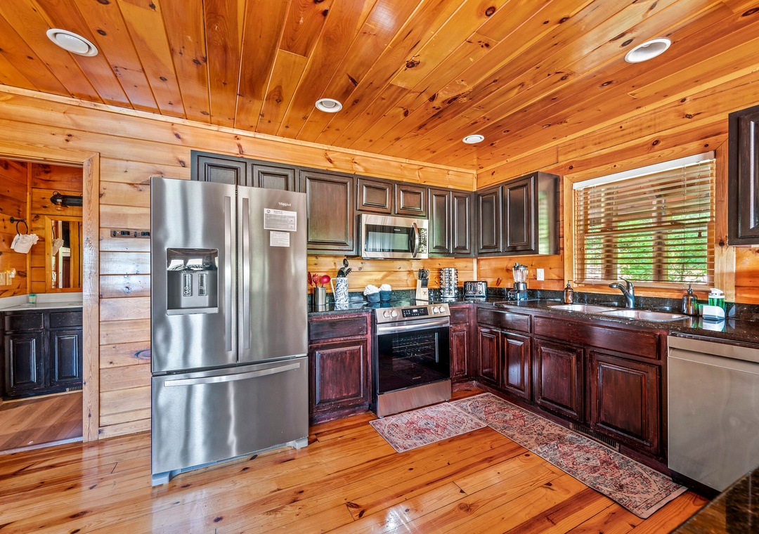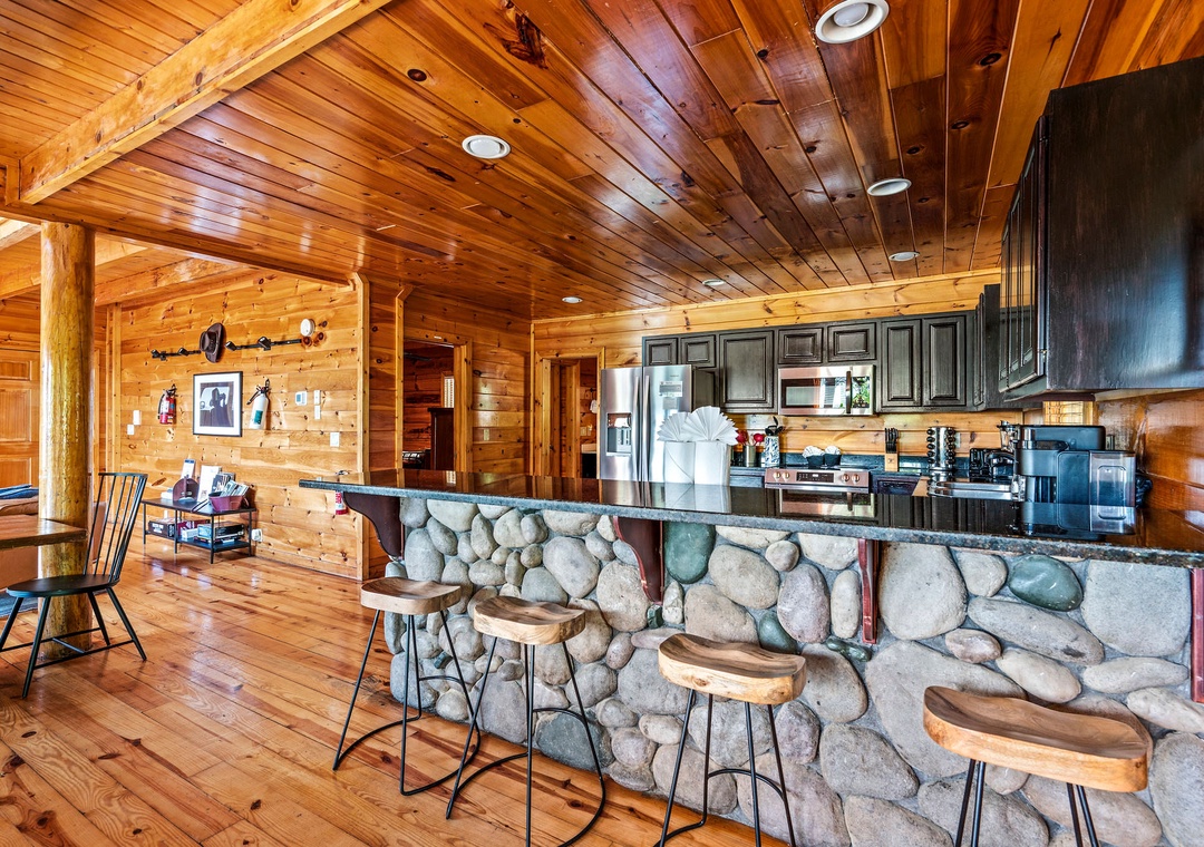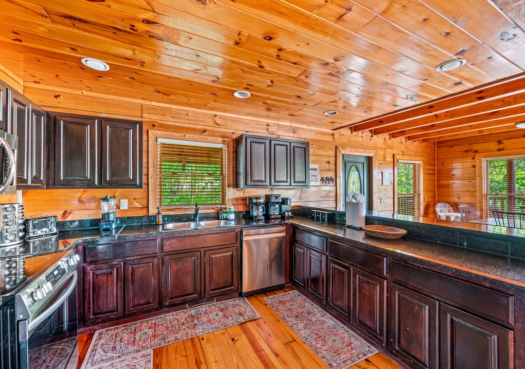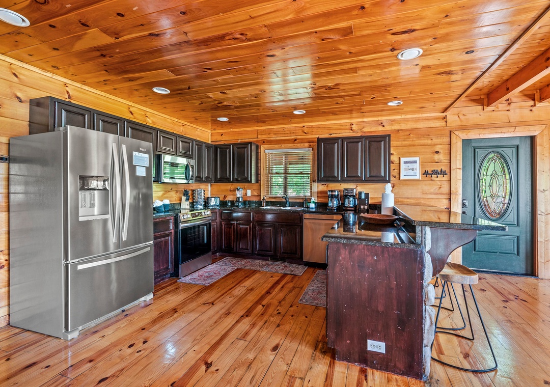 The fully-equipped kitchen is a chef's dream. Complete with a full-sized refrigerator, dishwasher, stove, microwave, and other kitchen appliances perfect for making breakfast, lunch, or dinner throughout your stay! All pots, pans, glasses, plates, silverware, etc. are also there for you! A spacious dining area awaits family dining, with a large table set against a backdrop of mountain views.