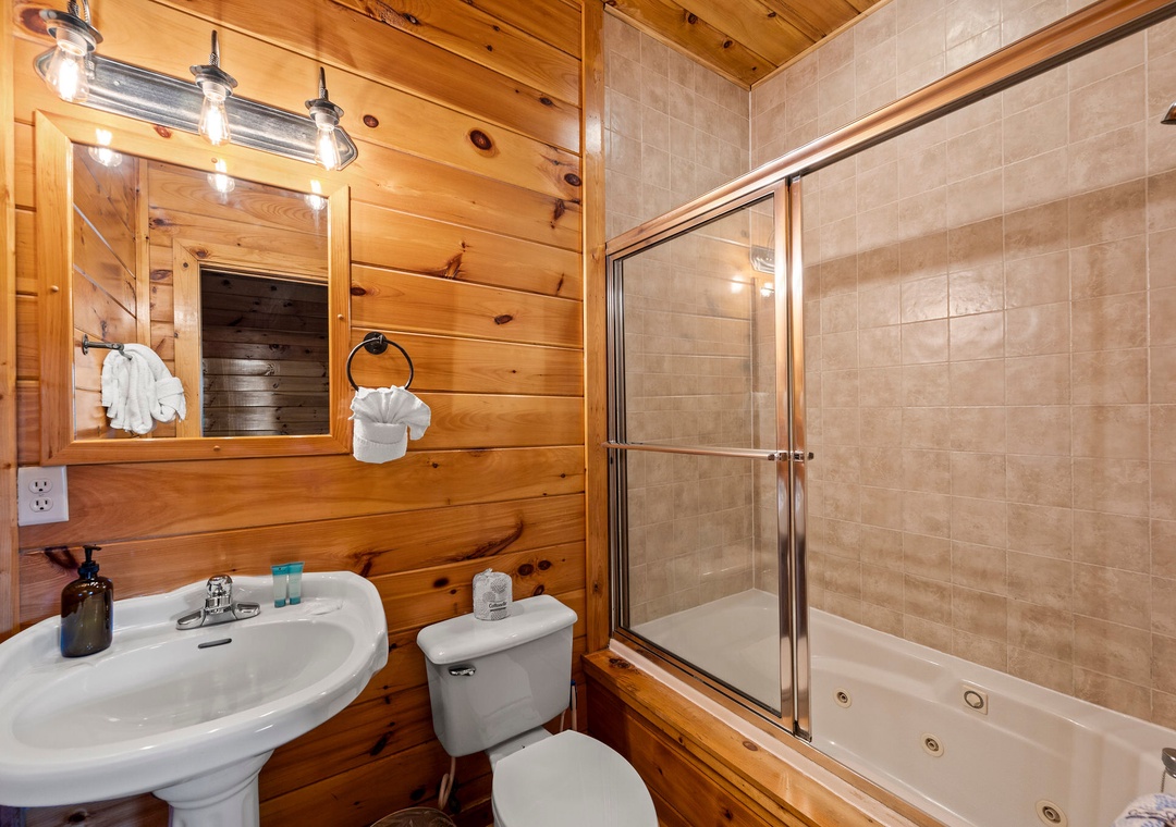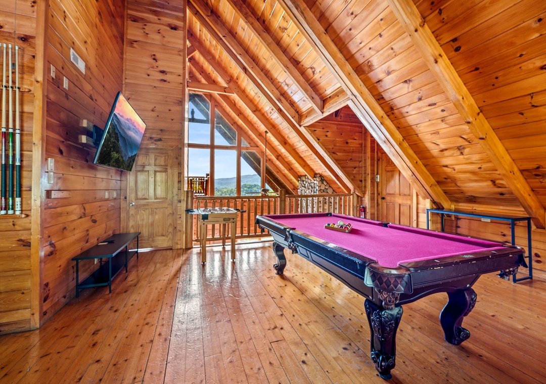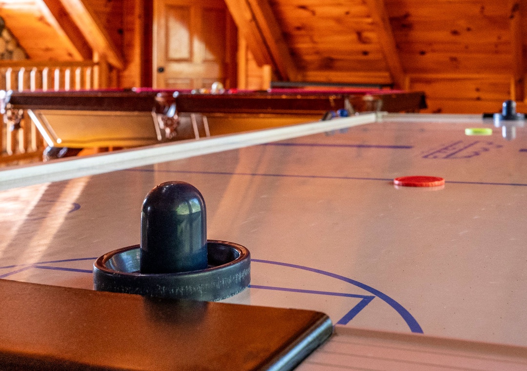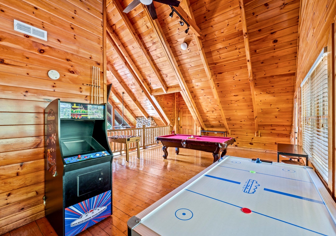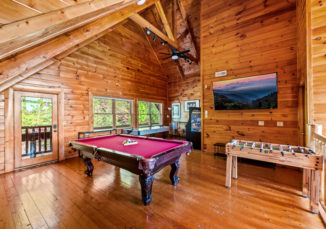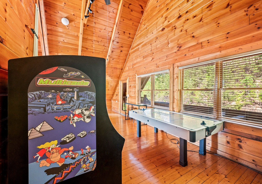 From the moment you step inside “Cades Cove,” you'll be captivated by the array of entertainment options that await, promising endless fun and excitement for guests of all ages. The centerpiece of the entertainment experience lies in the sprawling game room, a vibrant hub of activity where friendly competition and laughter abound. Test your skills on the air hockey table, showcase your finesse on the foosball table, and lose yourself in the pixelated adventures of retro favorites in the multicade arcade. But the entertainment doesn't end there. A sleek pool table also awaits. After an exhilarating day of play, retreat to the two inviting hot tubs offering sweeping views of the landscape and providing private oases under the star-studded sky. Immerse yourself in the soothing warmth of the bubbling water, as the stress of the day melts away and you're enveloped in pure relaxation. With abundant entertainment options and luxurious amenities at your fingertips, our lodge offers the perfect blend of excitement, relaxation, and rejuvenation, ensuring that your mountain getaway is nothing short of unforgettable.