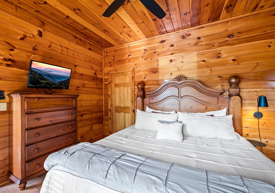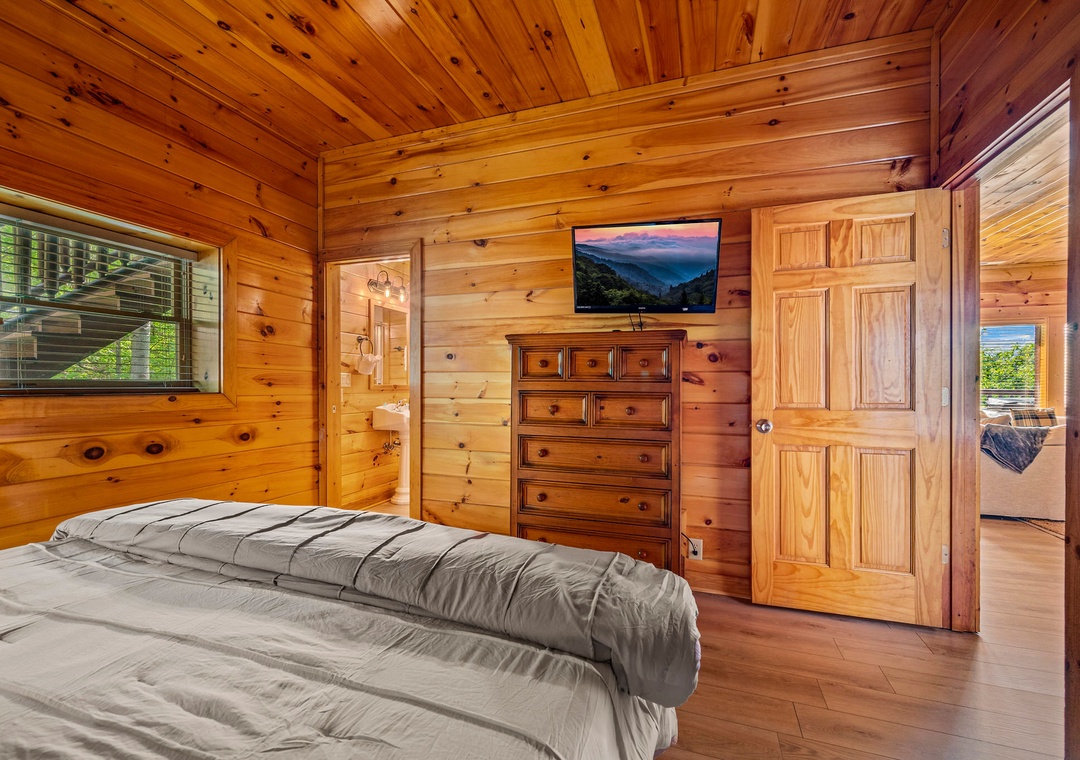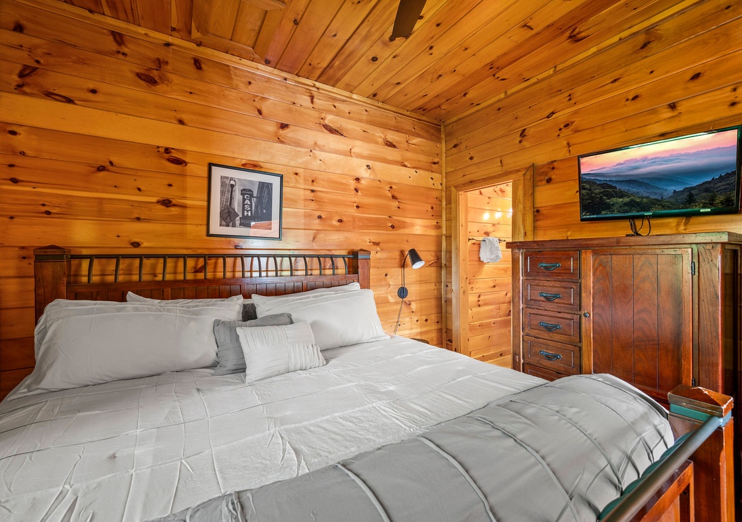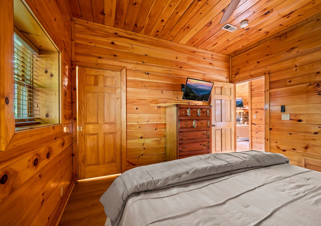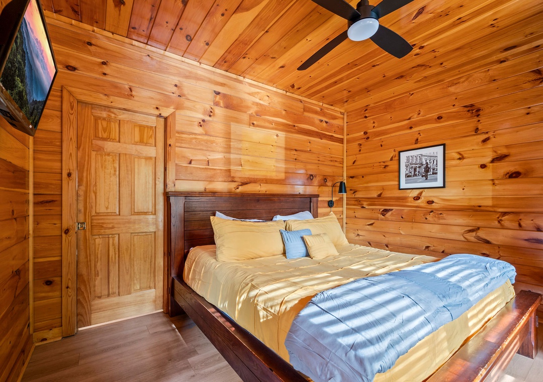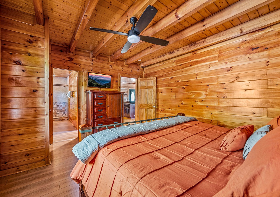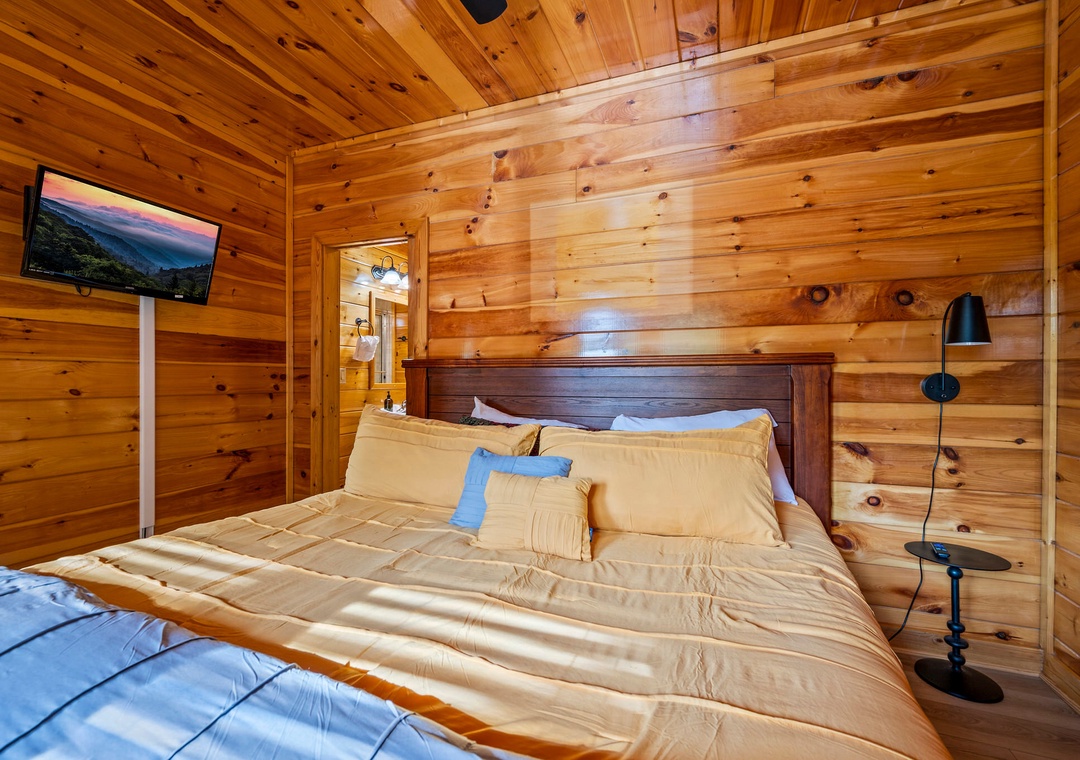 ✔ Bedroom #2 (Main Level): Cozy Bedroom with a King-sized Bed and Flat-screen TV; Attached Full Bathroom with Stand-Up Shower