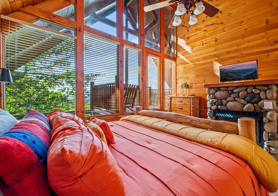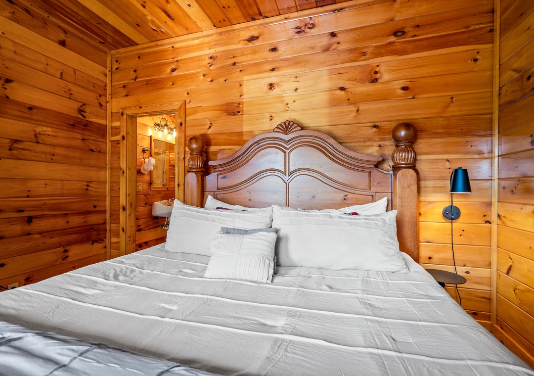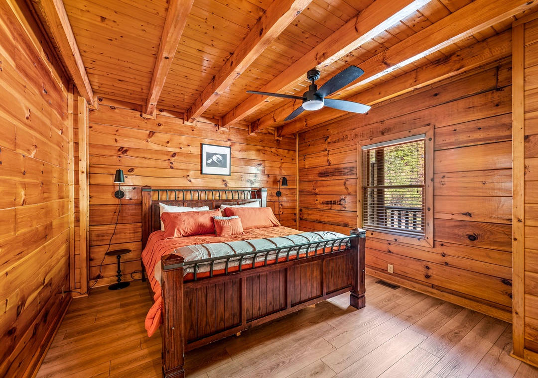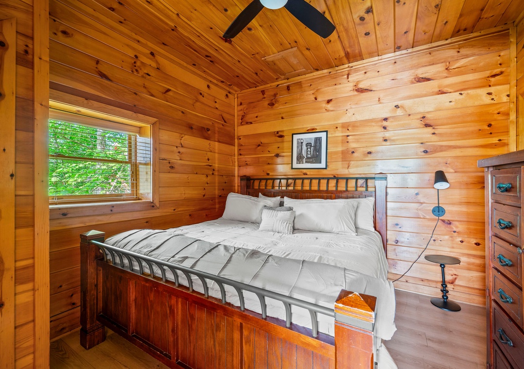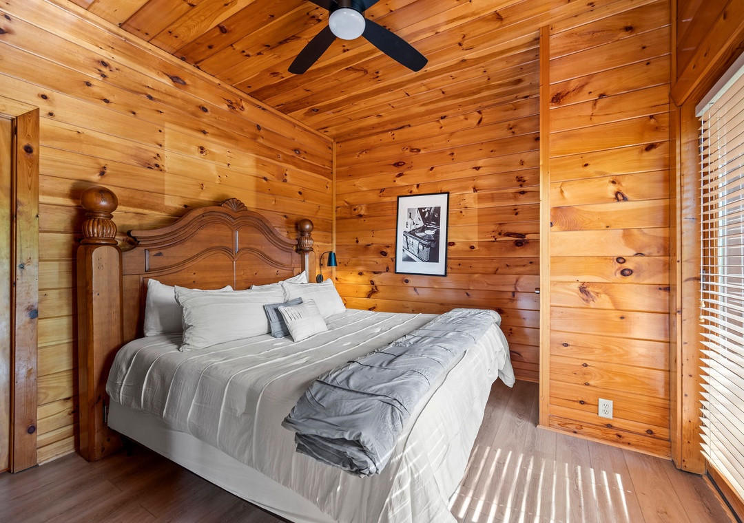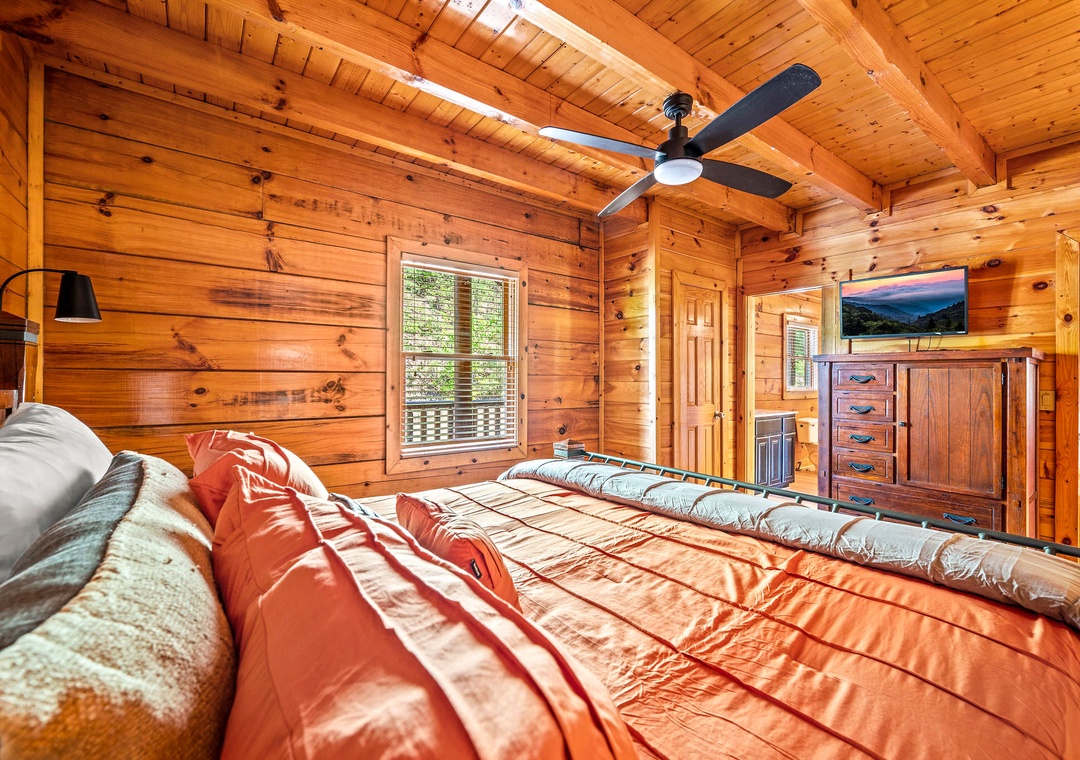 ✔ Bedroom #2 (Main Level): Cozy Bedroom with a King-sized Bed and Flat-screen TV; Attached Full Bathroom with Stand-Up Shower