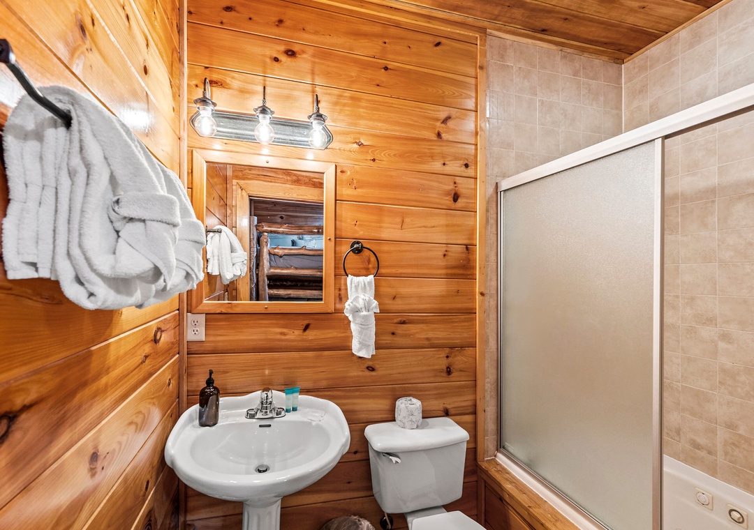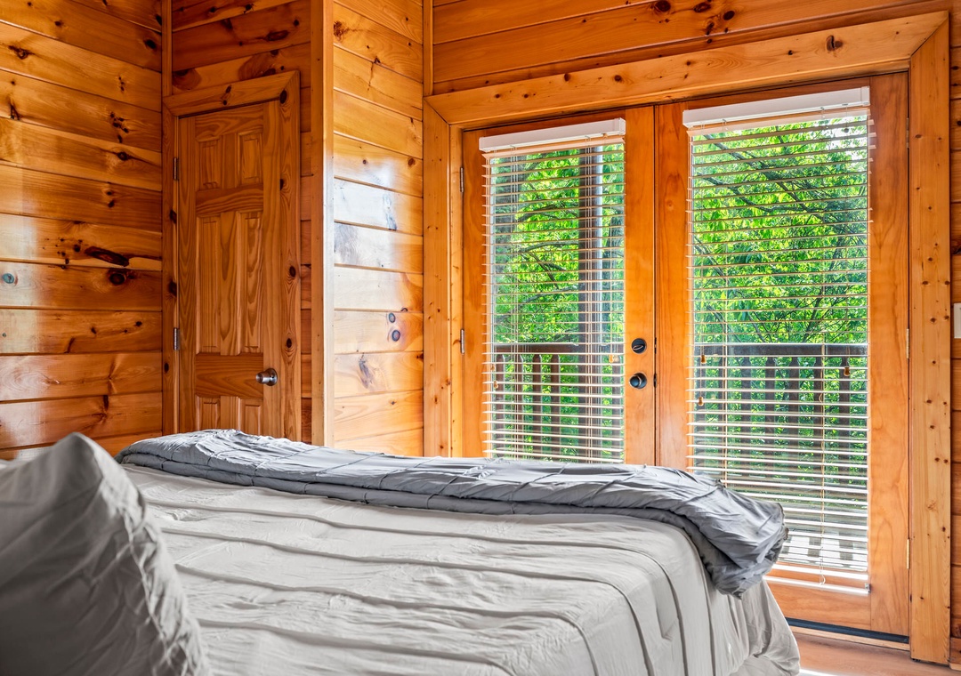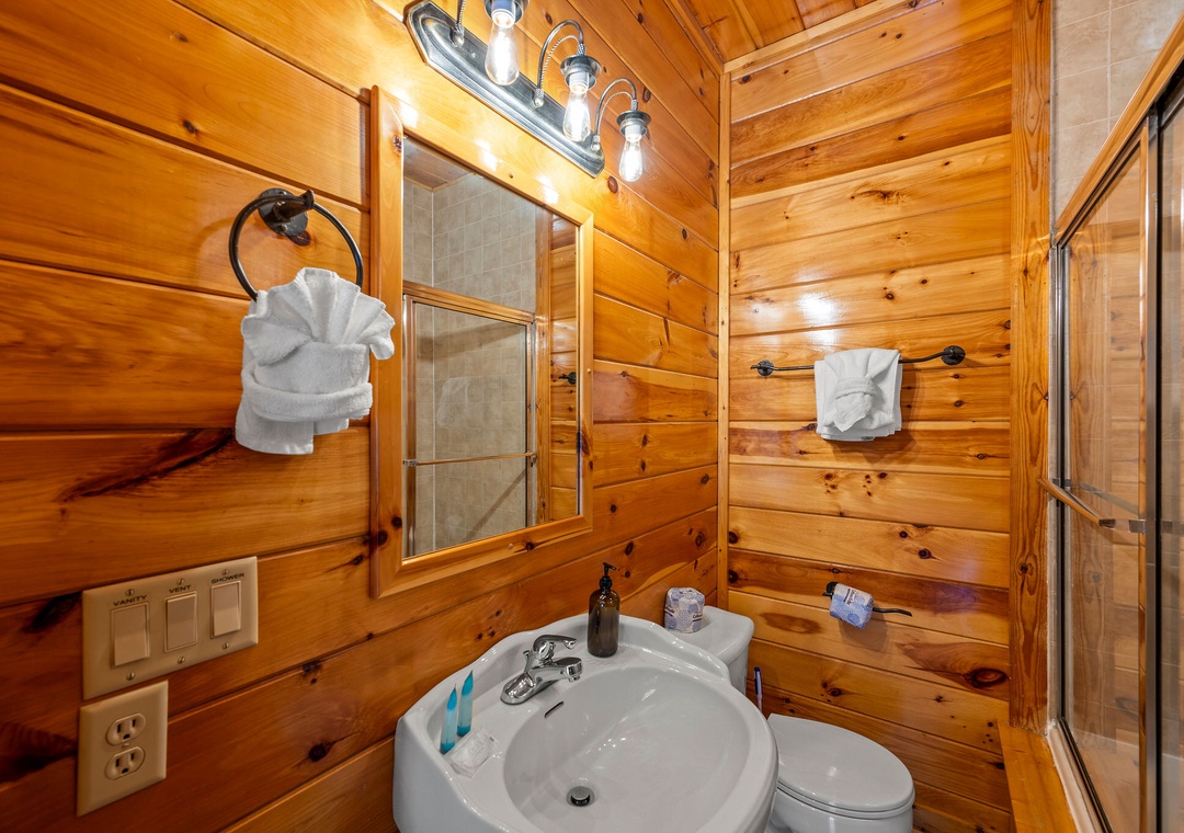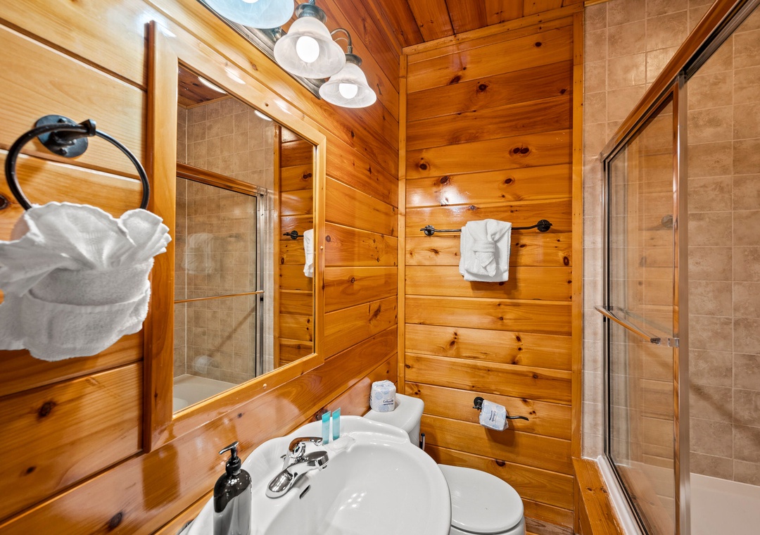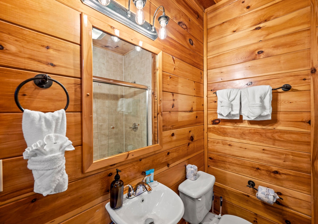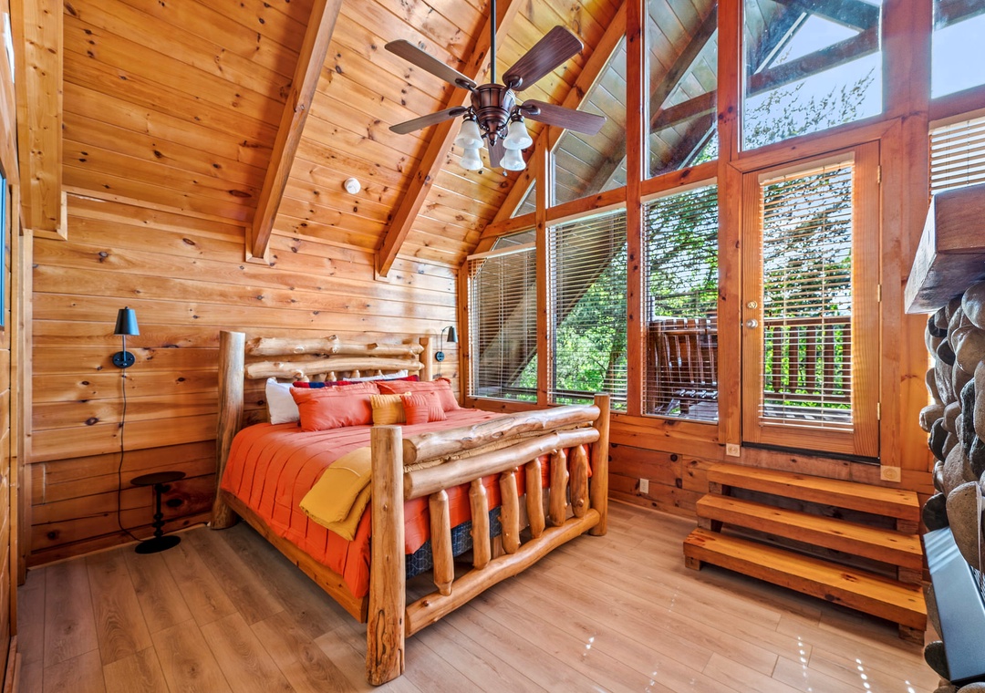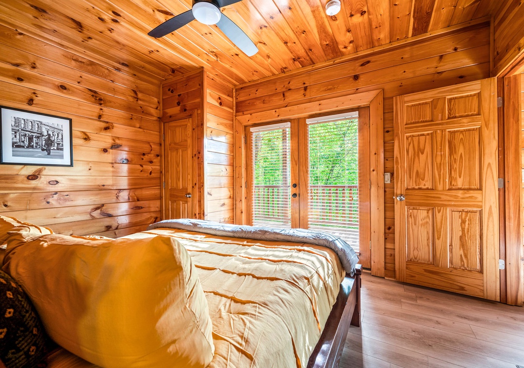 ✔ Bedroom #2 (Main Level): Cozy Bedroom with a King-sized Bed and Flat-screen TV; Attached Full Bathroom with Stand-Up Shower