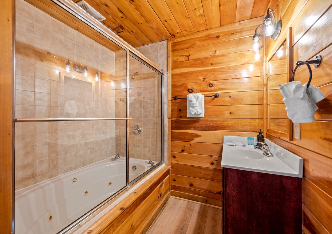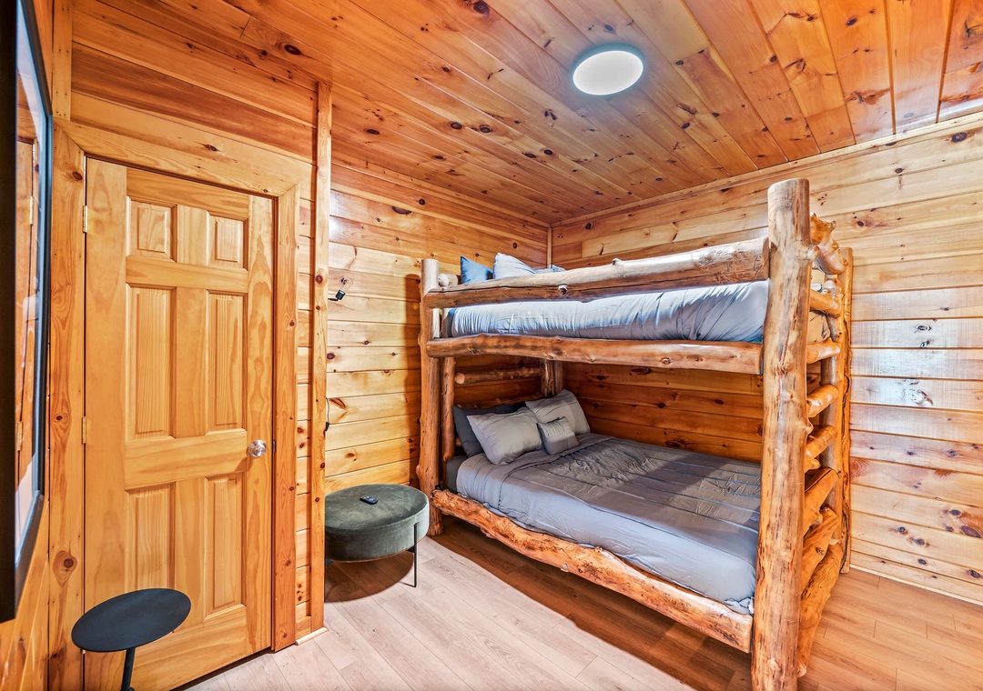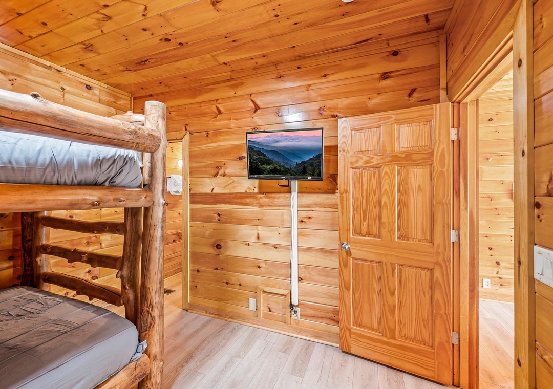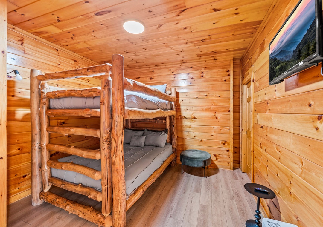 ✔ Bedroom #7 (Fourth Level): Cozy Bedroom with a Queen-over-Queen Bunk Bed and Flat-screen TV; Attached Full Bathroom with Shower/Jacuzzi Tub Combo