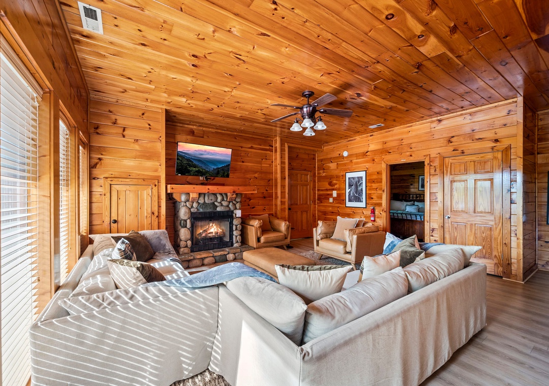 The interior of “Cades Cove” boasts an open-concept design, where expansive living spaces flow effortlessly into one another, creating an inviting environment for gathering with loved ones. Towering ceilings soar overhead, accentuating the sense of space and airiness, while oversized windows frame sweeping views of the misty peaks, inviting the beauty of nature indoors. The inviting living area boasts plush sofas which beckon you to sink into their embrace and unwind beside the crackling fireplace. Adjacent to the living area lies the gourmet kitchen where aspiring chefs can indulge their passion for cooking. You’ll also find a spacious dining area, with a large table set against a backdrop of mountain views, creating an idyllic setting for sharing meals and creating lasting memories. After a day of adventure, retire to the comfort of one of the cabin's eight luxurious bedrooms, each thoughtfully appointed with sumptuous furnishings and plush bedding to ensure a restful night's sleep. Free WiFi is also available throughout the property.