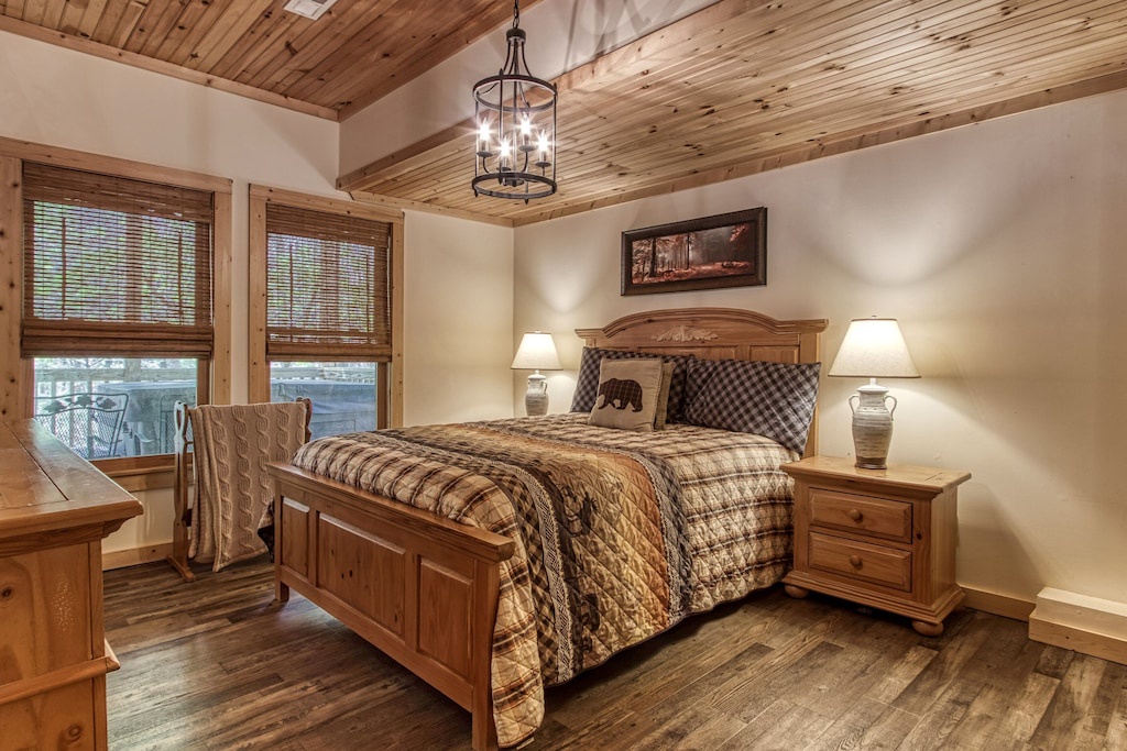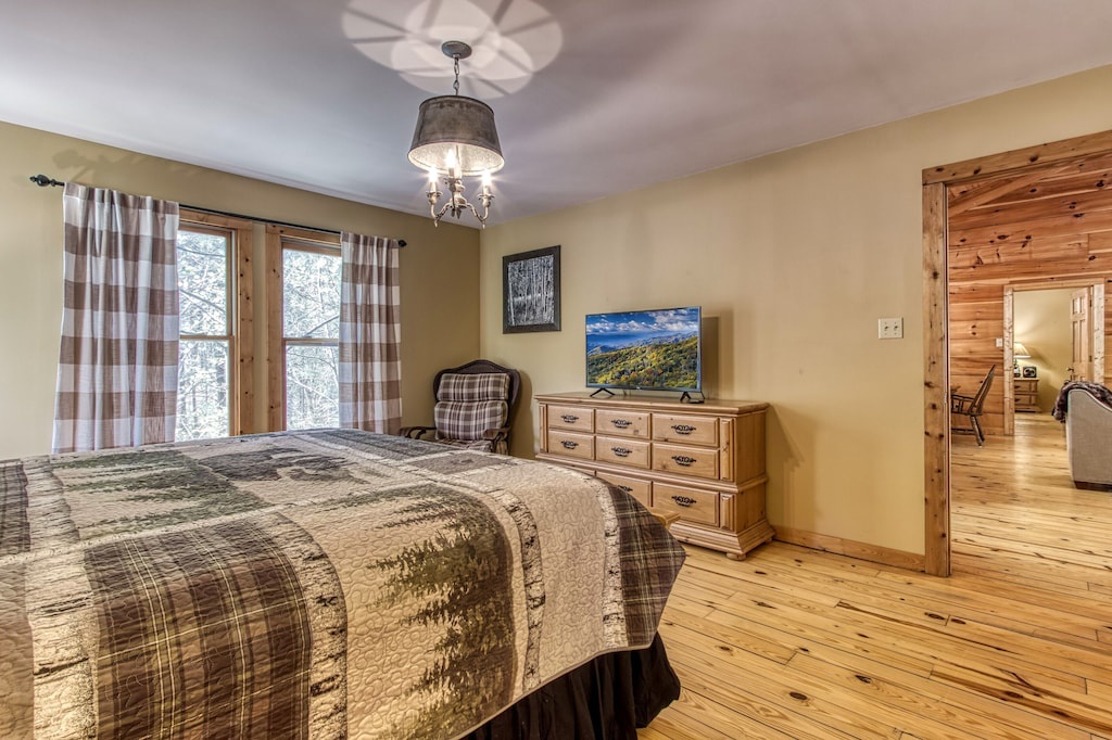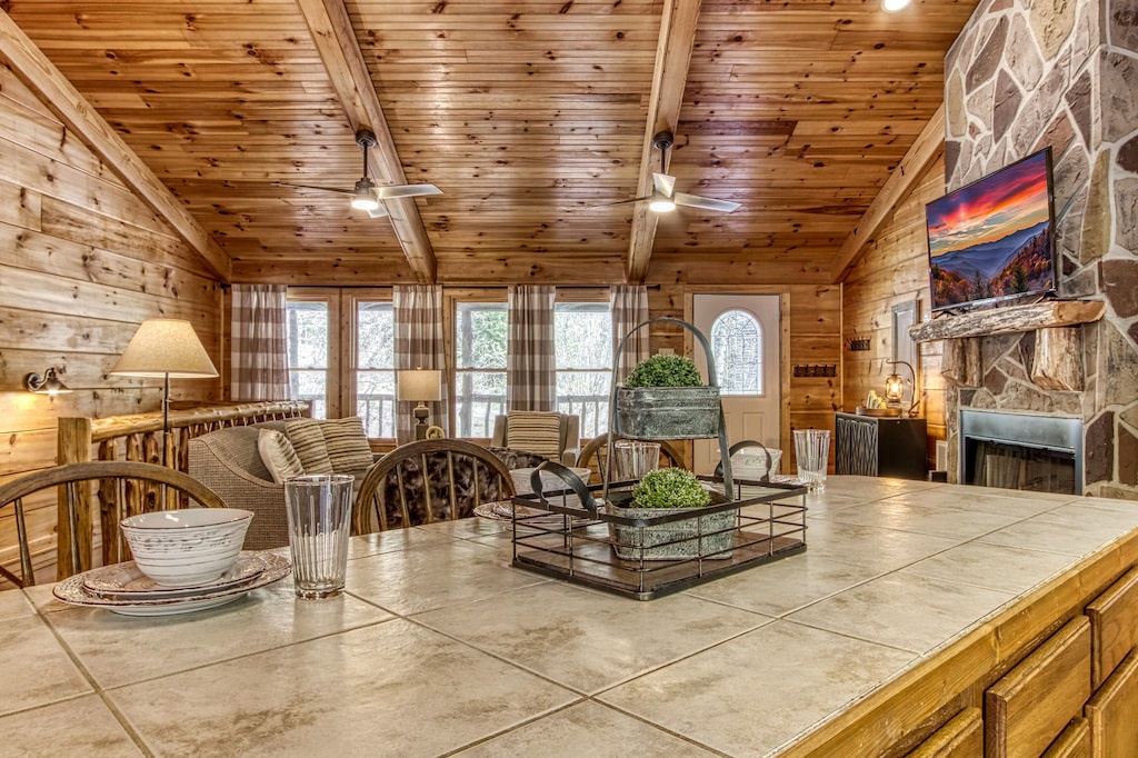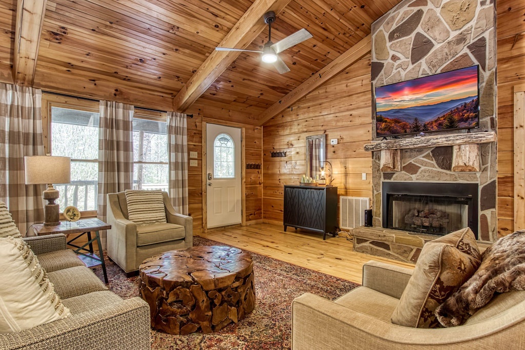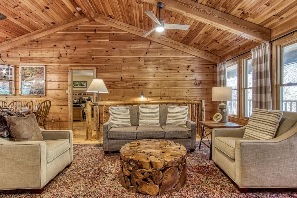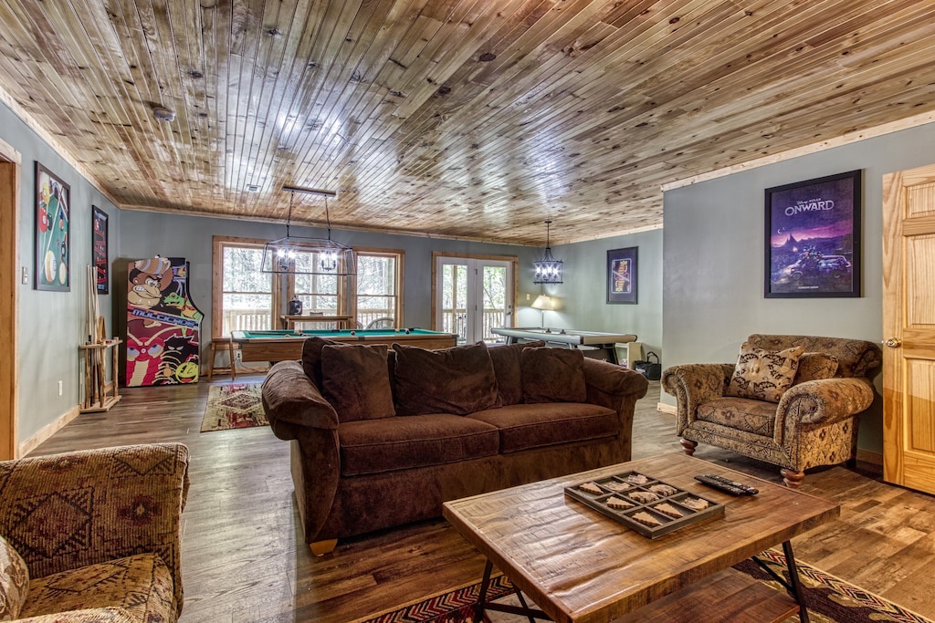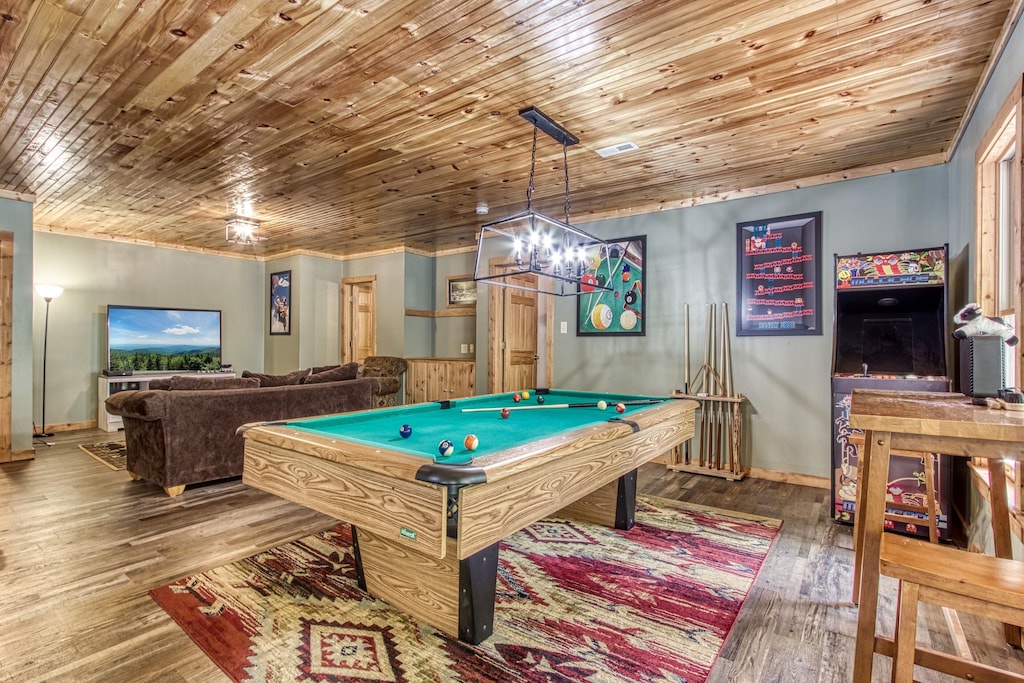 Newly furnished cabin, flat-screen smart TVs, gas fireplace for late-night snuggling, plush couches, large family room AND game room, pool table, arcade, air hockey, and views!