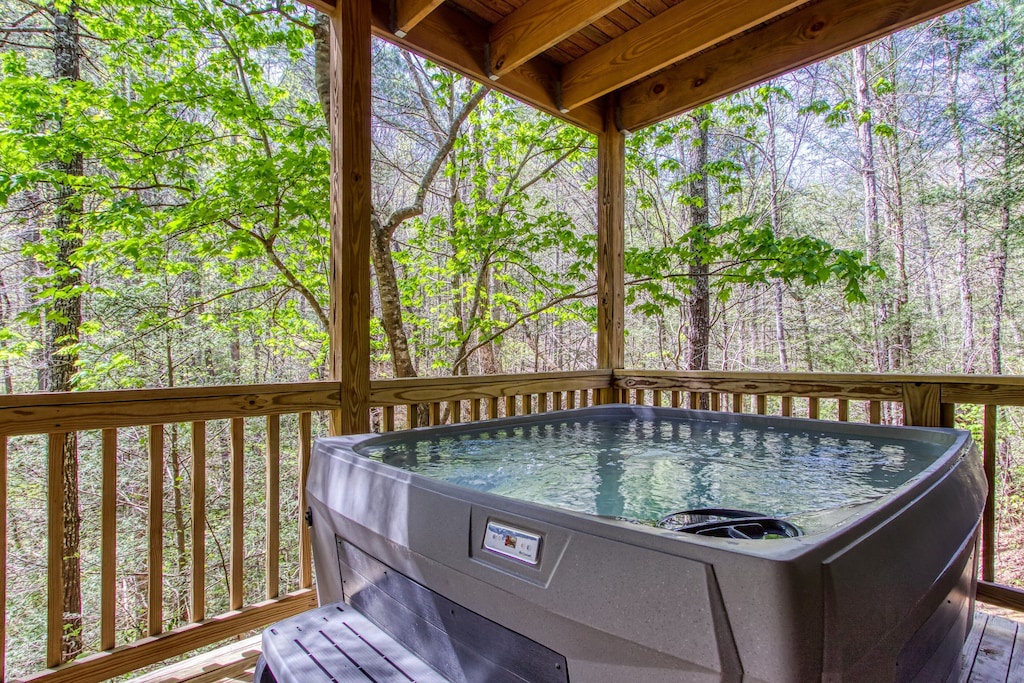 Beautiful wooded ; serene views, rocking chairs, outdoor park style charcoal grill, spacious and furnished deck and dining area. And of course a hot tub on the back deck, ready to help you relax after a long day of exploring!