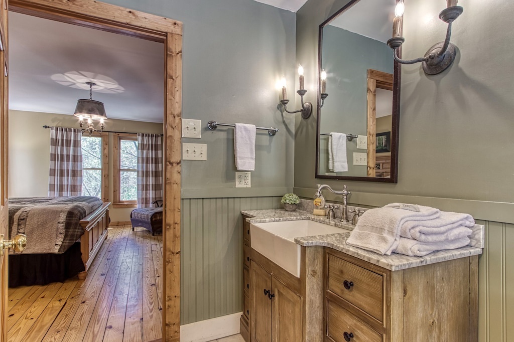 The two king bedrooms were on the main floor and the queen and bunk room were downstairs and shared a bathroom.